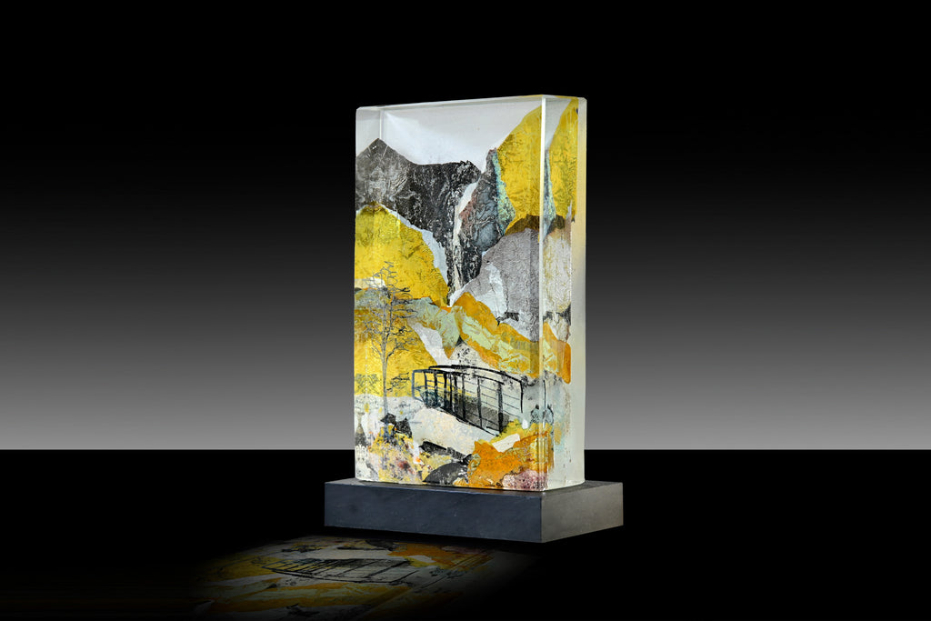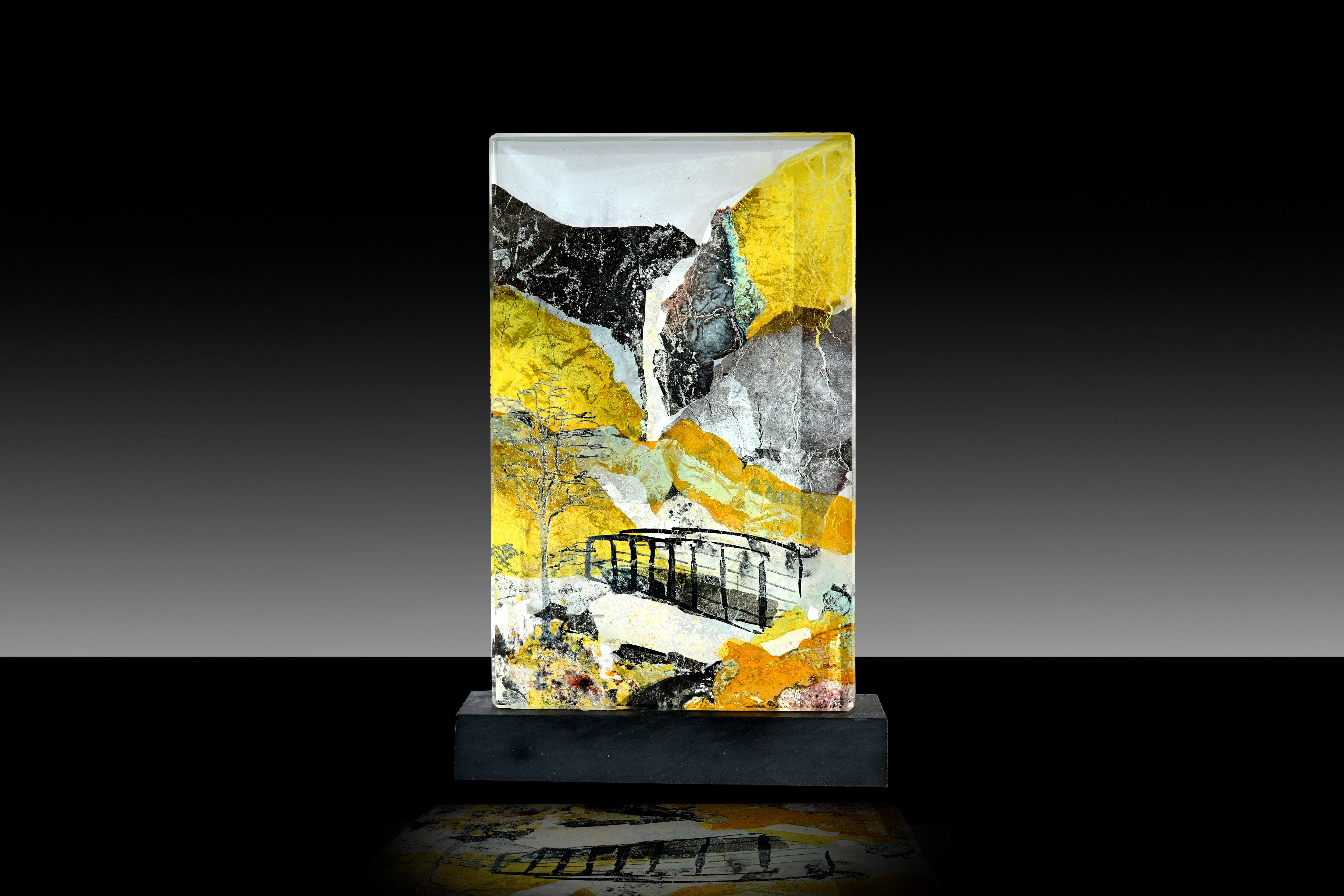 Kate’s recent work explores autumnal landscapes in Wales and the Lake District, with a particular focus on water in the Welsh images and Ennerdale in the Lake District. Using fused glass blocks layered with metal leaf, mica, oxides, and carbonates, she creates three-dimensional images that shift with light and perspective. Through experimentation with transparency and opacity, her works appear to move as the viewer passes, capturing the changing colours, moods, and rhythms of the landscape, and creating a contemplative dialogue between humanity, nature, and the seasons.