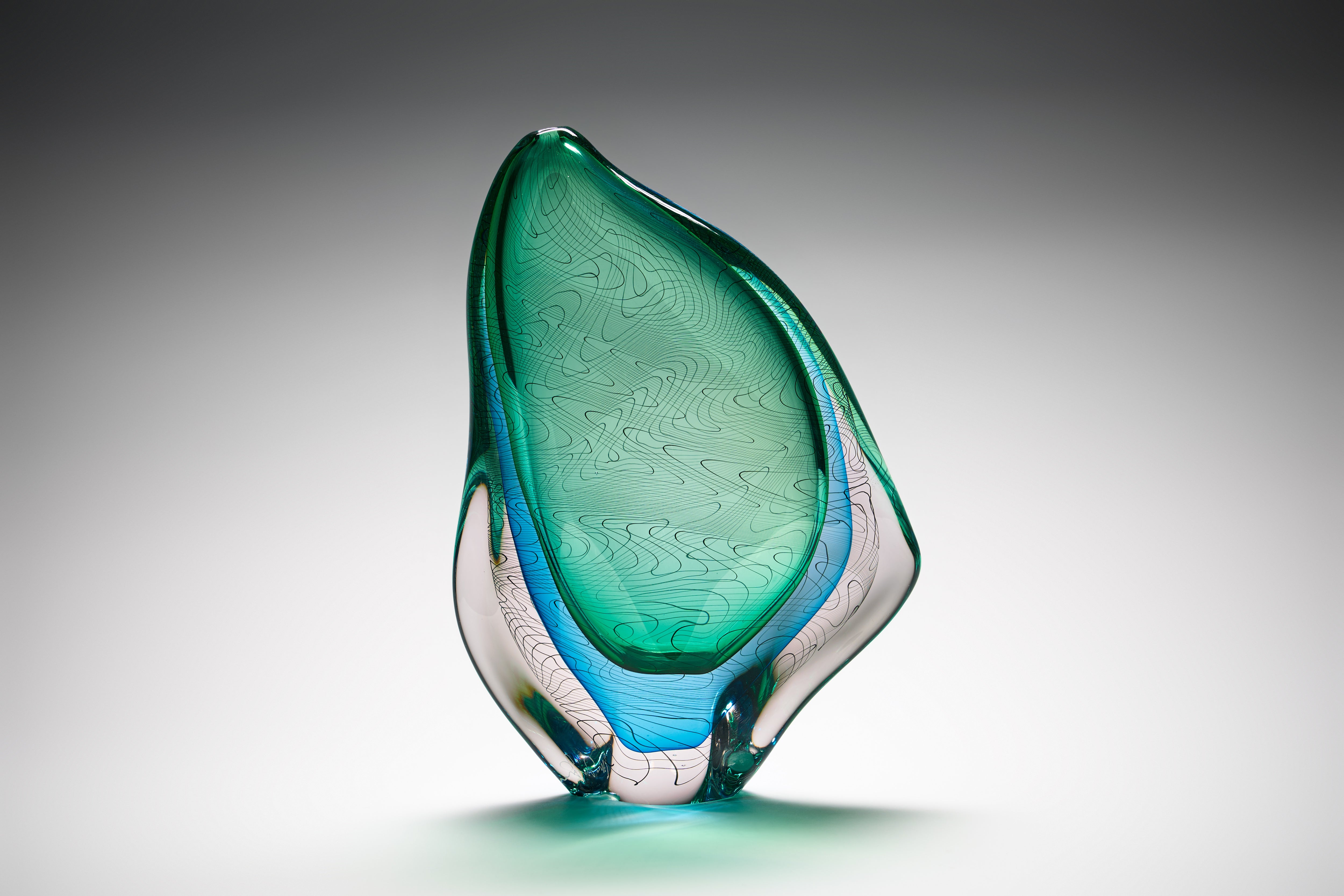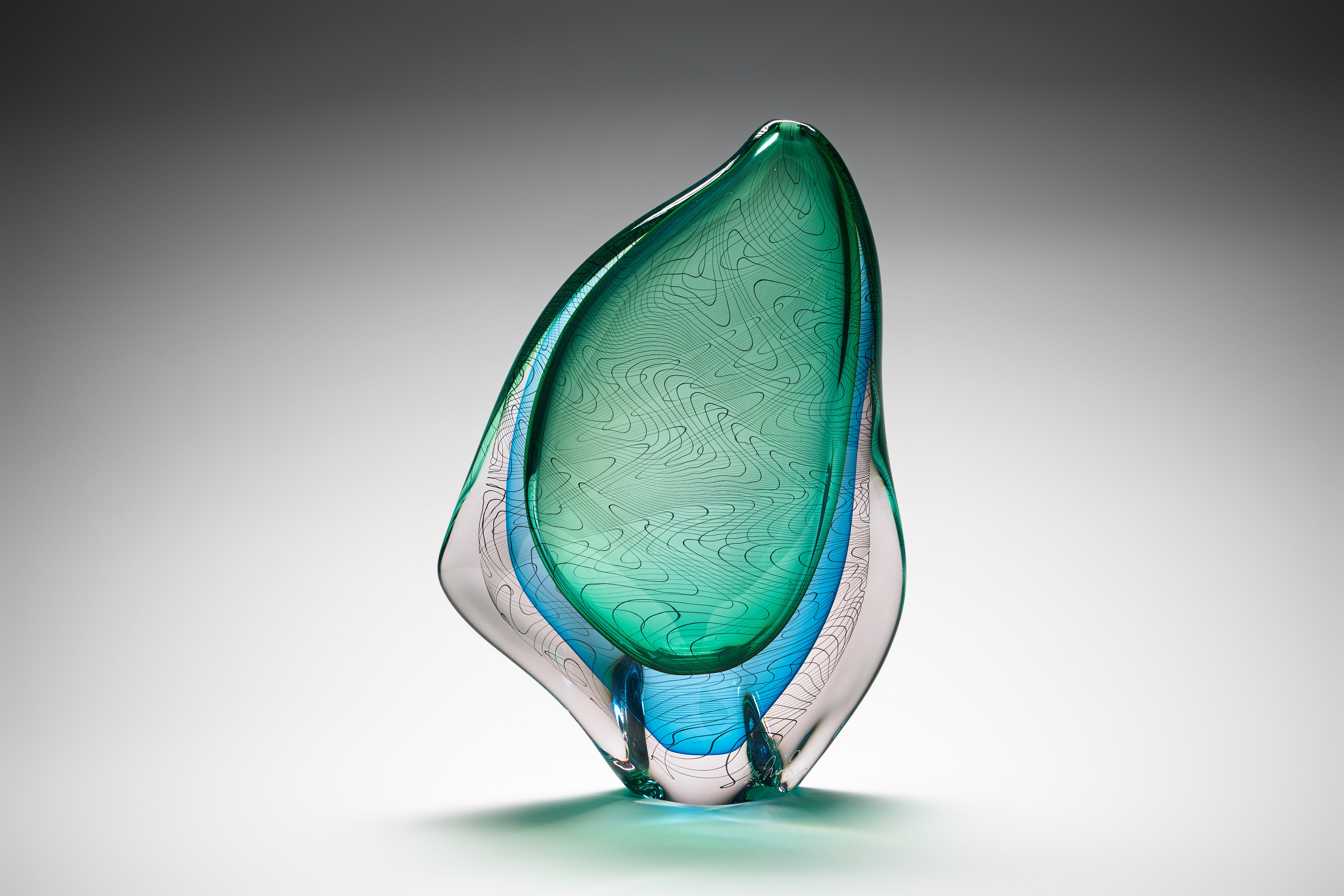 These captivating pieces from Peter’s Aurora series, draw inspiration from the breathtaking beauty of atmospheric phenomena like the Northern Lights. The interplay between soft transparent colour combinations contrast with Peter’s trademark use of bold, vibrant colour. Delicate internal netting, masterfully manipulated and stretched, adds to their overall dreamlike quality. Each piece is a testament to Peter’s exceptional skill and artistry, capturing the essence of nature’s most sublime phenomena in subtle, translucent glass.