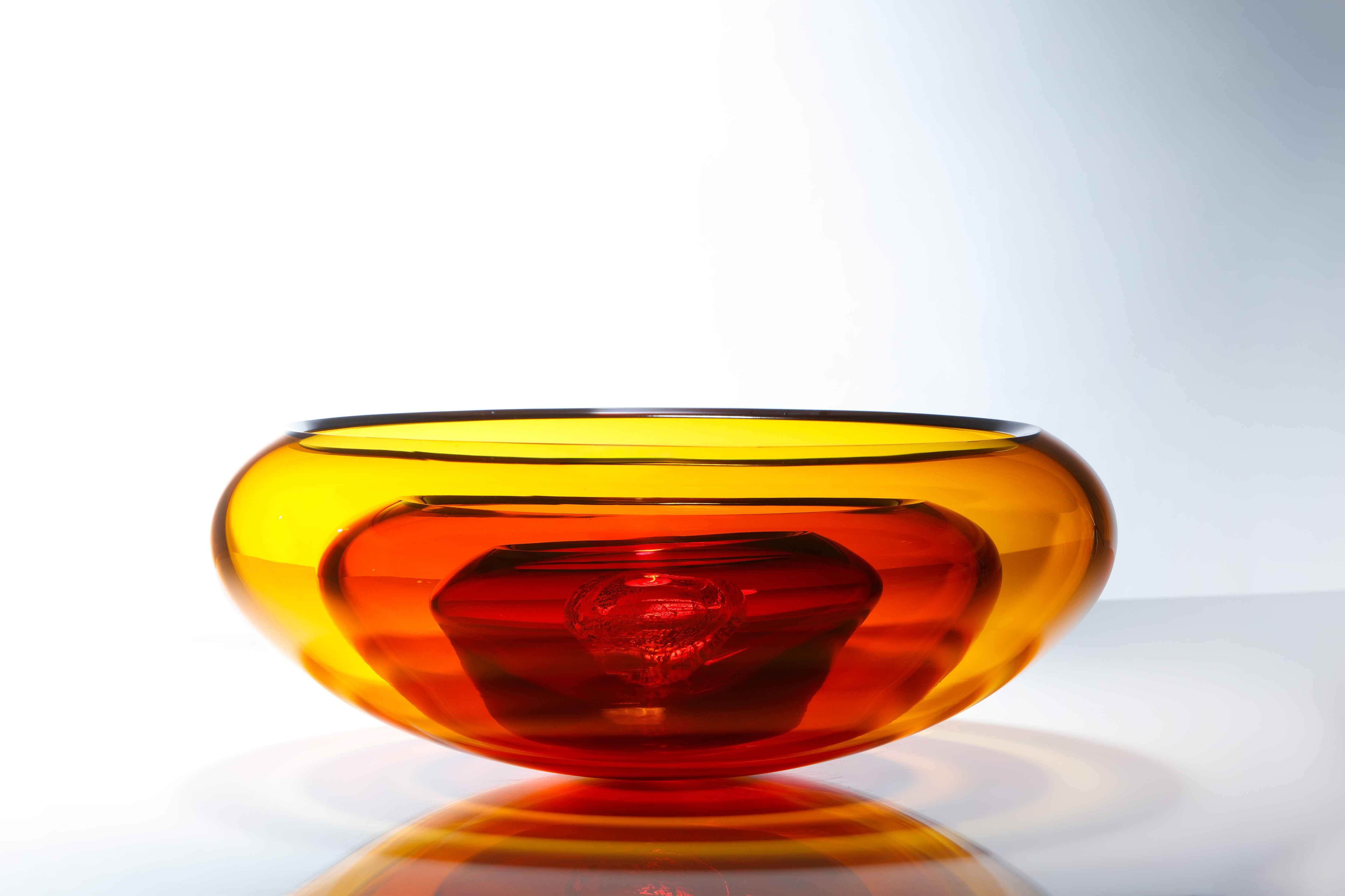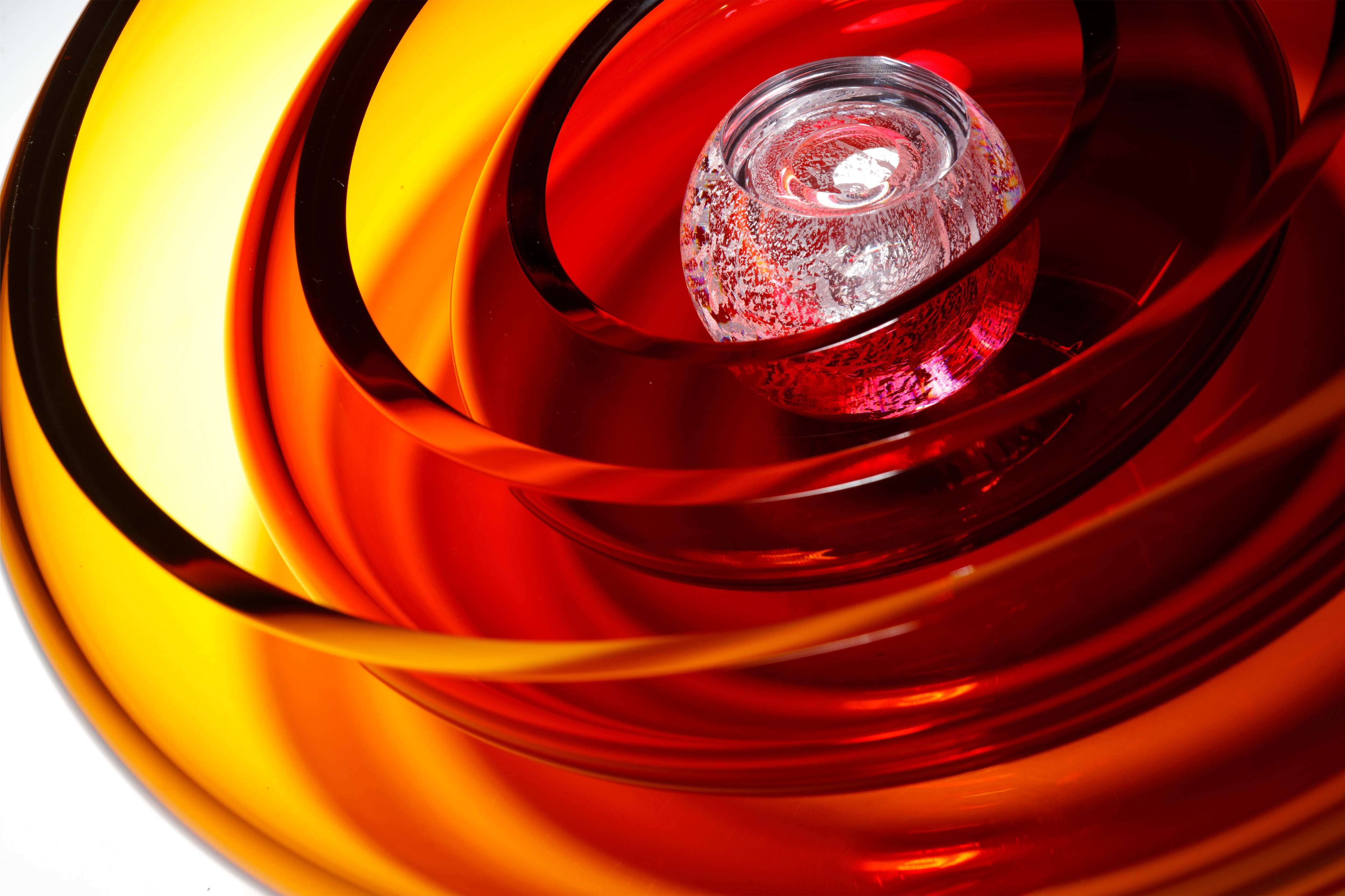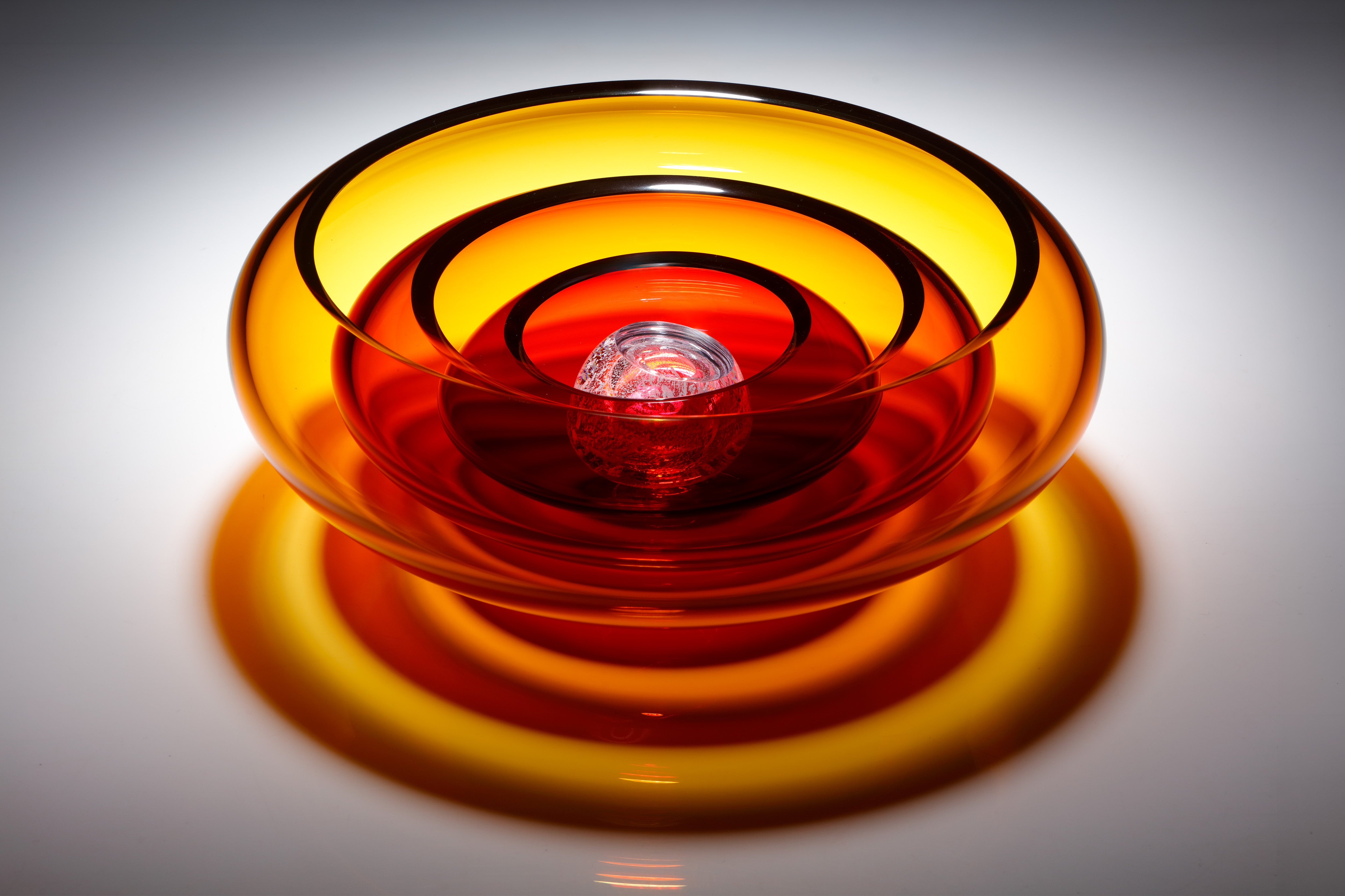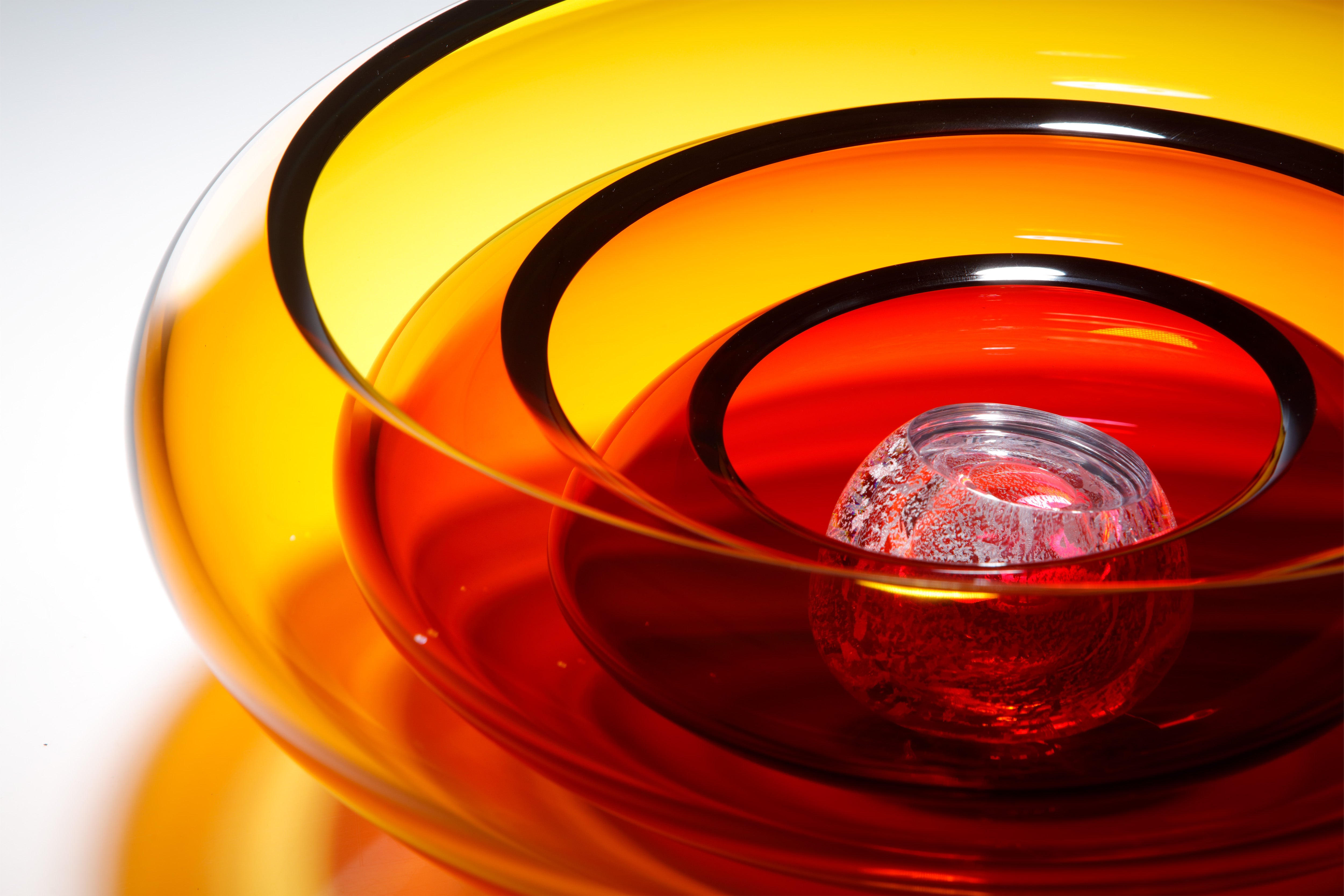 Bloom is inspired by the beauty and precision of nature, reflecting the delicate unfolding of a rose. Three elegantly crafted glass bowls nest within each other, mirroring the layered formation of petals as they progress from bud to full bloom. Each layer represents a different stage in the flower’s life, capturing its transformation with grace and fluidity. At its centre lies a shimmering silver leaf ball, cradled within the petal-like forms. The warm glow of the silver leaf enhances the piece’s elegance, creating a sense of depth and harmony. With its interplay of transparency and texture, Bloom celebrates fragility and resilience.