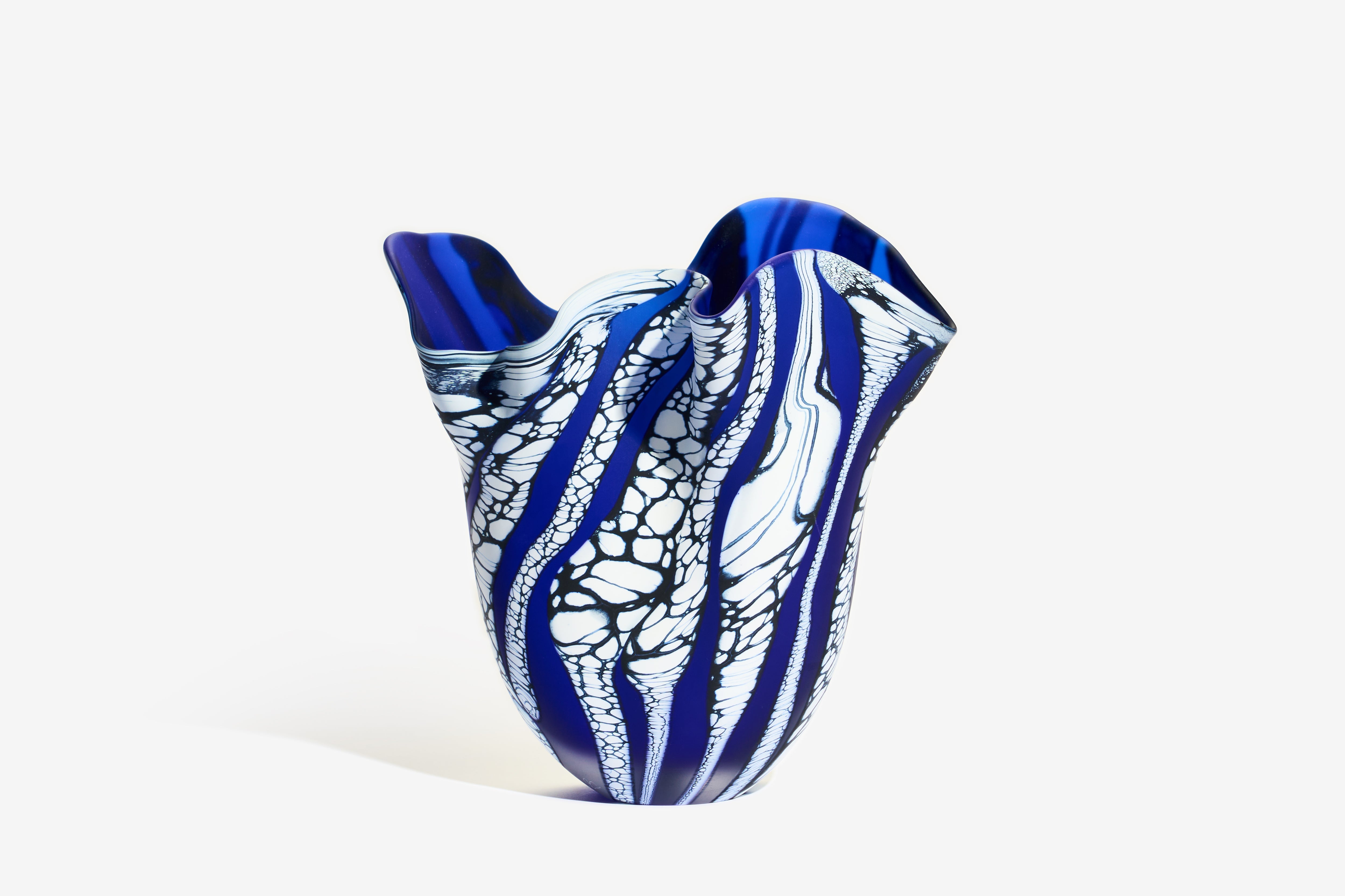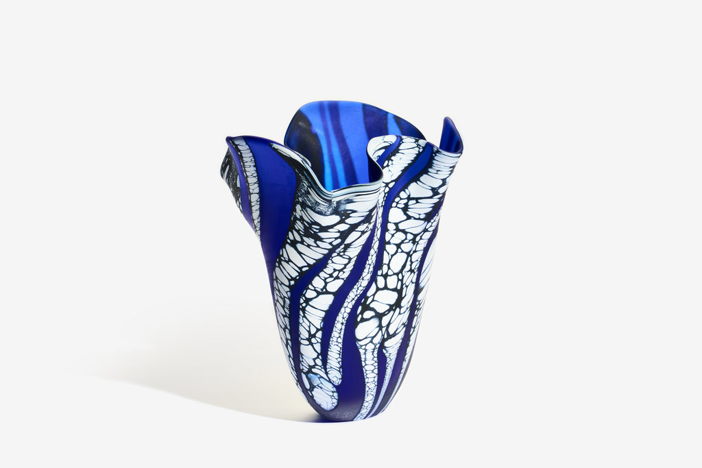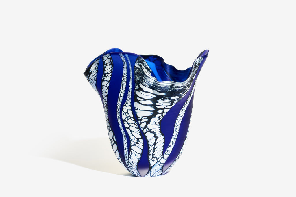 Glacier was inspired by Peter’s winter train journeys through Kent during the 1990s, where snow settled in layers over fields and hedgerows, and trees and bushes were silhouetted against pale grey skies. Fascinated by the graphic contrasts of black and white and the lacy effects of snow on branches, Peter developed a series with intricate textural composition. This latest iteration introduces a new colourway, incorporating crisp blues and icy tones, while etched surfaces enhance the silky, tactile quality. As with Kimono, the colours are applied to the exterior and etched, and flared shapes evoke both winter landscapes and glacial forms, capturing light, texture, and depth.