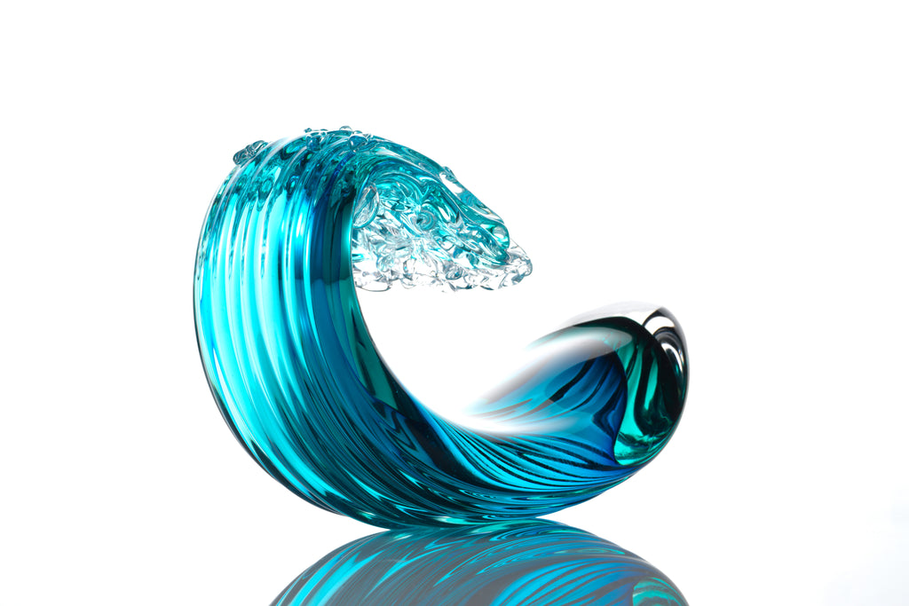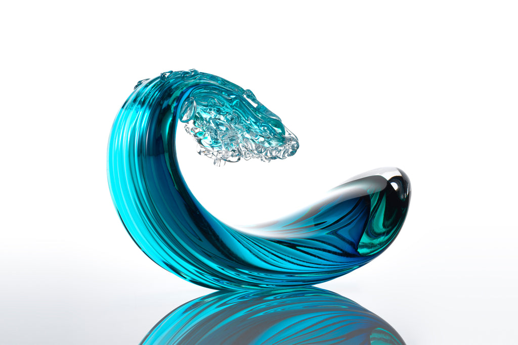Peter’s Carved Waves mark an important breakthrough in his creative process, uniting hot and cold working in a fresh and experimental way. Traditionally, Peter shaped molten glass by adding elements during the hot stage. In this new approach, he first creates a hotsculpted blank, which is then cooled and carved with diamond-impregnated wheels to cut deep furrows into the surface. The piece is subsequently reheated and transformed at the furnace, where it is worked into wave-like structures. This method of removing rather than adding creates striking optical effects, as light plays across the carved surfaces to produce rhythms that verge on the kinetic, suggesting both the power and perpetual motion of the sea.
