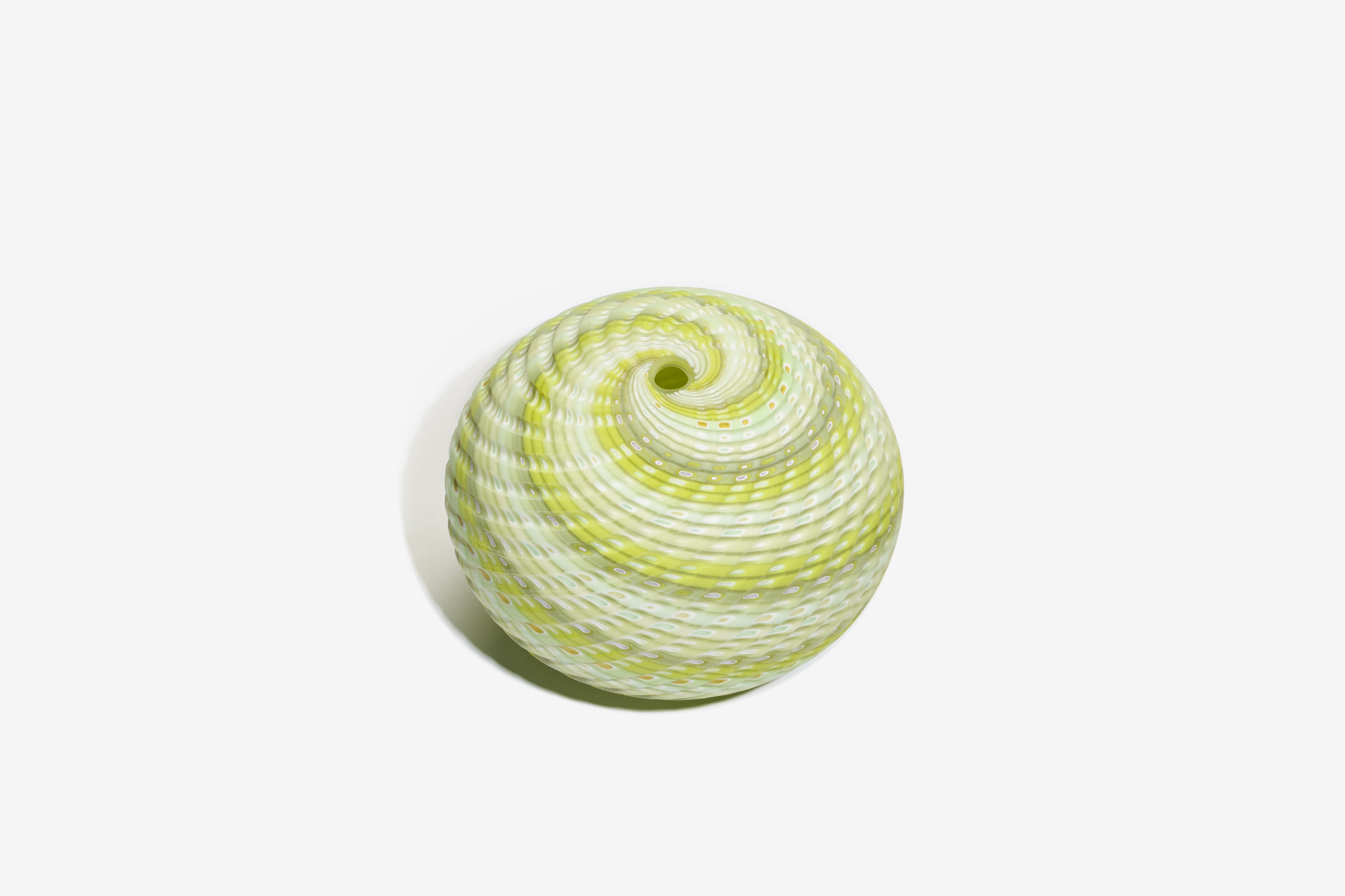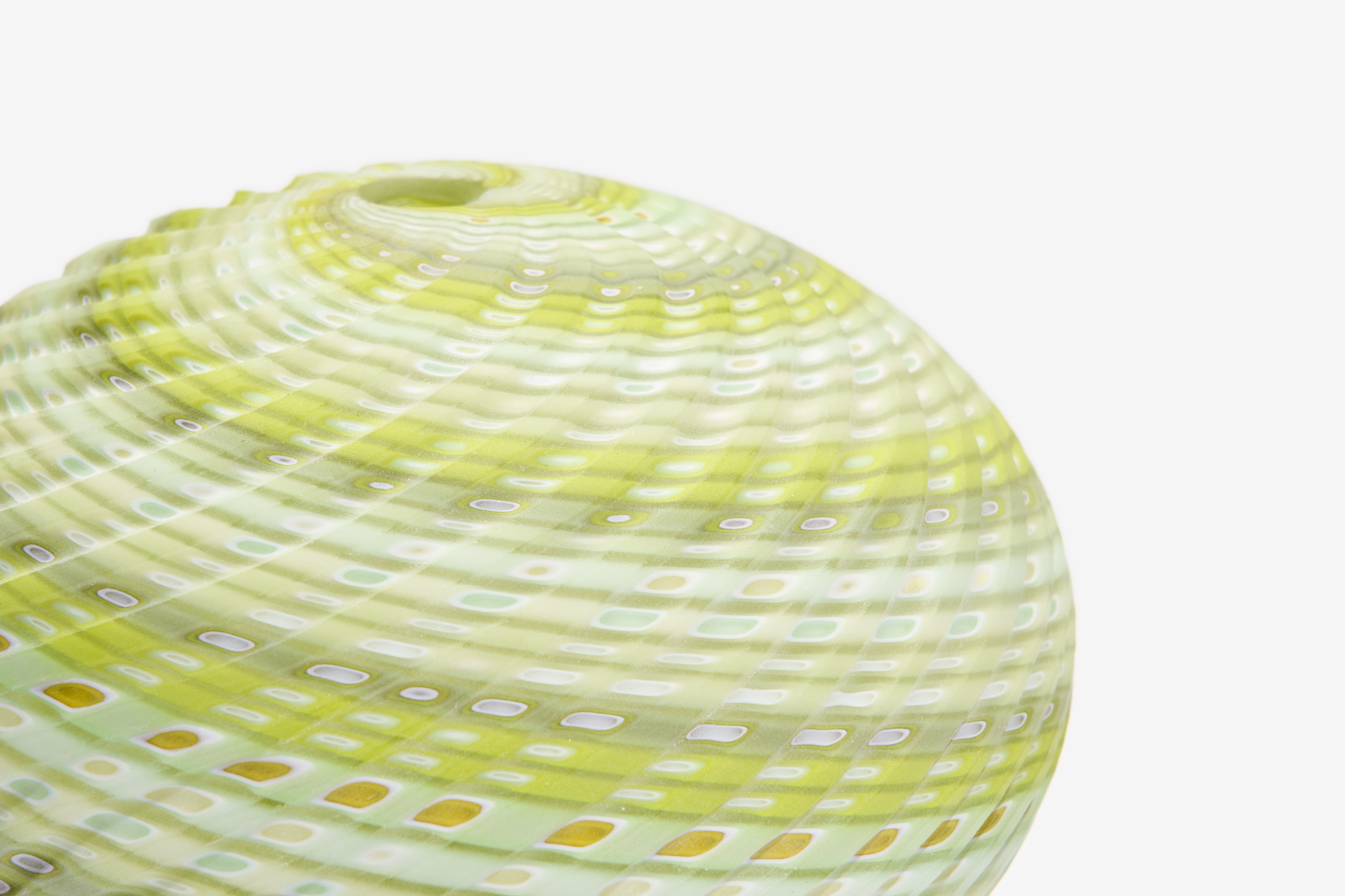 Layne’s Woven Forms are inspired by the Devon coastline and have been evolving for several years. This series of work is a result of intricate layering of different pre-made coloured canes around a molten form that is twisted and, when cold, cut into with a diamond wheel, to reveal vibrant colours beneath the surface. The effect is like water over precious stones or the rock with its glimmering colours beneath, reflecting natural growth and corrosion. Exclusively for Collect, Layne has introduced a new colourway in citron green.