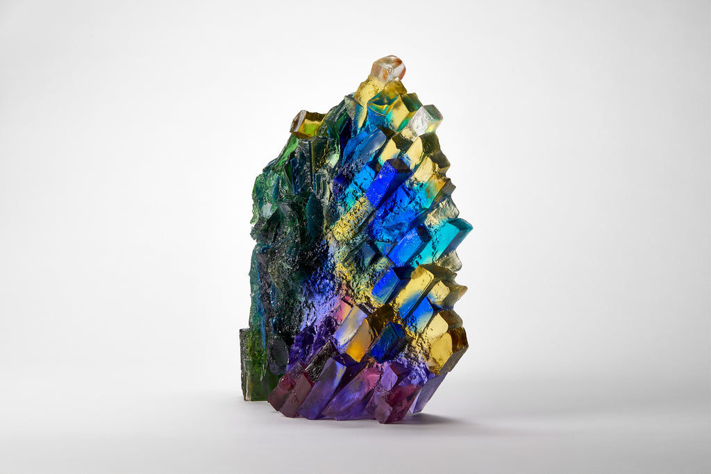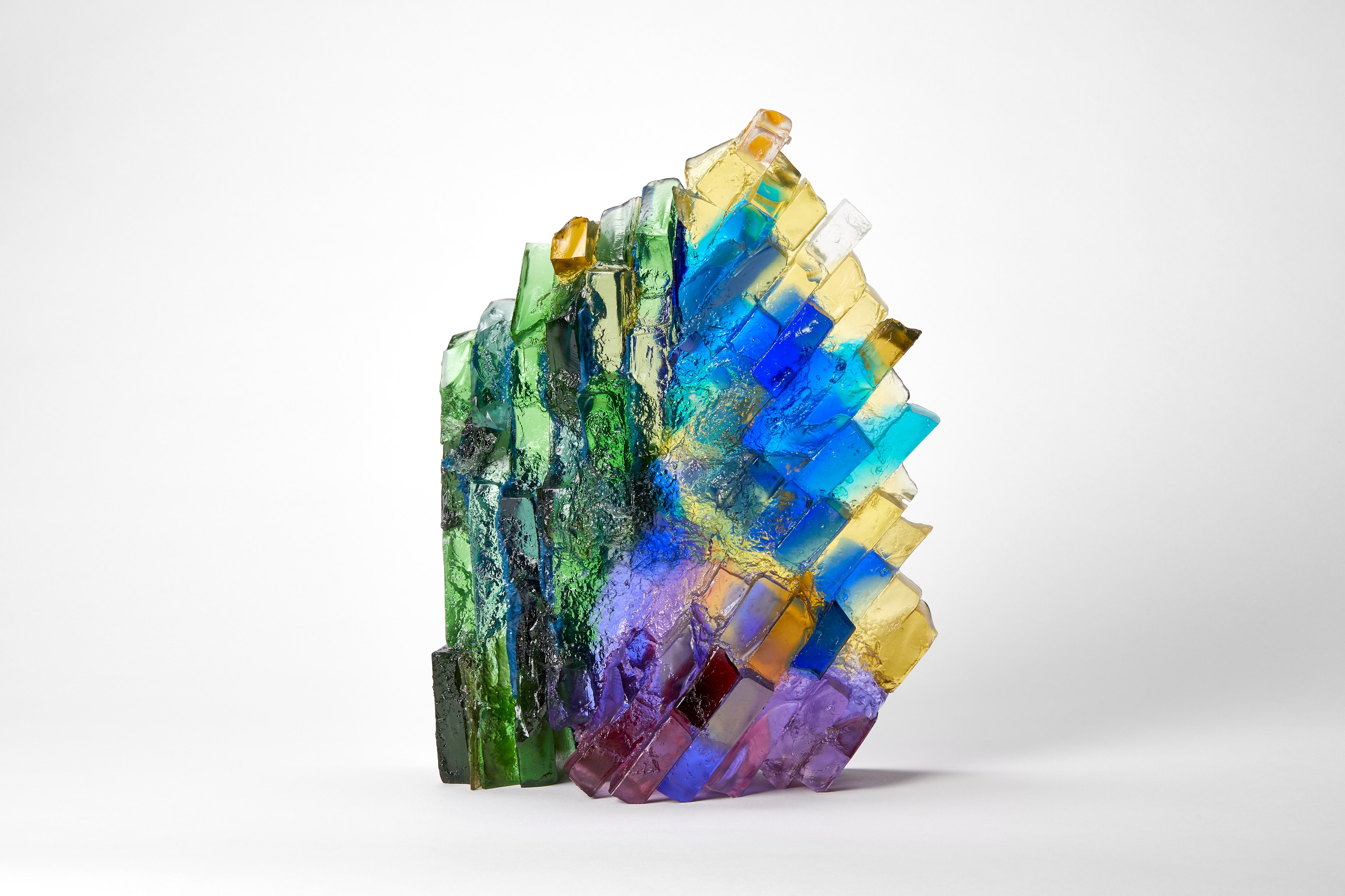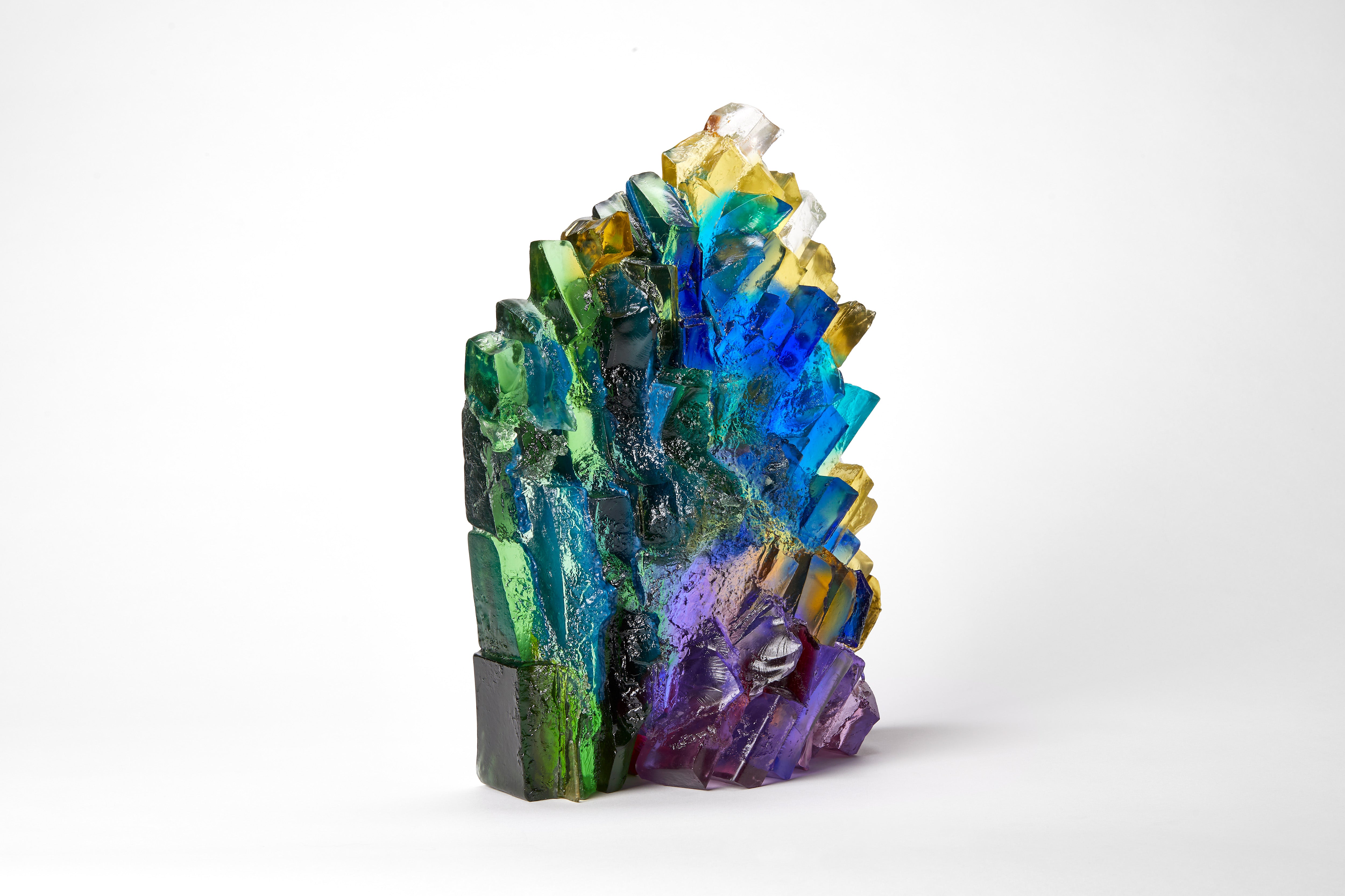 Forest Glade with Bluebells in Sunlight creates the illusion of sunlight through trees illuminating a woodland glade. Deborah builds sculptures using broken glass billets as her paint palette, constructing compositions that echo landscape surroundings. When the glass melts, colours merge creating watercolour effects, suggesting the softness of moss and grasses contrasted with defined rocky edges.