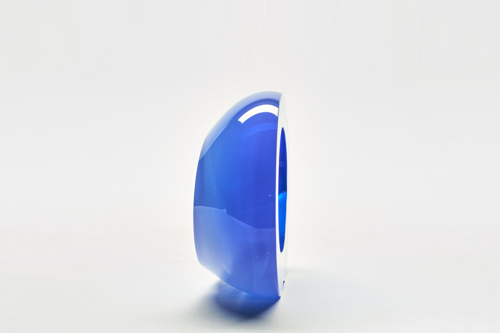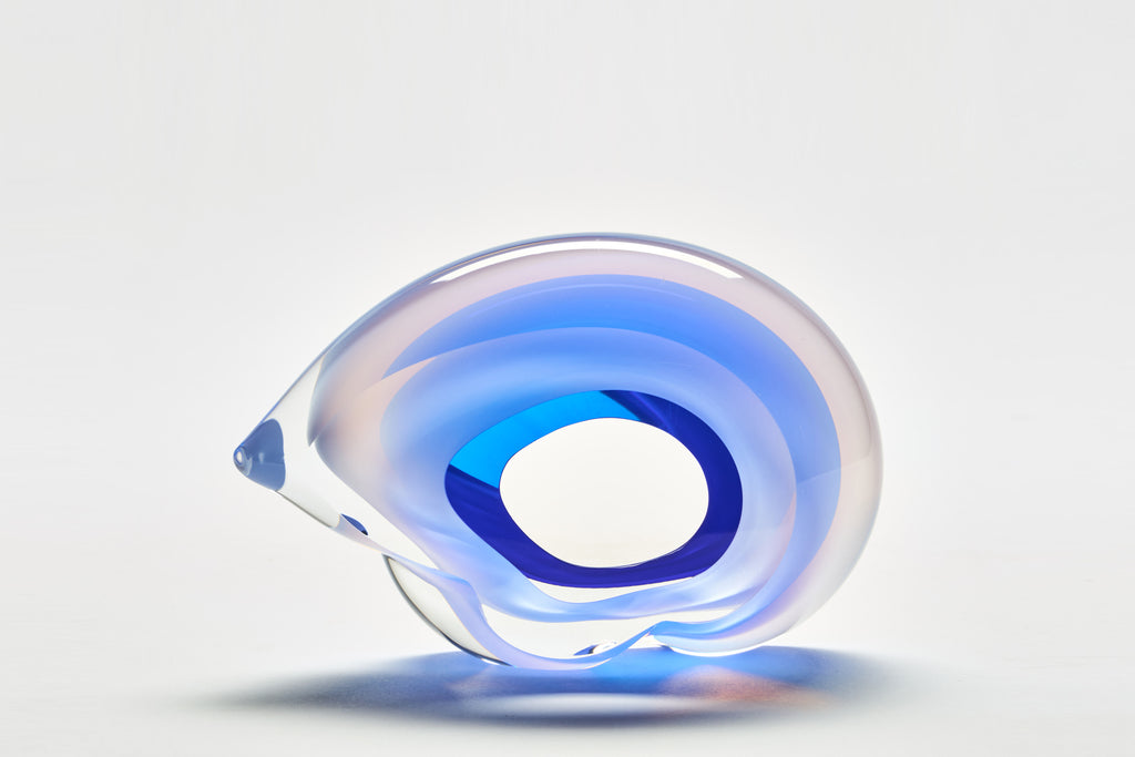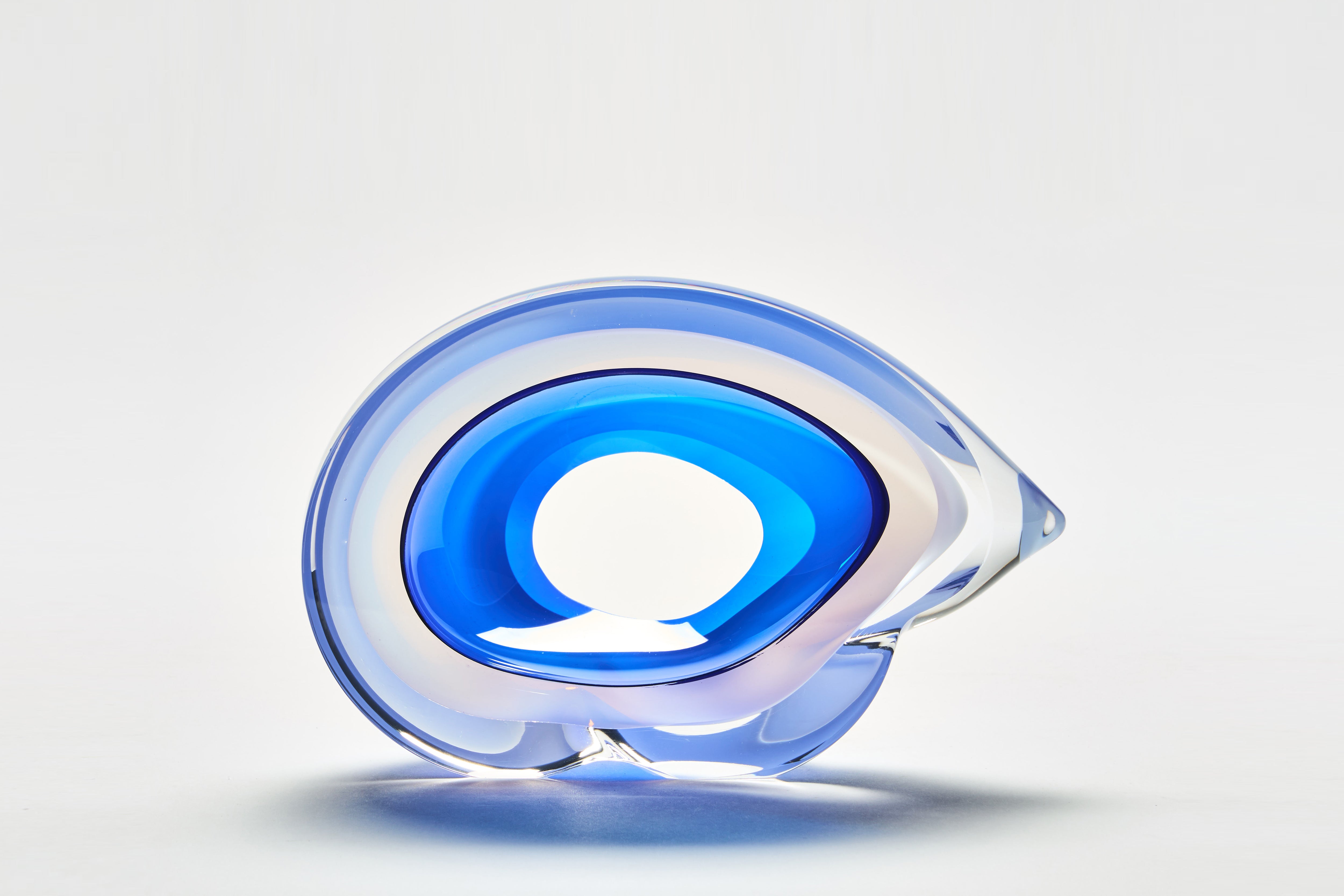 This elegant, organic glass sculpture featuring swirling layers of translucent blue hues evokes a whirlpool effect, drawing the eye inward towards the tranquil central aperture. Light dances through the pristine curves, creating an enchanting interplay of form and colour - a captivating fusion of art and craftsmanship.