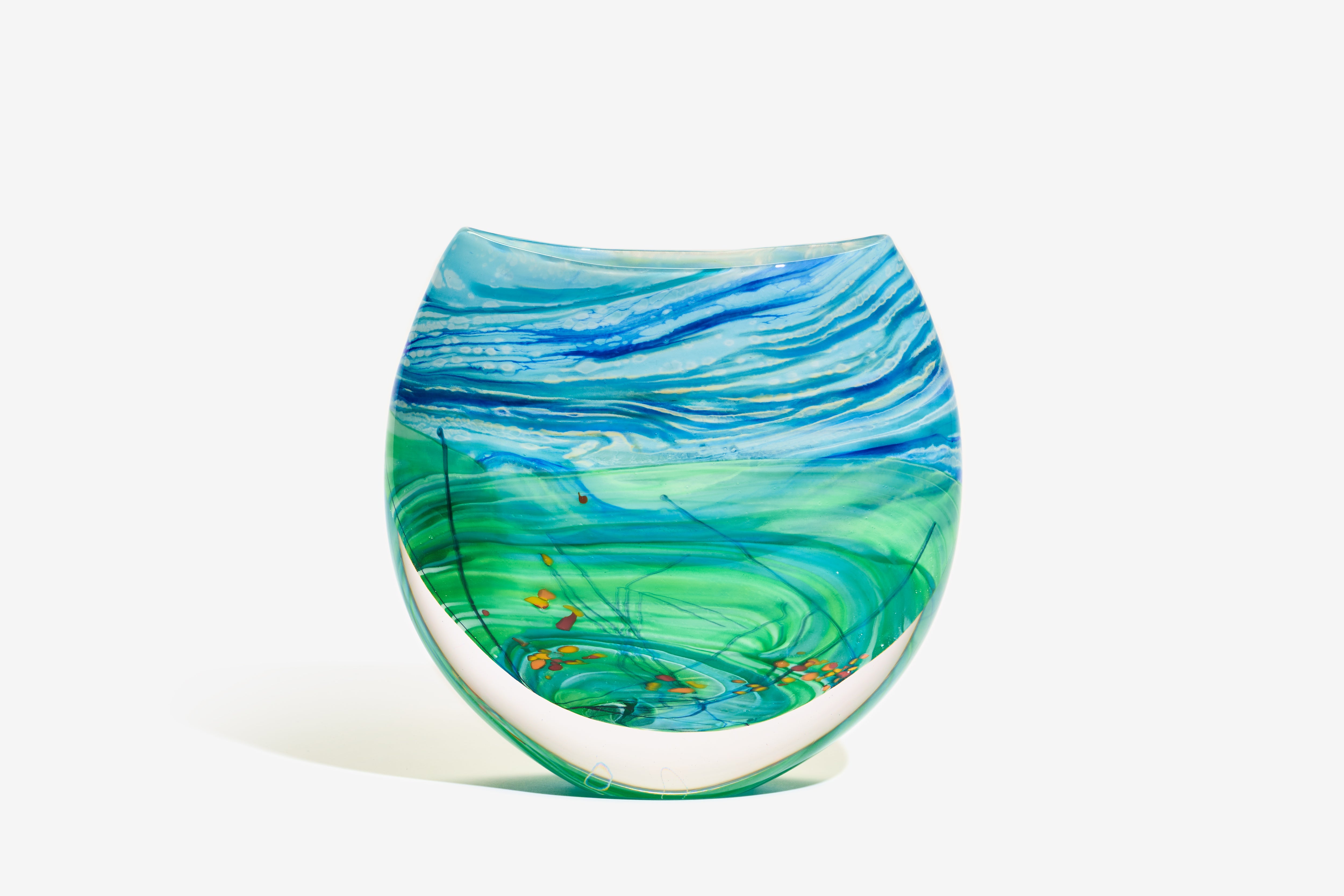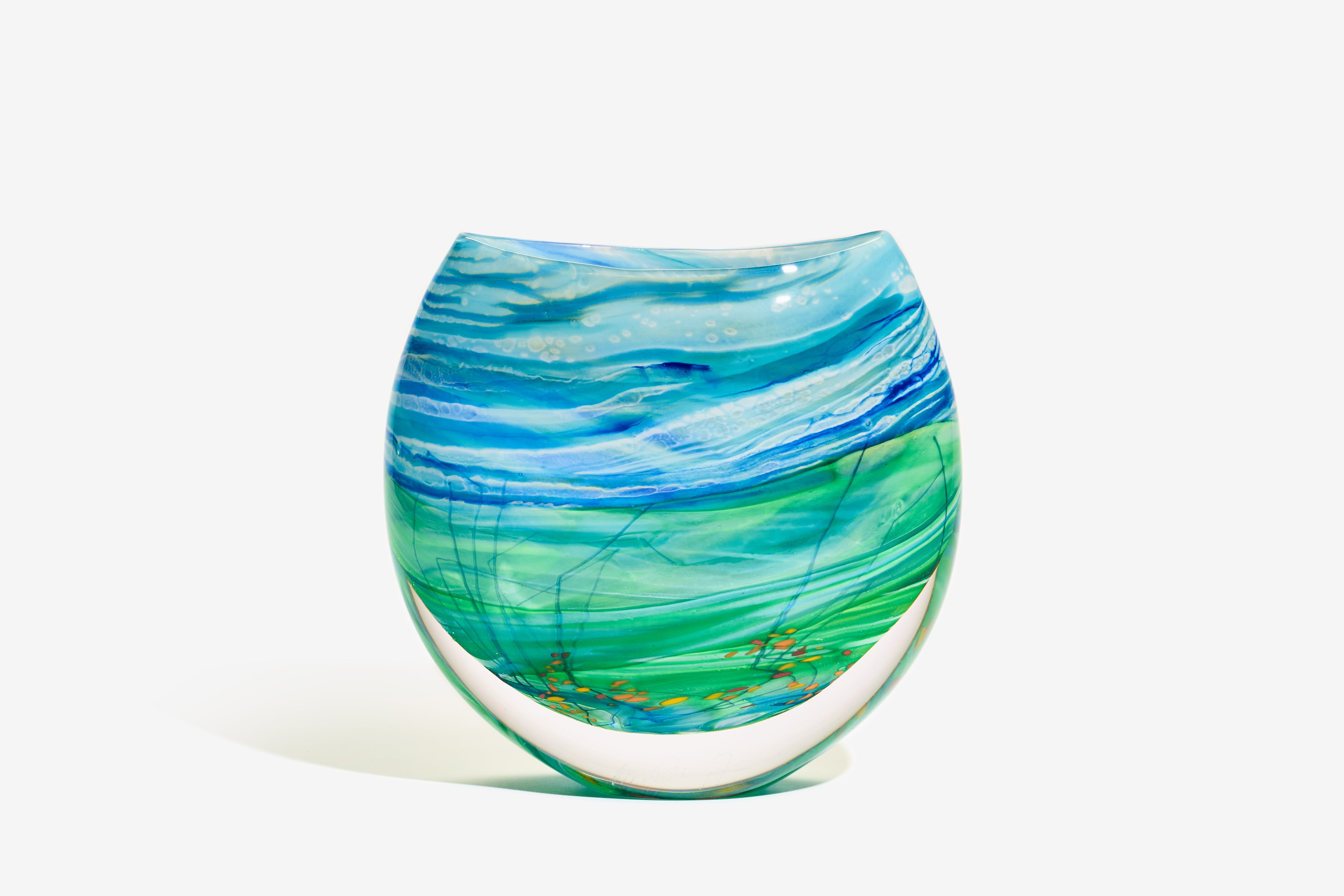 Soft hues of blue and green evoke rolling hills and the warmth of spring days. A special development piece reserved for the auction, it brings the beauty of the outdoors inside.