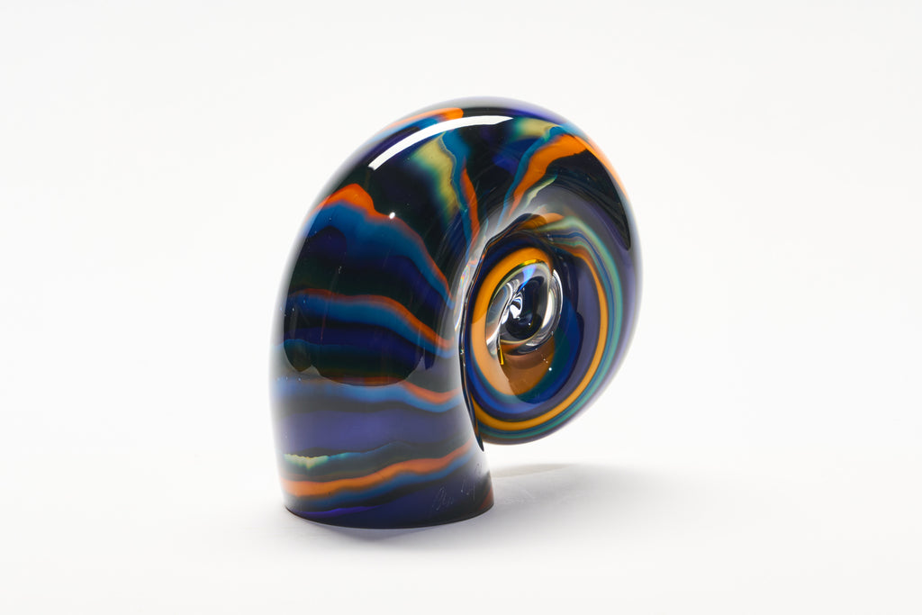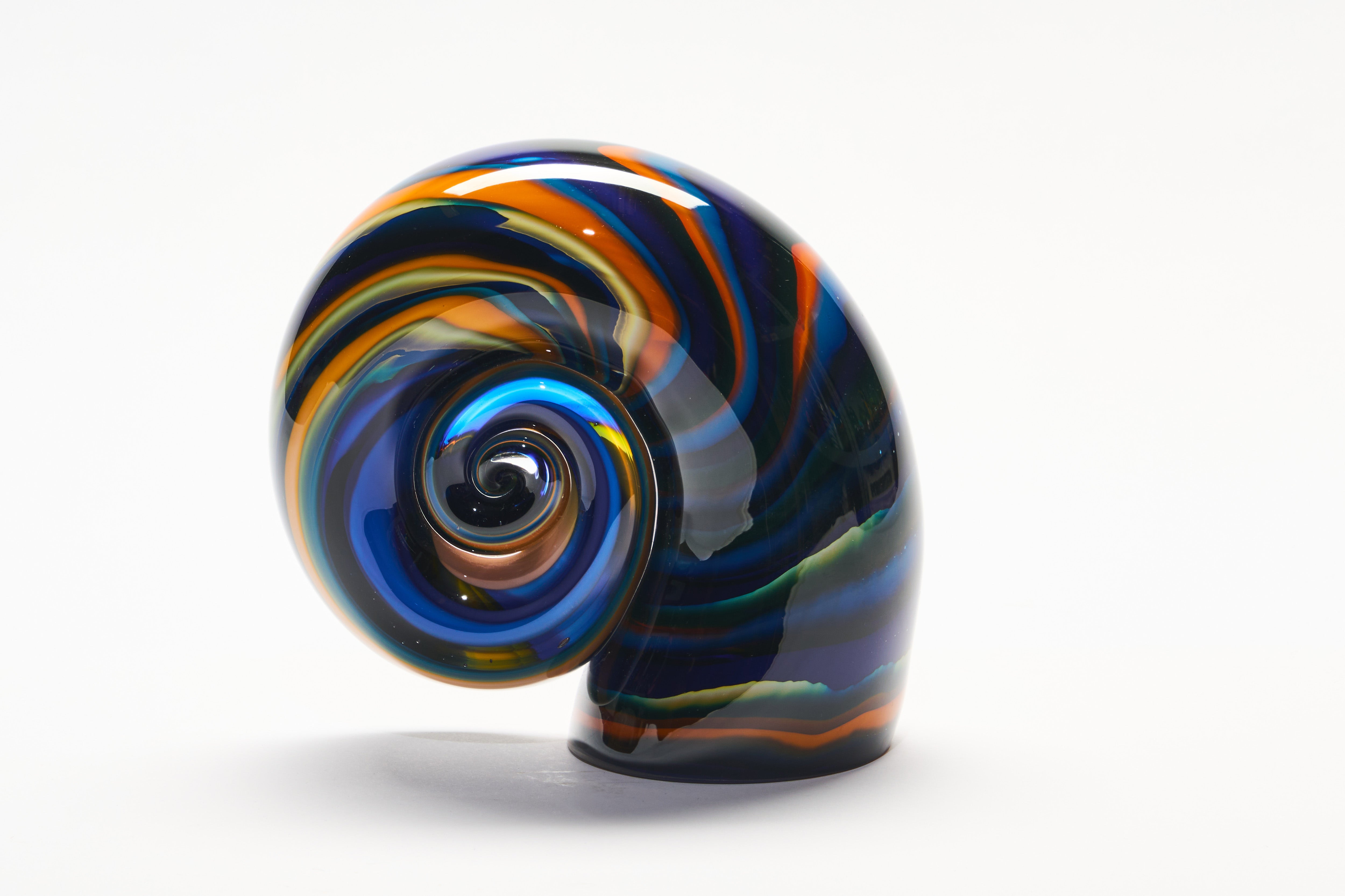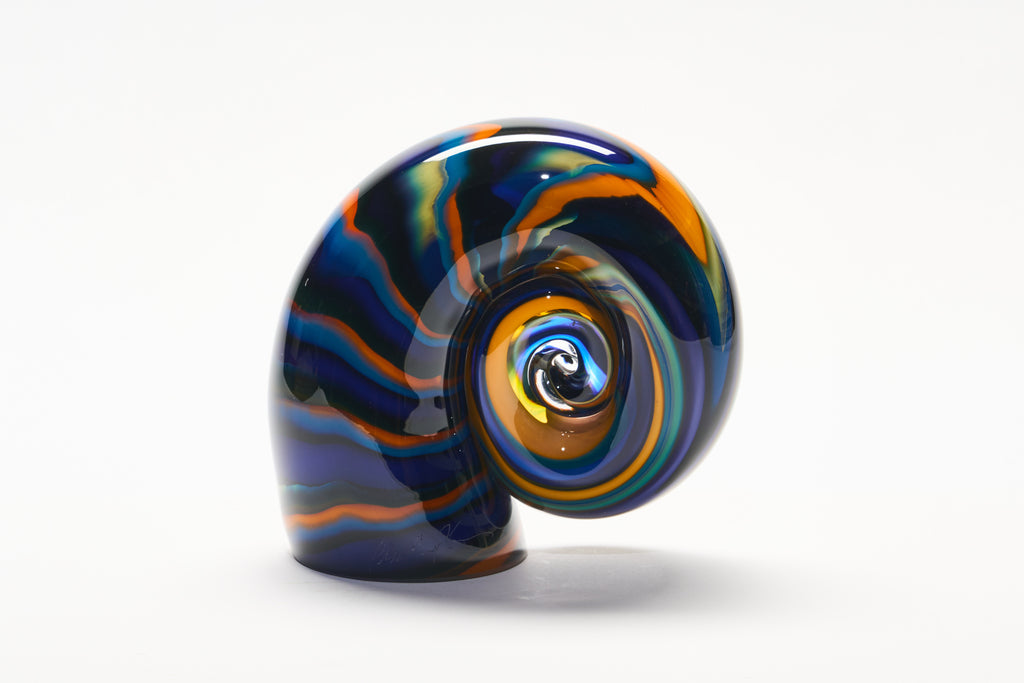 Deep blues and greens intertwine with golden orange accents, evoking the natural beauty of shells and ammonites found along the shore. The eye is drawn inward to the organic spiral form, creating a sense of movement and depth.