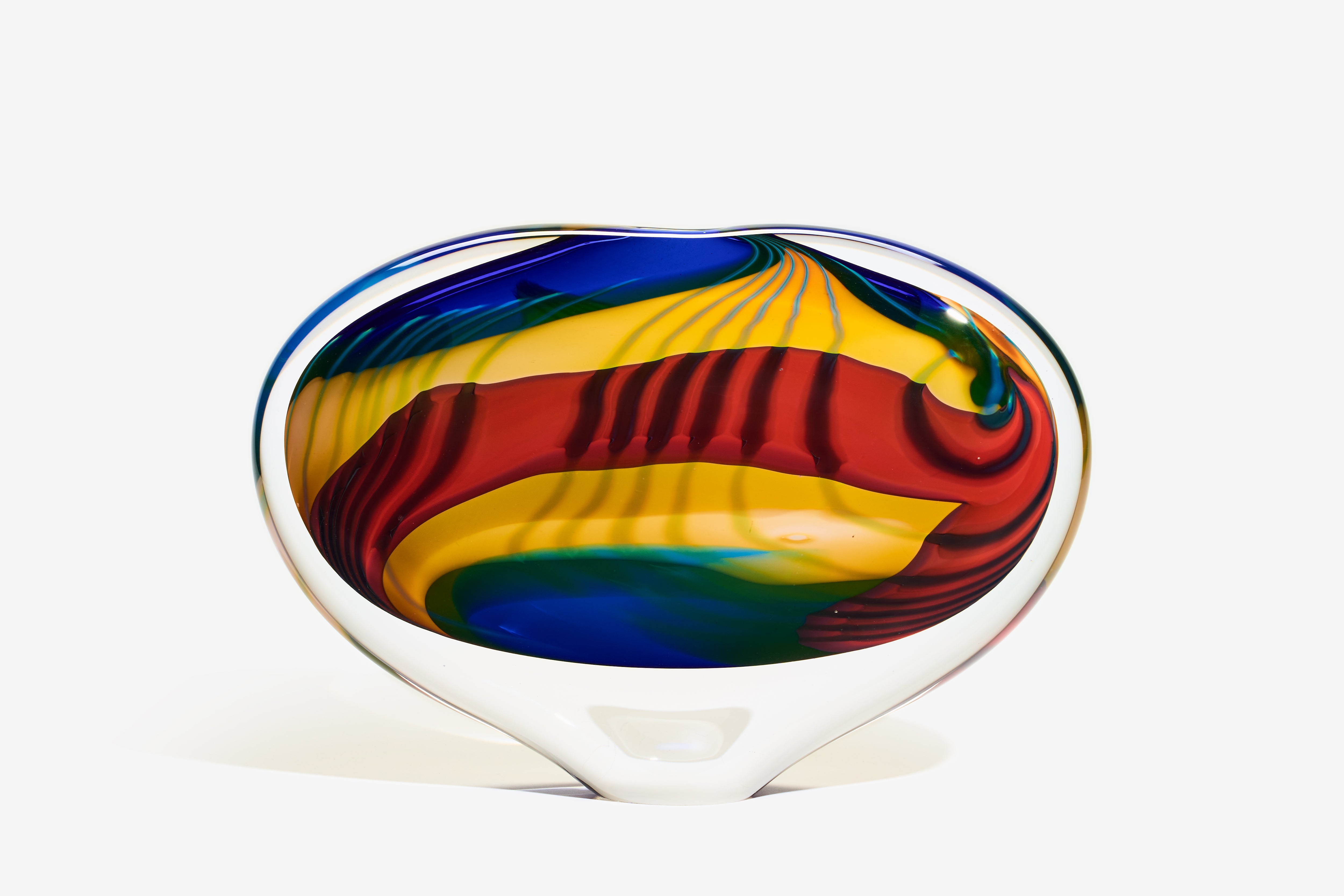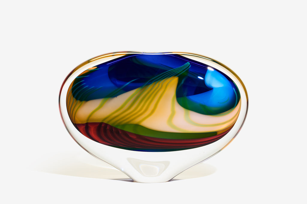 It’s remarkable that this stunning piece isn’t already in a collector’s hands. Its elongated form amplifies the Paradiso pattern, with transparent blue hues emerging beneath folds of yellow and red.
