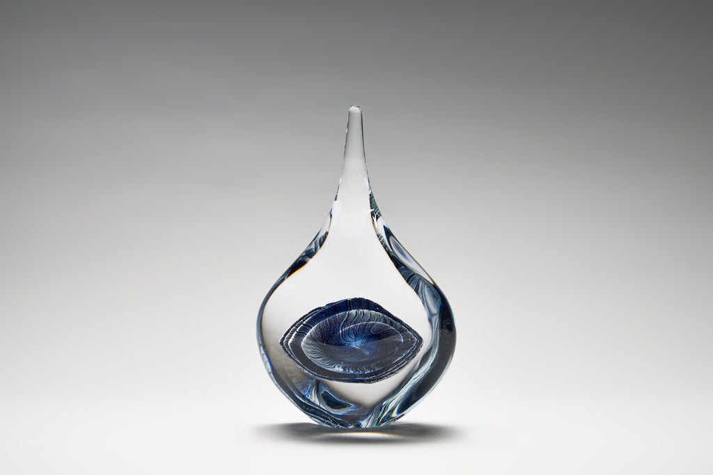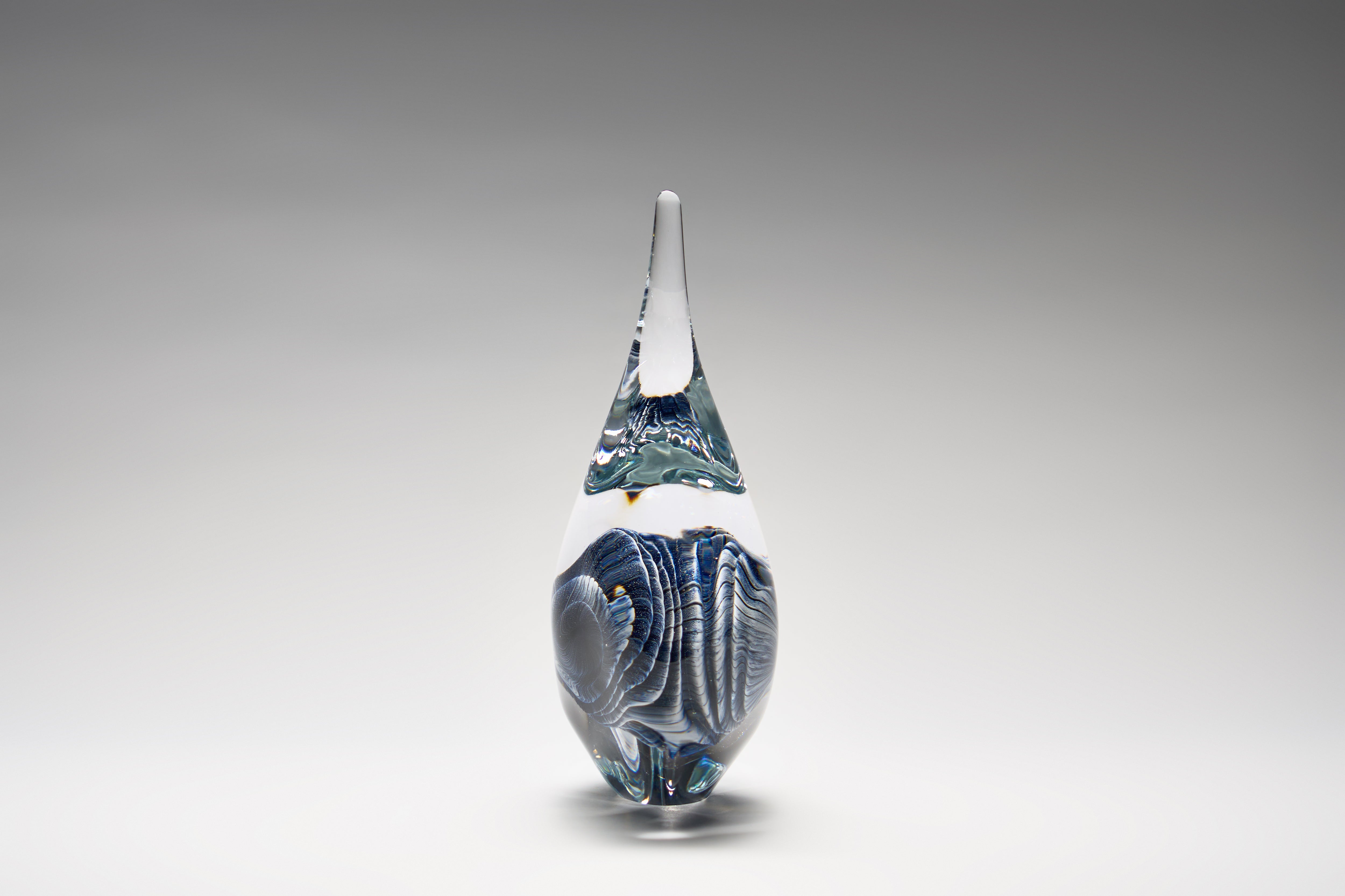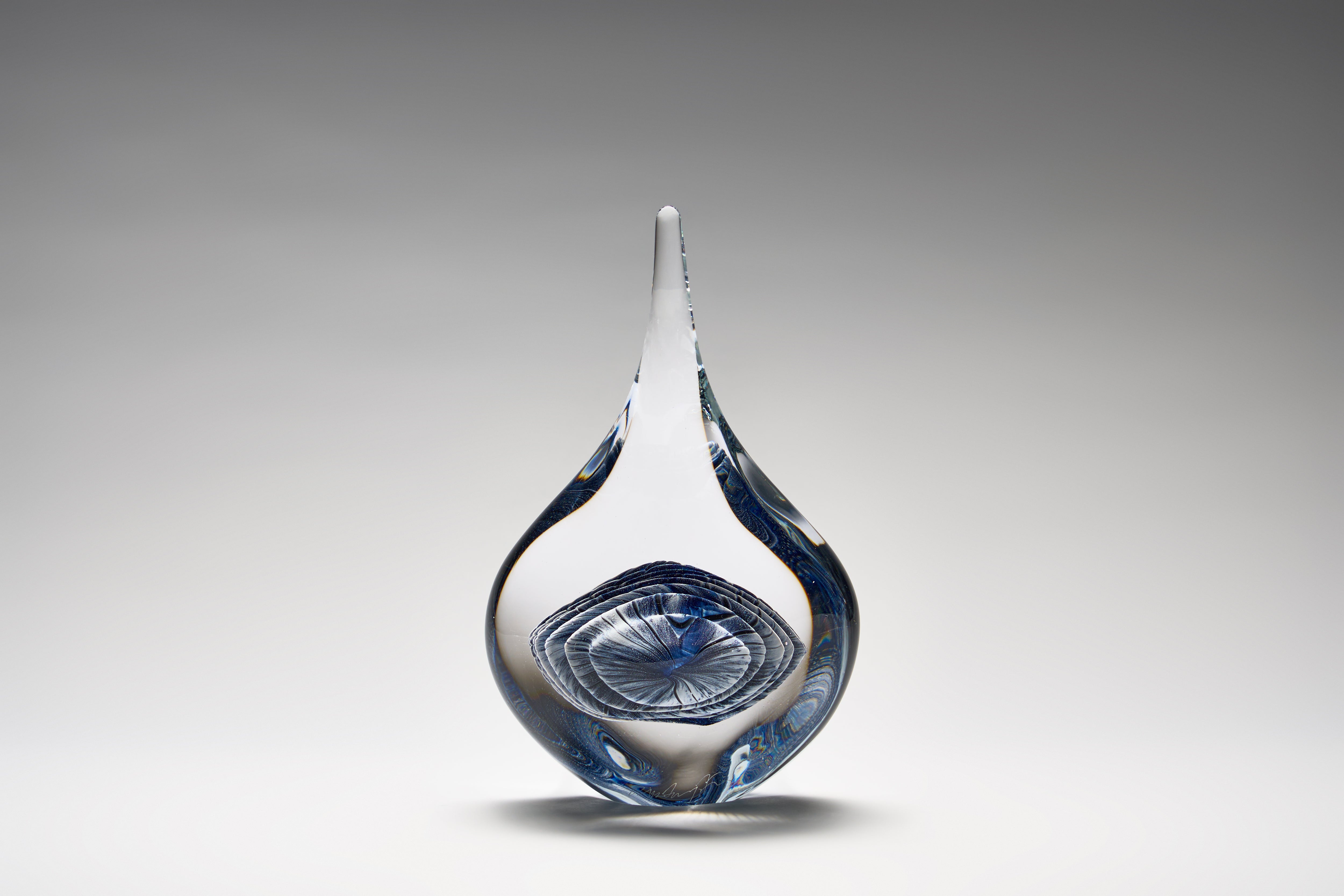 Suspended in a graceful dropper formation, the plume pattern appears almost eye-like within its clear enclosure. The only one of its kind, this exceptional sculptural artwork is perfect for a mantlepiece, where the glow of the fire can play across the surface.