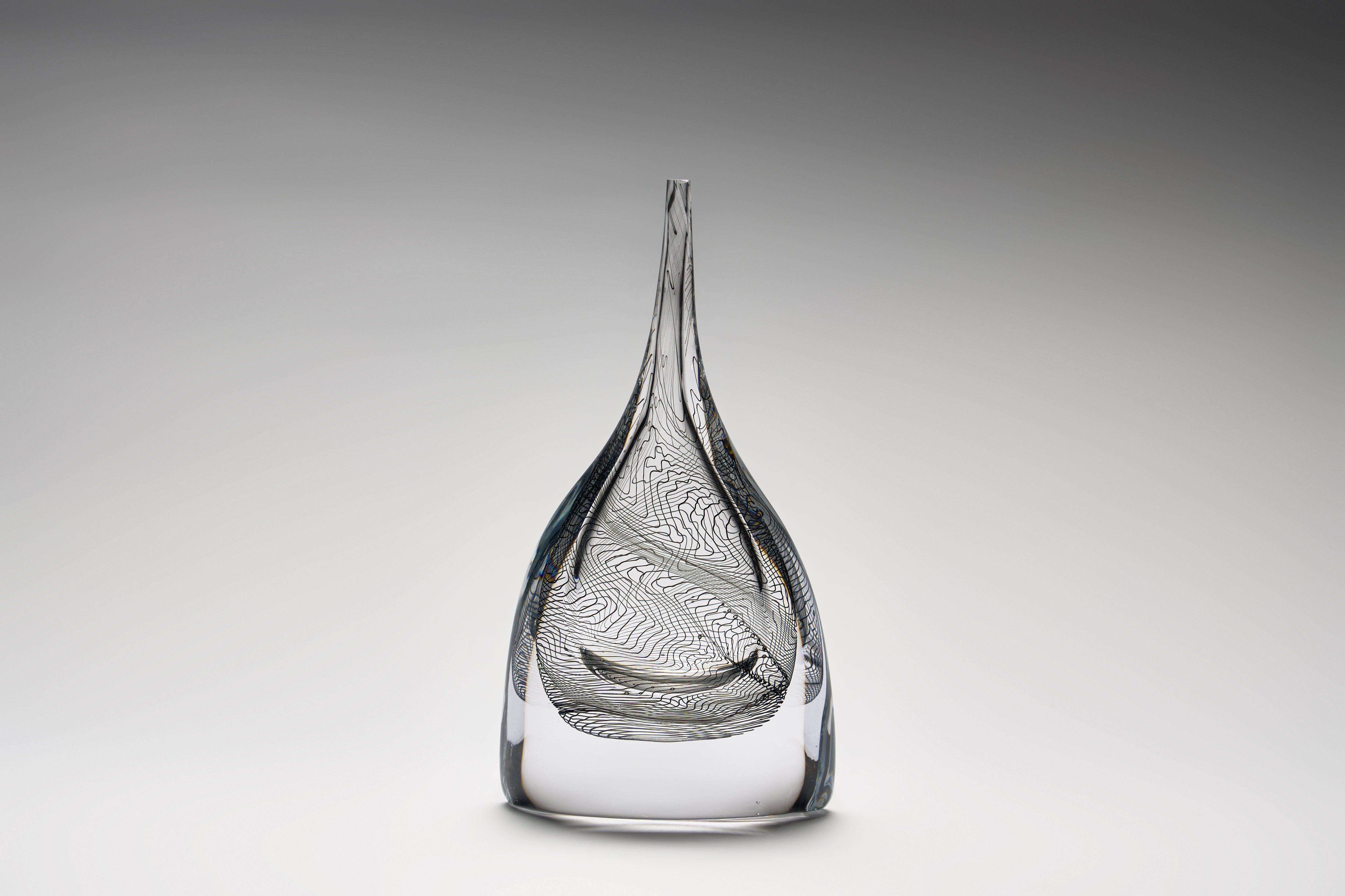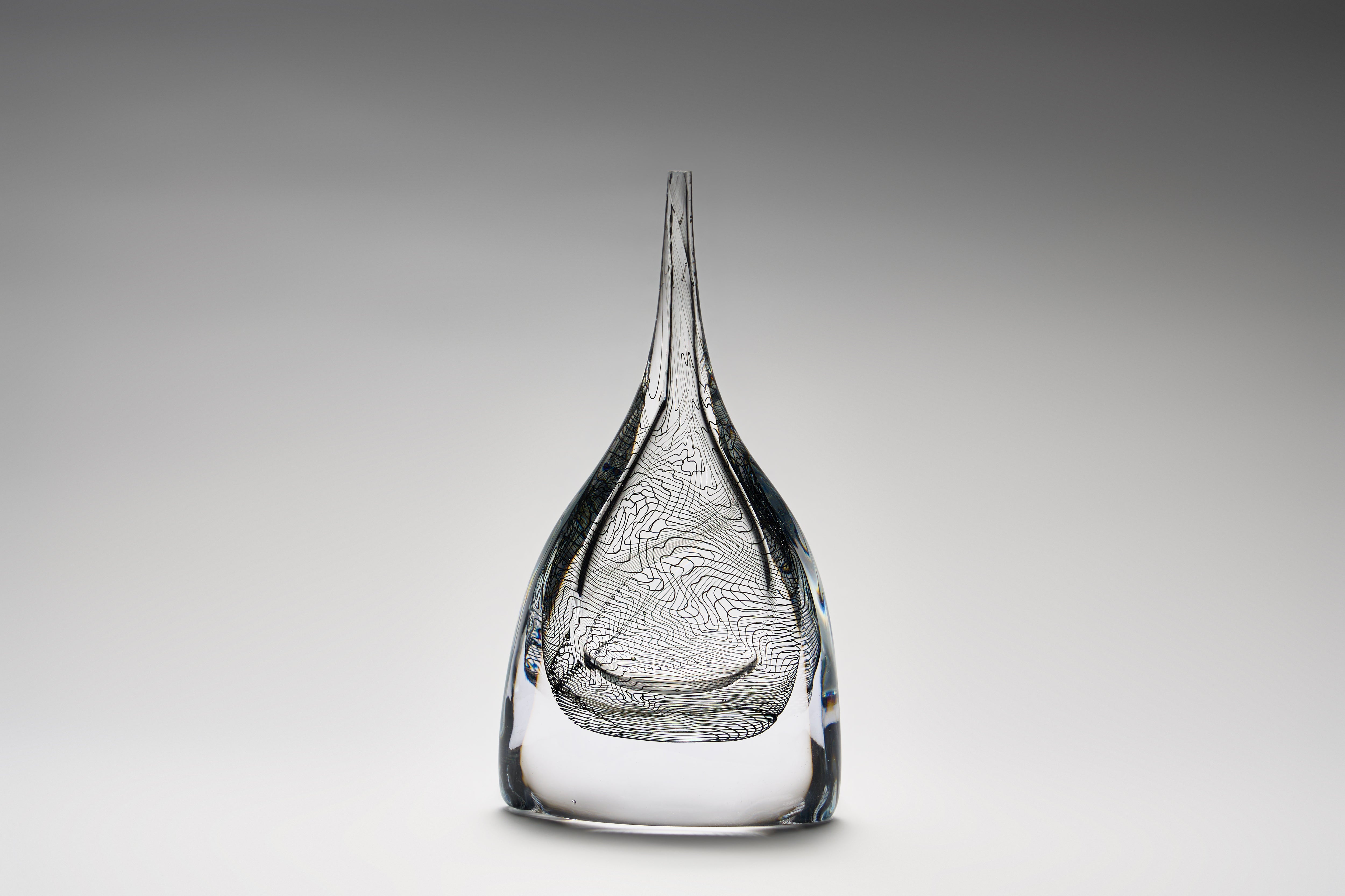 A signature series by Peter, Burano has been reimagined in an elegant bottle form. Unlike other examples in the series, the black trails are suspended on a clear background - a striking departure from the usual vibrant colour, making this piece truly exceptional.