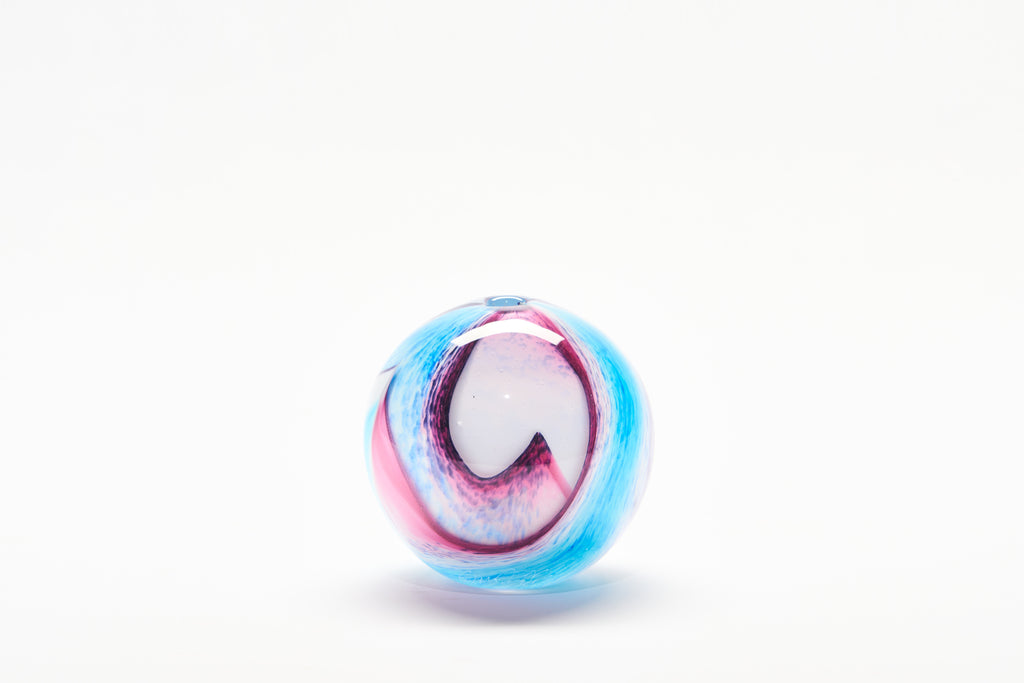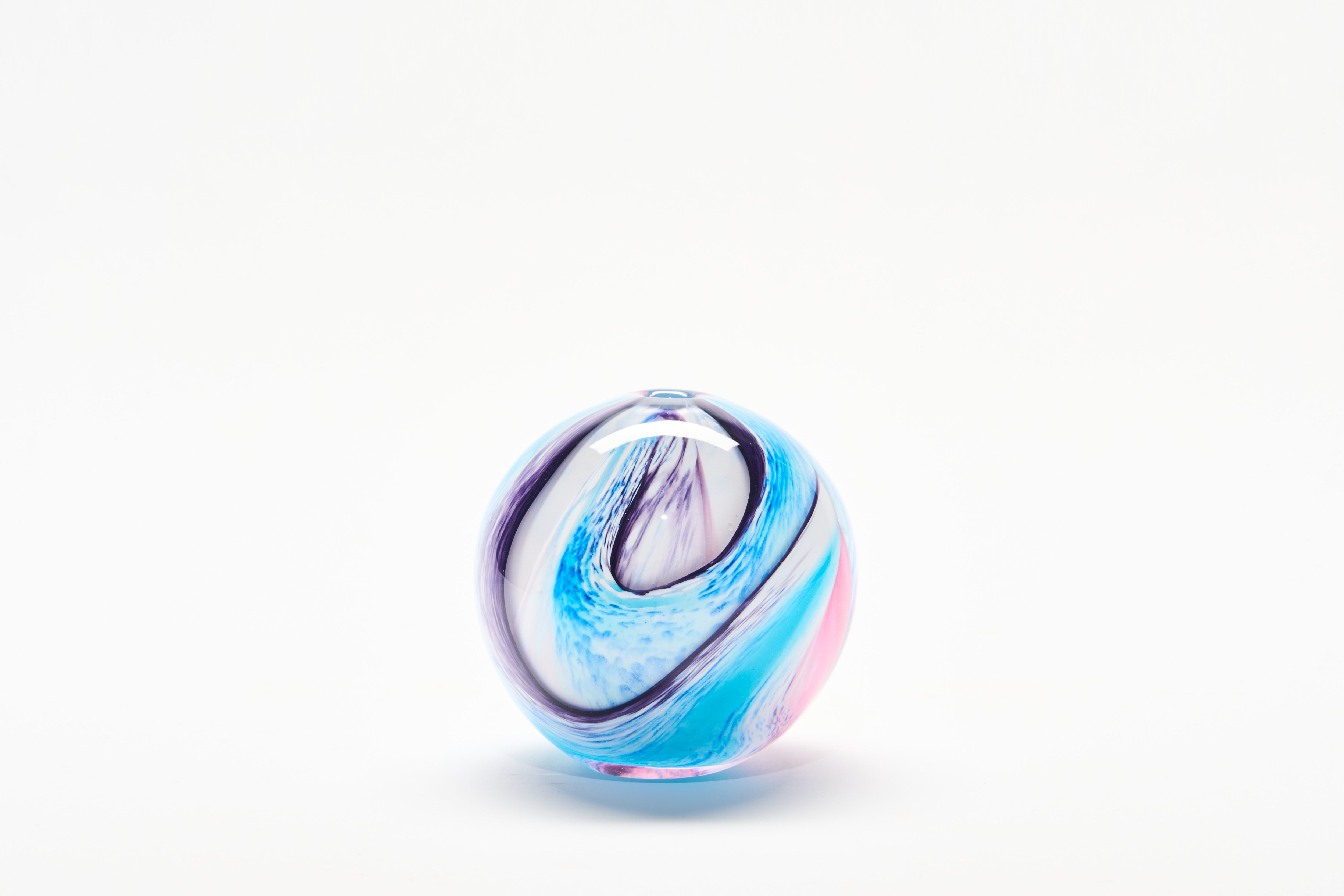 This freeblown small Pastel Georgia glass sphere creates alluring visual movement from every angle with fluid curves enhancing the sweeping ribbons of pink, blue and purple.