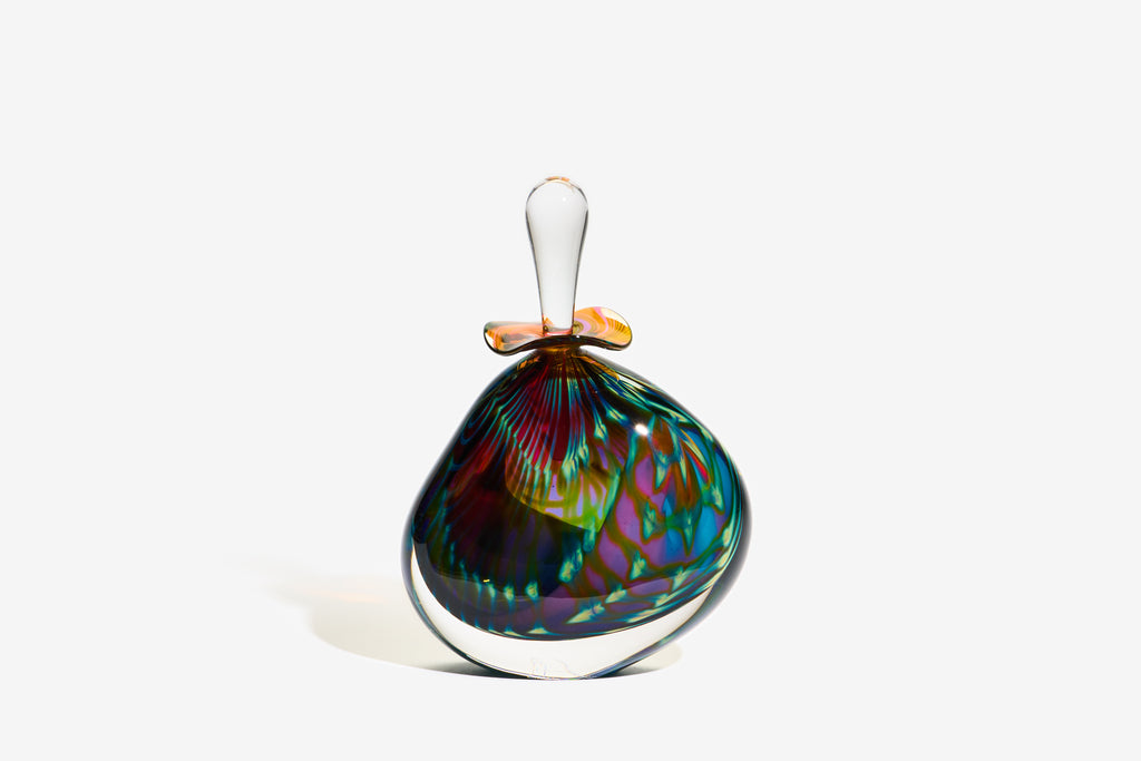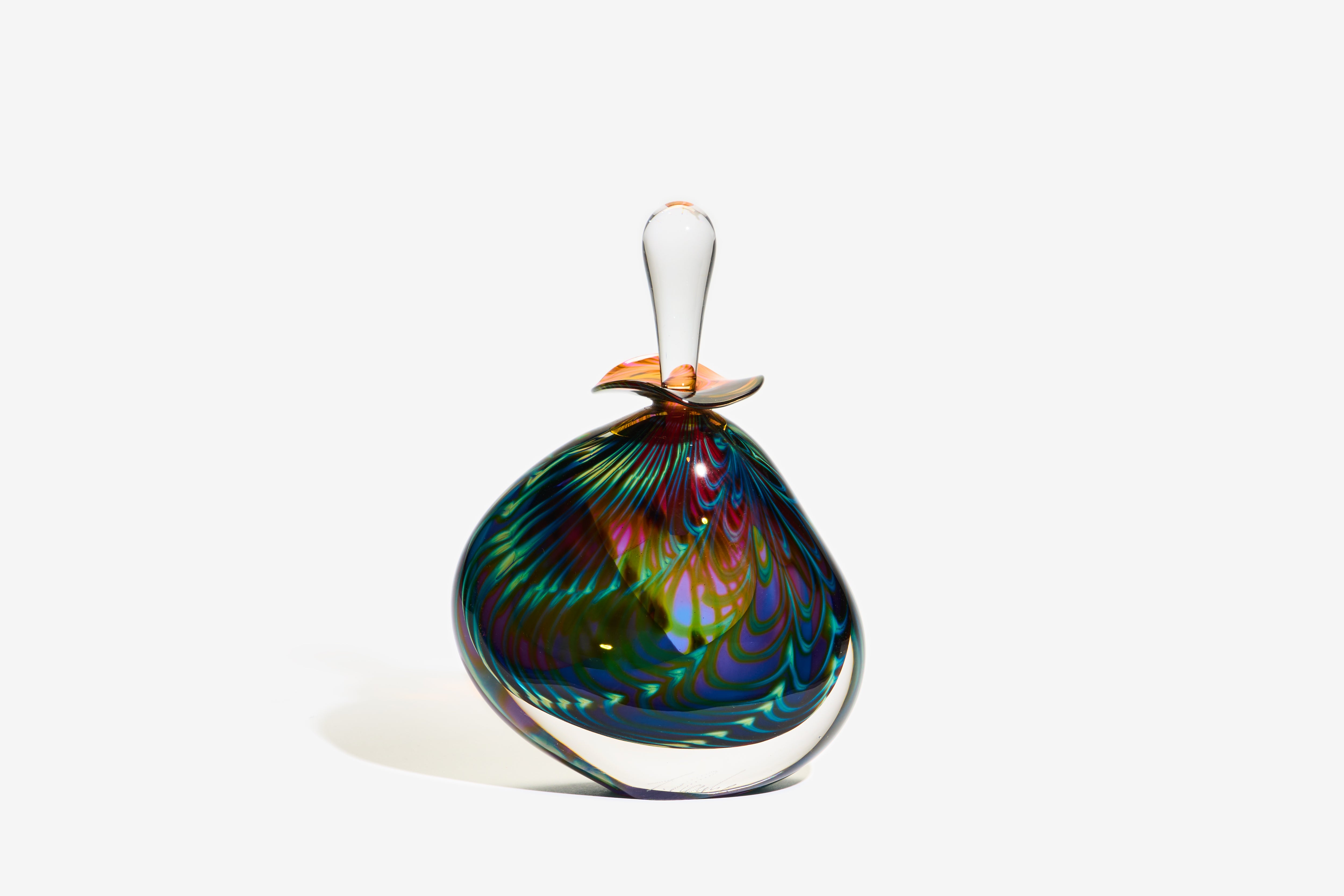Polaris marks a new development in Tim’s ongoing investigation of optical effects in glass. In this iteration, the series features a pink and blue colour combination, blending to create the illusion of soft purple, while a newly introduced optic mould generates a subtly mountainous pattern across the surface. Colours are applied in a painterly fashion, each pigment interacting to produce enchanting gradients. Encapsulated within a solid layer of clear glass, the colours and pattern are magnified and reflected, creating an effect reminiscent of a distant galaxy. Inspired by the luminous beauty of the northern lights - an effect Peter has also explored in his Aurora and Borealis series - Polaris celebrates the shared fascination both artists have with ephemeral natural phenomena.