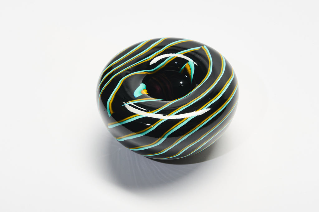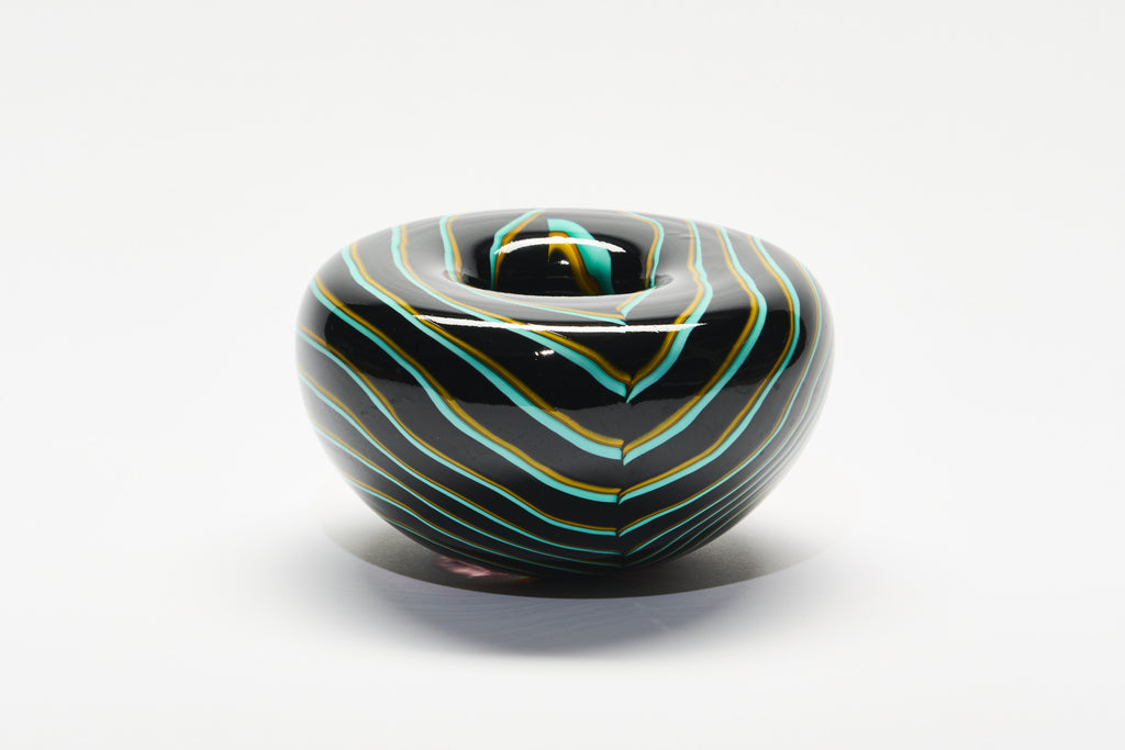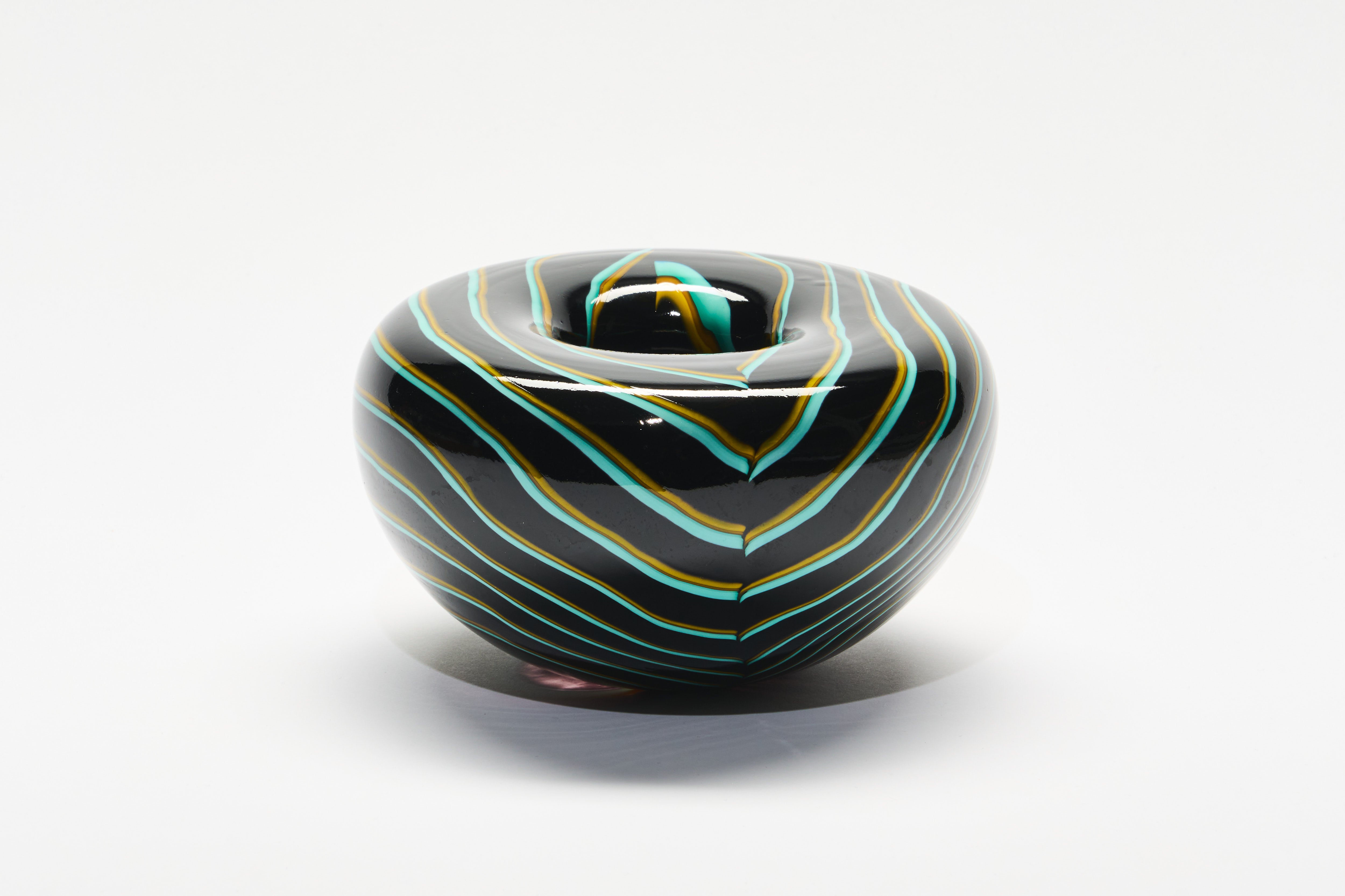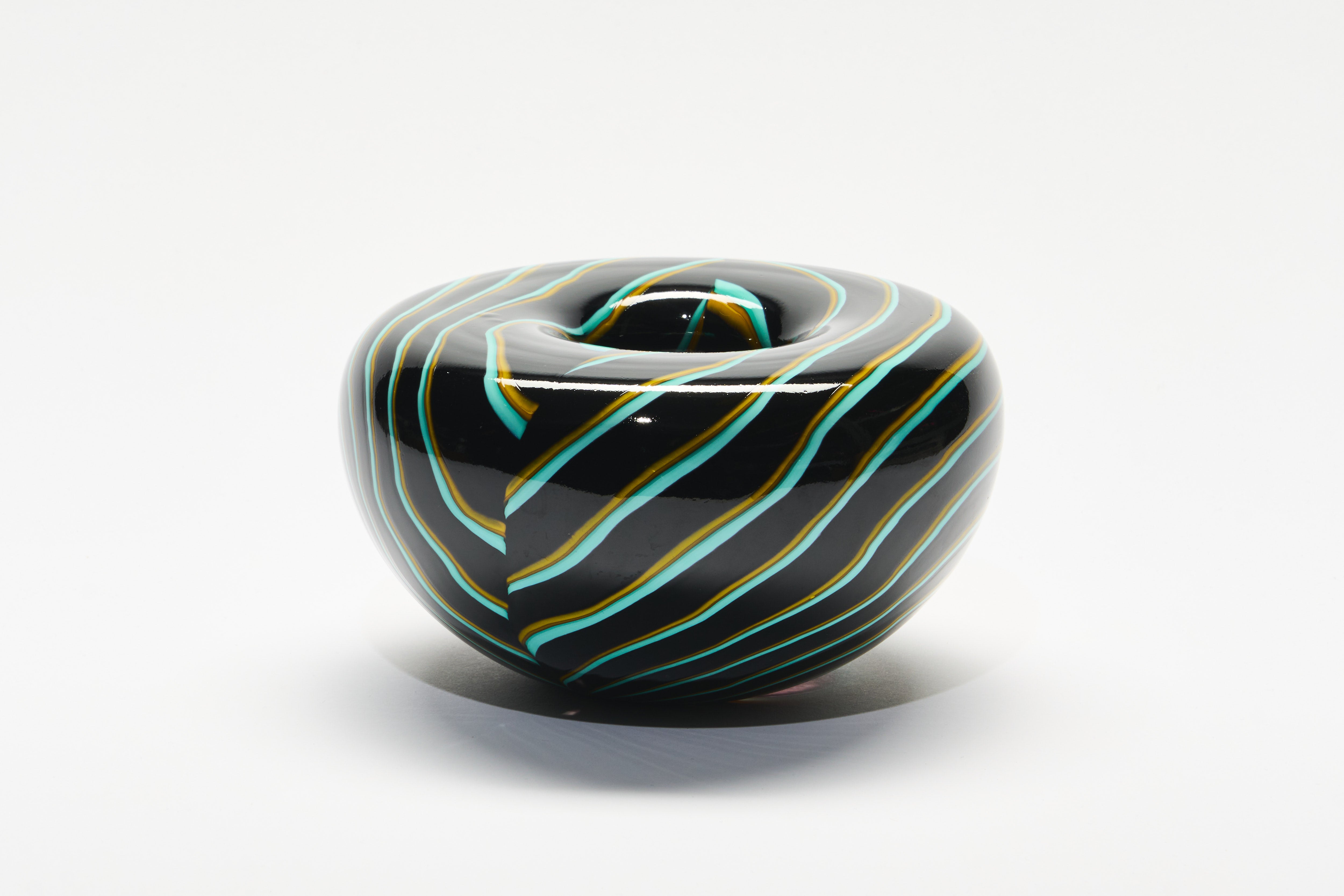 Small in size but full of character, this piece features black, green, and yellow stripes that follow its curves, forming a harmonious flow of pattern.