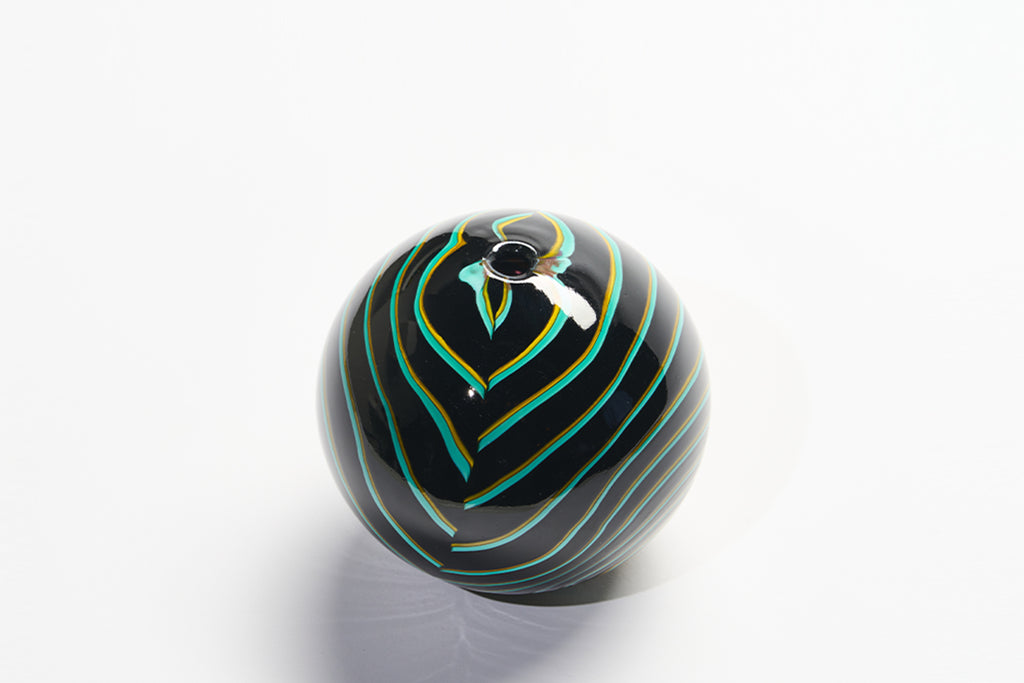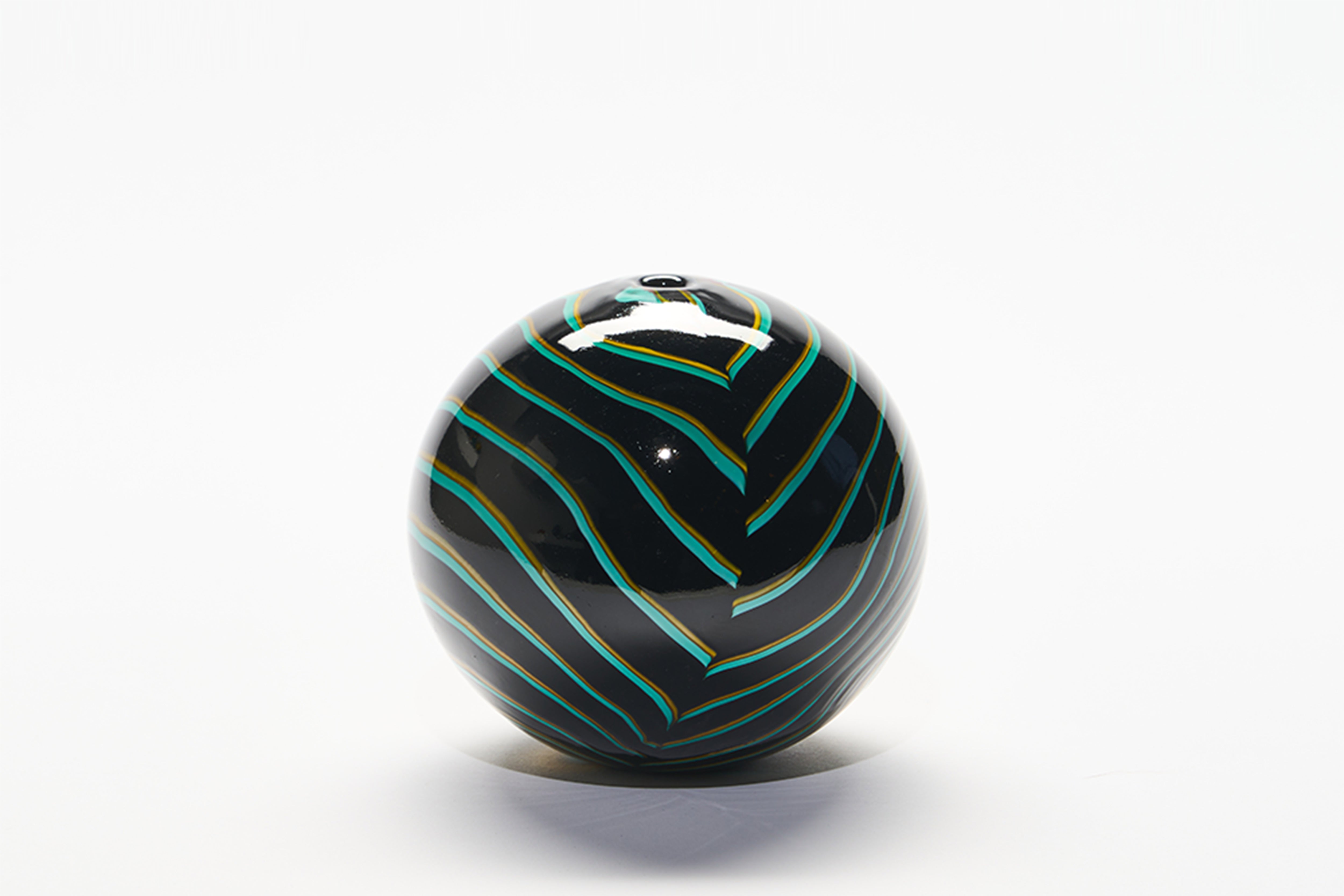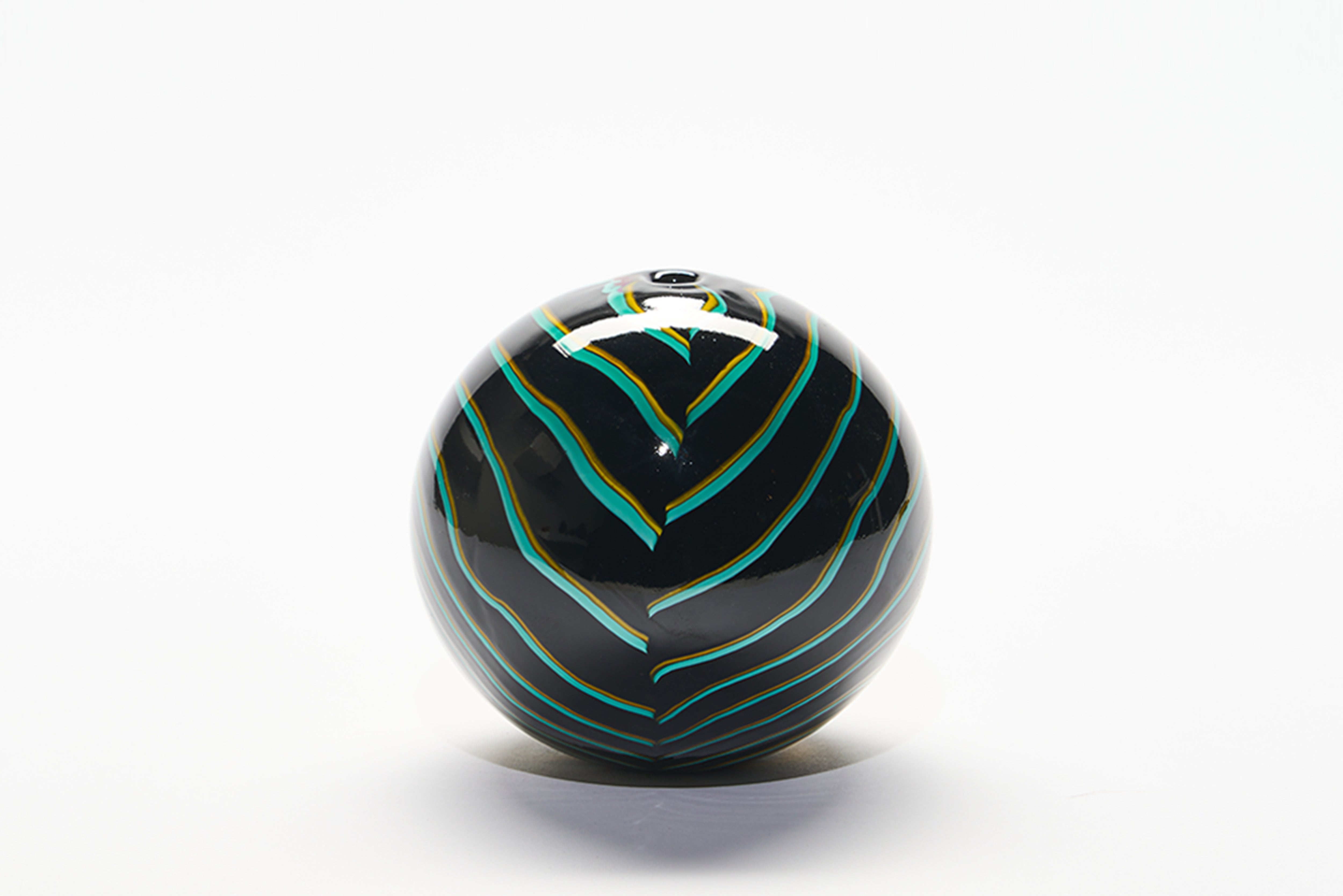 Unlike other pieces in the series, this sphere is left unetched, allowing the natural shine of the glass to sparkle in the light. Nearly perfect in form, it is a striking gem for any collection.
