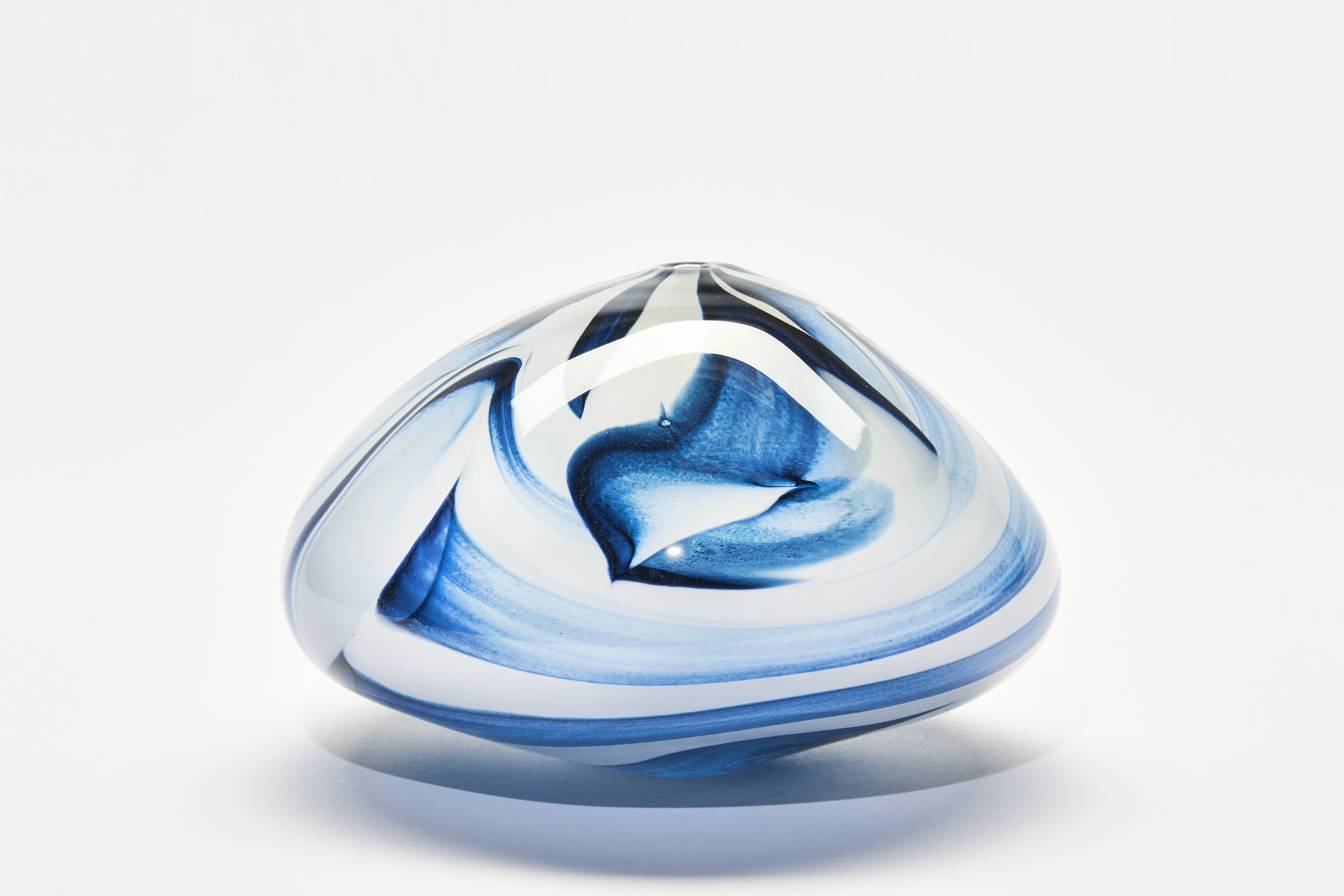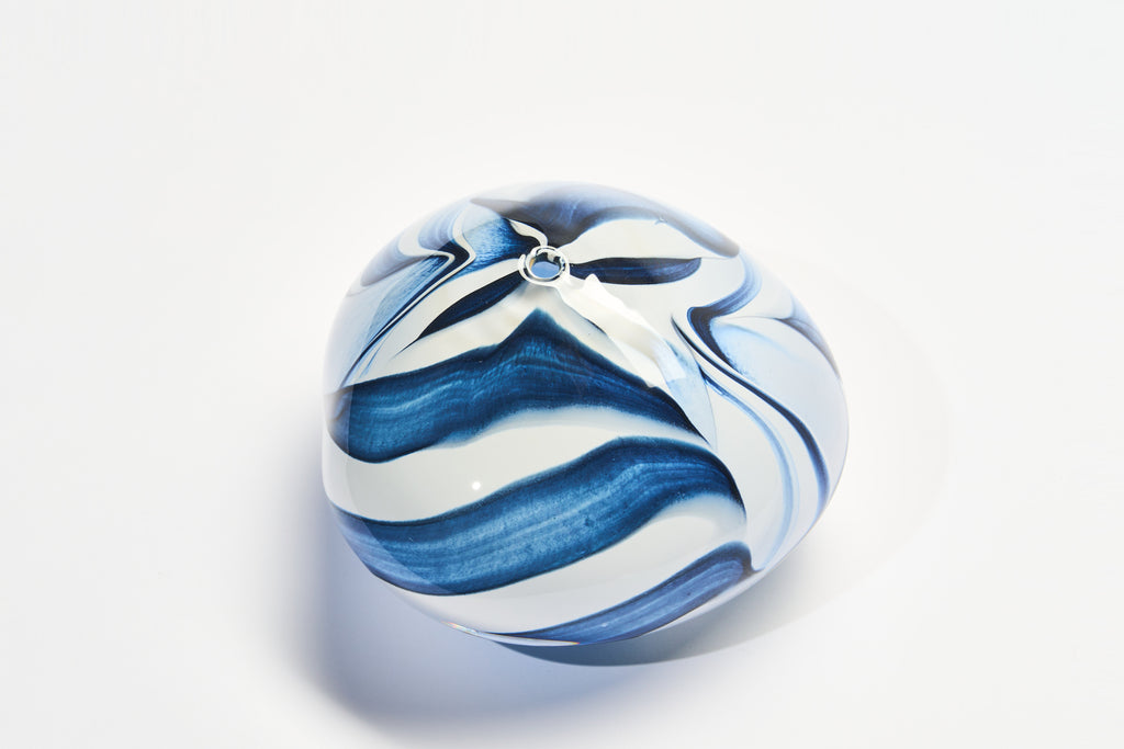 Like ink dropped in water, the organic form of this piece showcases the fluid movement of glass. Blue and white stripes flow along its curves, echoing the way ink disperses when it meets water.