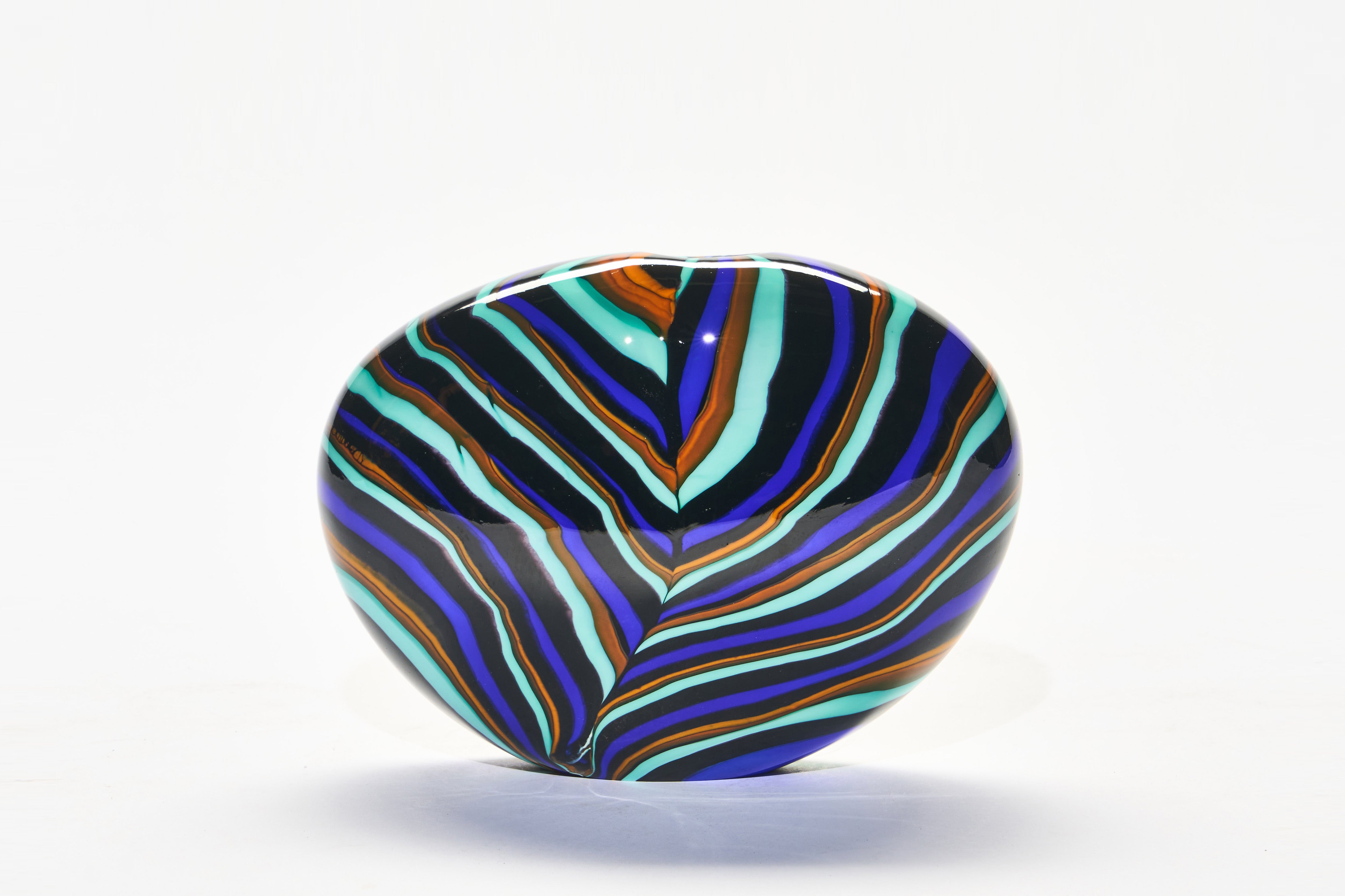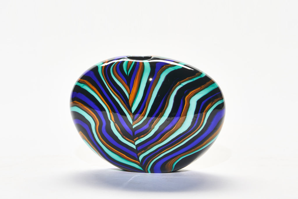 Slightly squat and organic in form, this piece pairs deep blues with light greens and subtle flashes of orange. Small yet impactful, it brings a bright accent to any space.