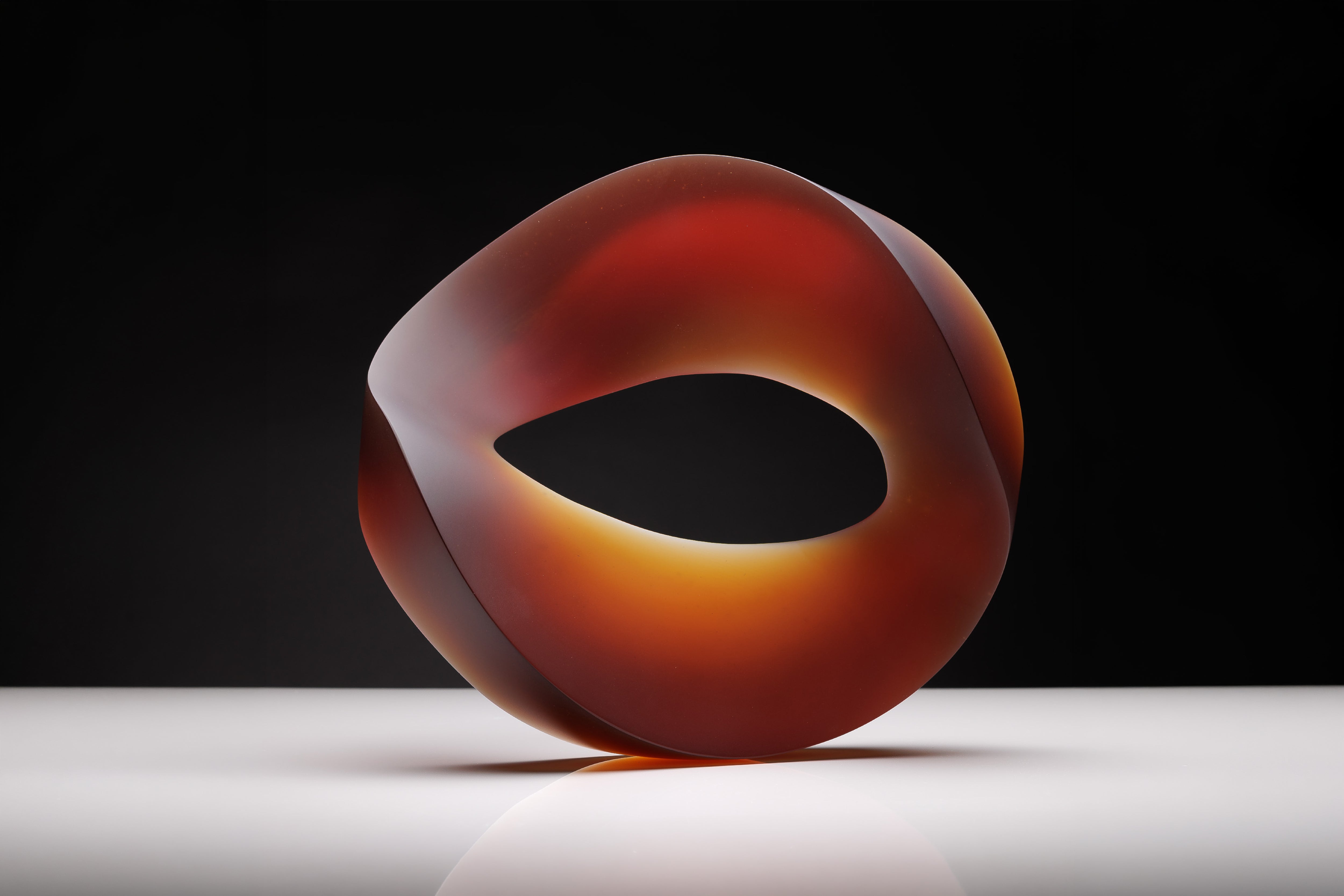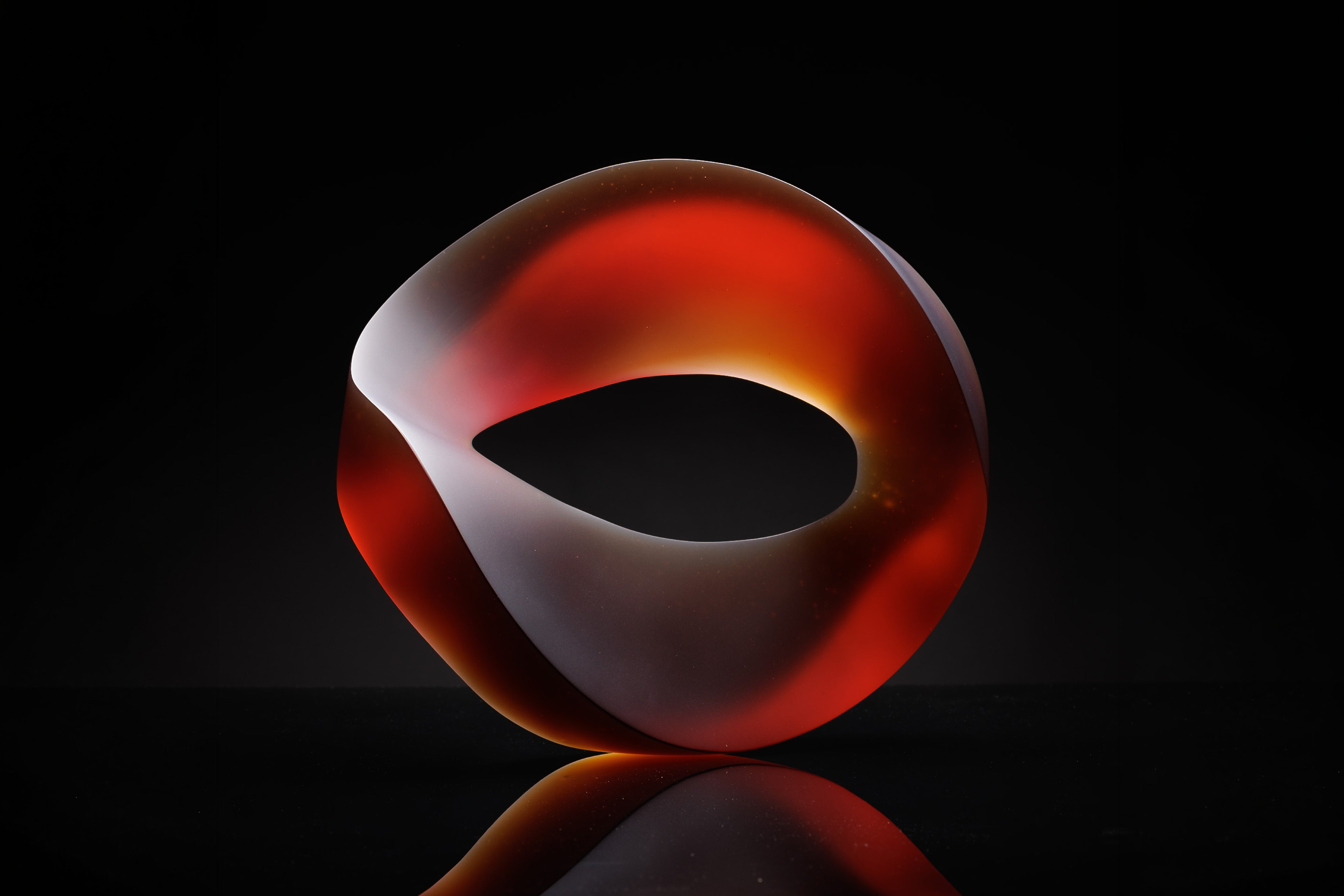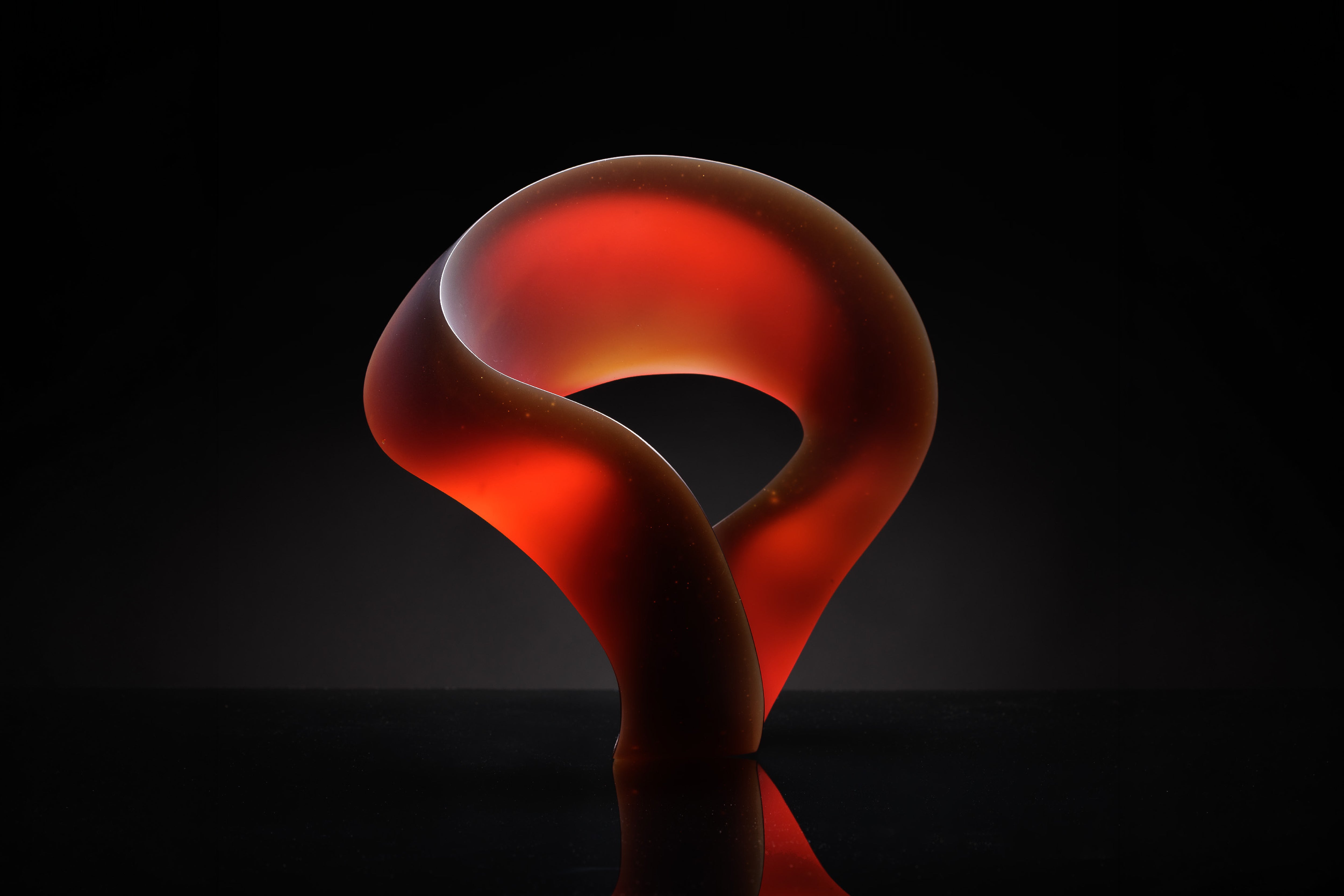 Heike’s sculptural practice explores the interplay of transparent colour, form, and light in glass. By mixing colours during casting, she creates both uniform hues and patterns that reveal the flow of the material. Many of her works are based on the D-form, a three-dimensional structure with no fixed base, allowing them to be displayed in multiple orientations. Their appearance changes with angle, light, and touch, as thickness, curves, and surface finish produce subtle movement and shifting colour phenomena.