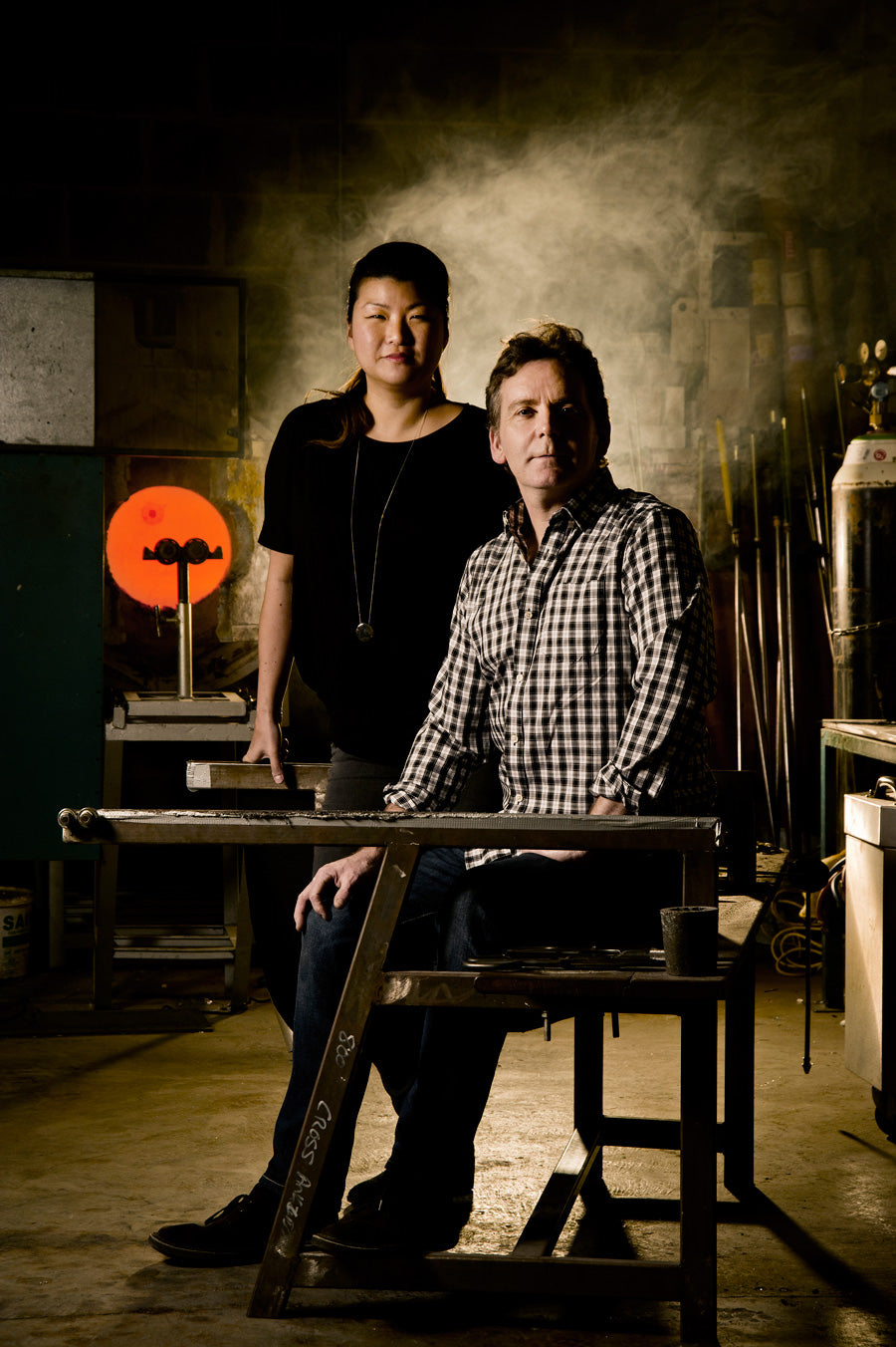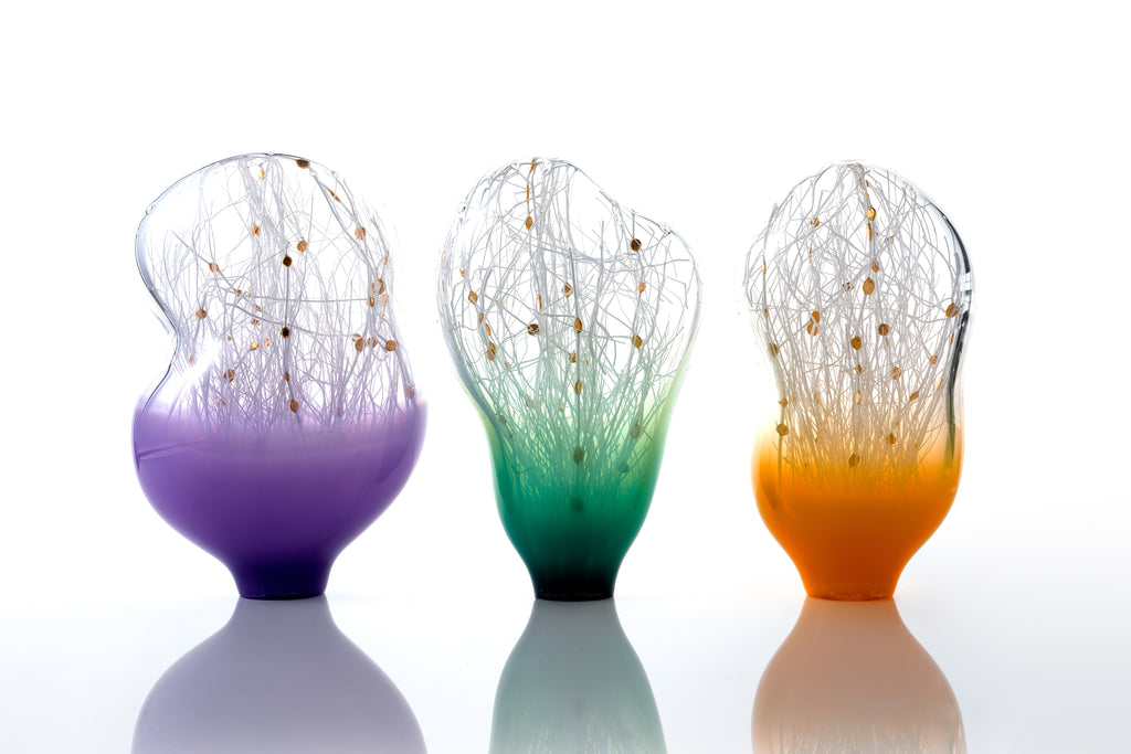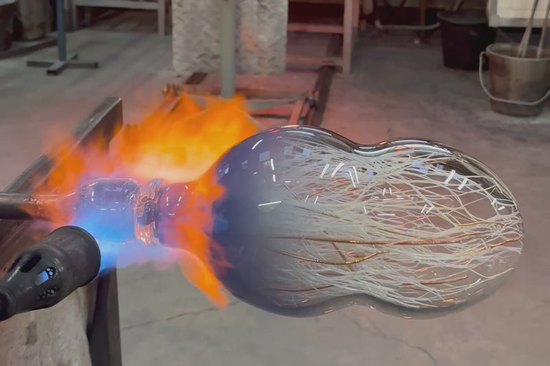 Their large-scale, elegant sculptures demand an intuitive, collaborative and performative approach to making, resulting in a dramatic glassblowing spectacle. Real magic occurs as they execute the seemingly impossible feat of placing strands within the hot glass, an action-packed process of astounding complexity and skill, culminating in bold and beautiful works.