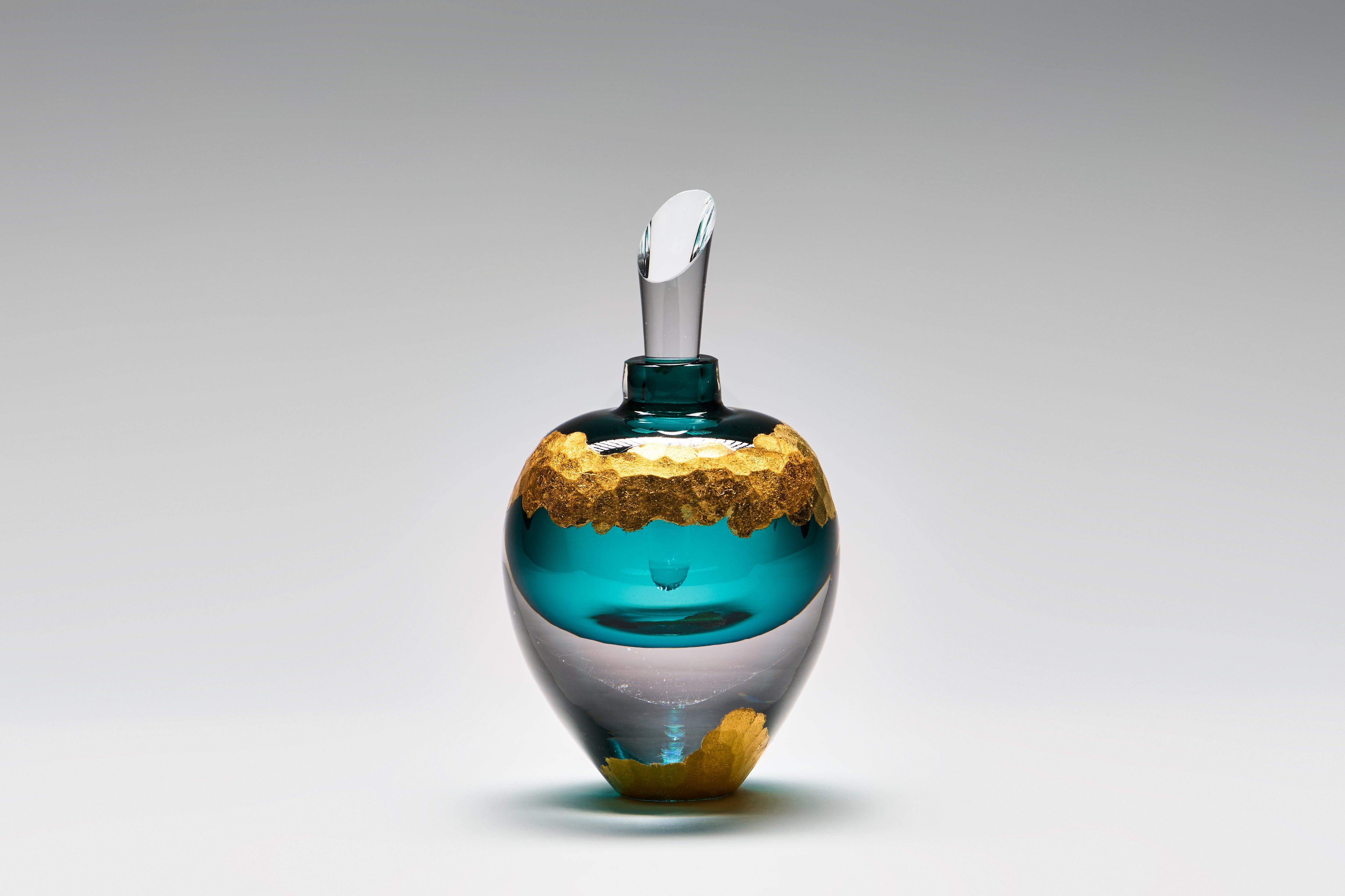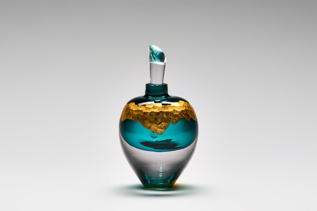 Aurum draws inspiration from the ancient practice of alchemy and the quest to create gold from base metals. In these works, metals such as iron, tin, and cobalt are combined with glass to produce vibrant, transformative colours. The surfaces are gilded with gold leaf over a battutoed texture, evoking the look of hammered metal. The vial-like forms reference the vessels alchemists used in their experiments, entwining the base with the precious. Harriet’s pieces celebrate the alchemical beauty of transformation, marrying materiality, colour, and historical symbolism in luminous glass forms.