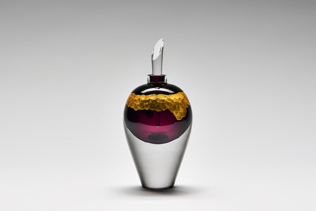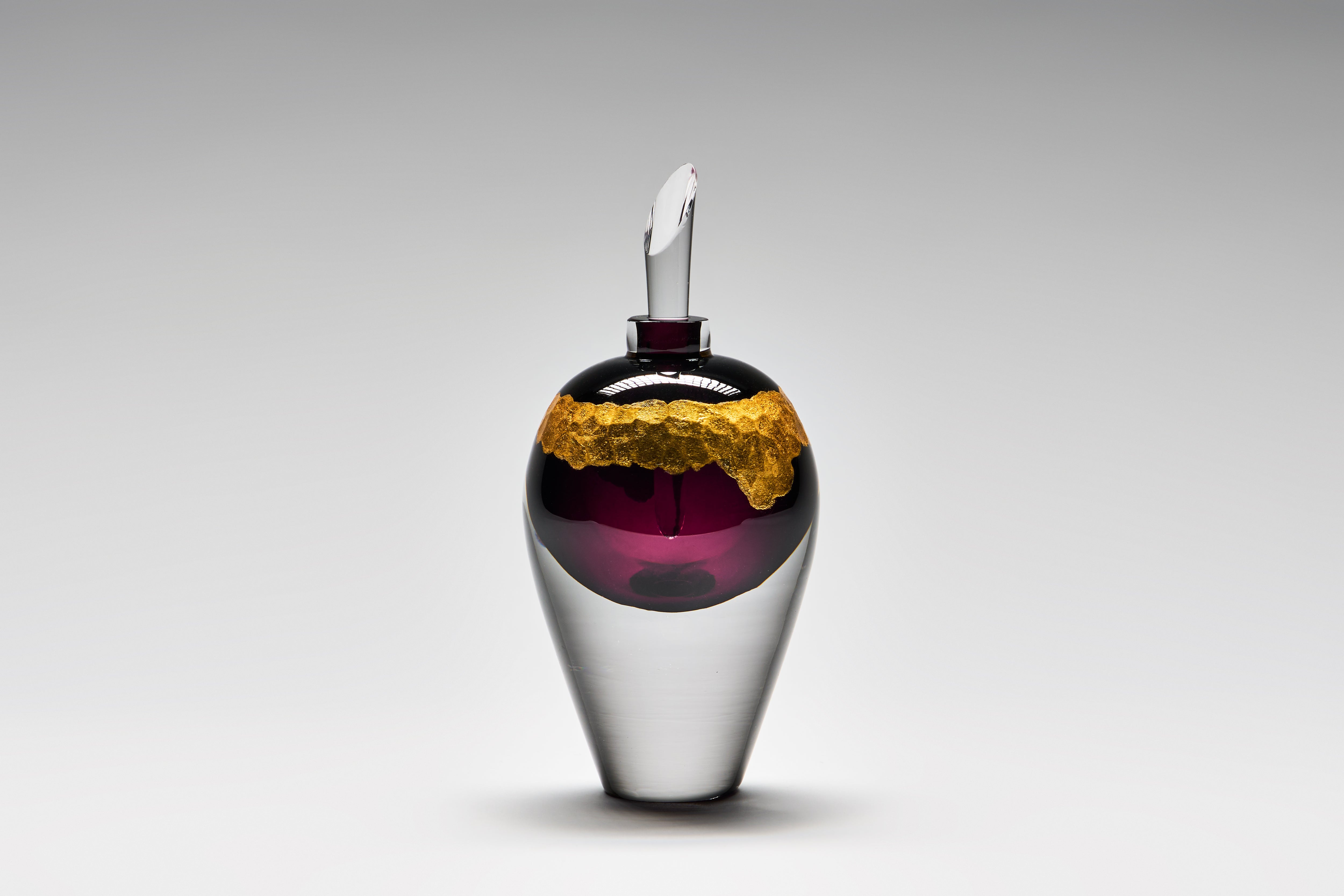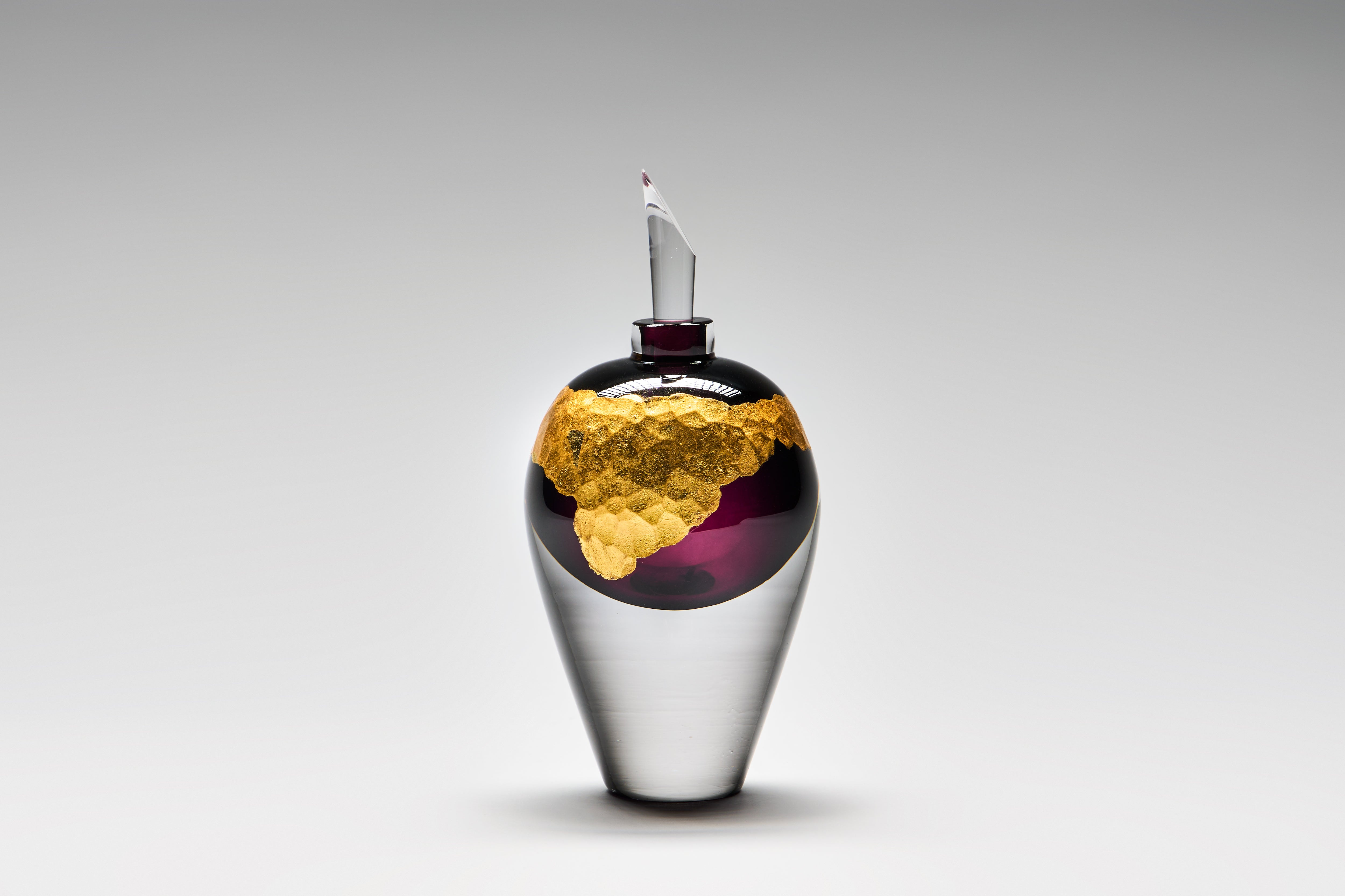 Aurum draws inspiration from the ancient practice of alchemy and the quest to create gold from base metals. In these works, metals such as iron, tin, and cobalt are combined with glass to produce vibrant, transformative colours. The surfaces are gilded with gold leaf over a battutoed texture, evoking the look of hammered metal. The vial-like forms reference the vessels alchemists used in their experiments, entwining the base with the precious. Harriet’s pieces celebrate the alchemical beauty of transformation, marrying materiality, colour, and historical symbolism in luminous glass forms.