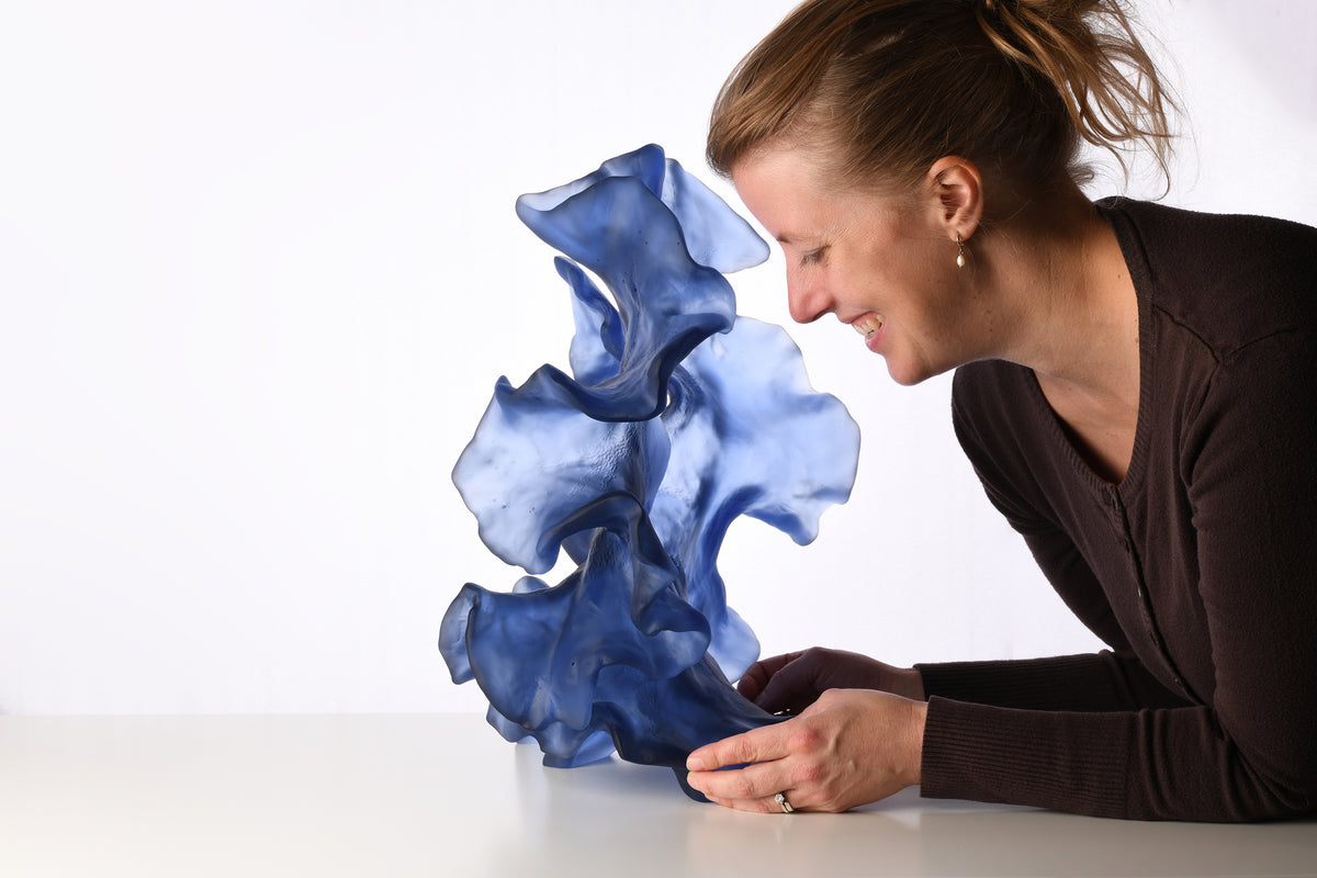 Monette's masterful technique transforms delicate crocheted forms into stunning kiln-cast glass, particularly evident in her breathtaking exploration of coral geometries. The creative process of refining, altering, and carving mirrors nature's impact on theoretical perfection. Each piece aims to evoke nature's splendour while encouraging personal connections, reflecting Monette's belief that our appreciation of natural beauty stems from recognising underlying patterns and structures.