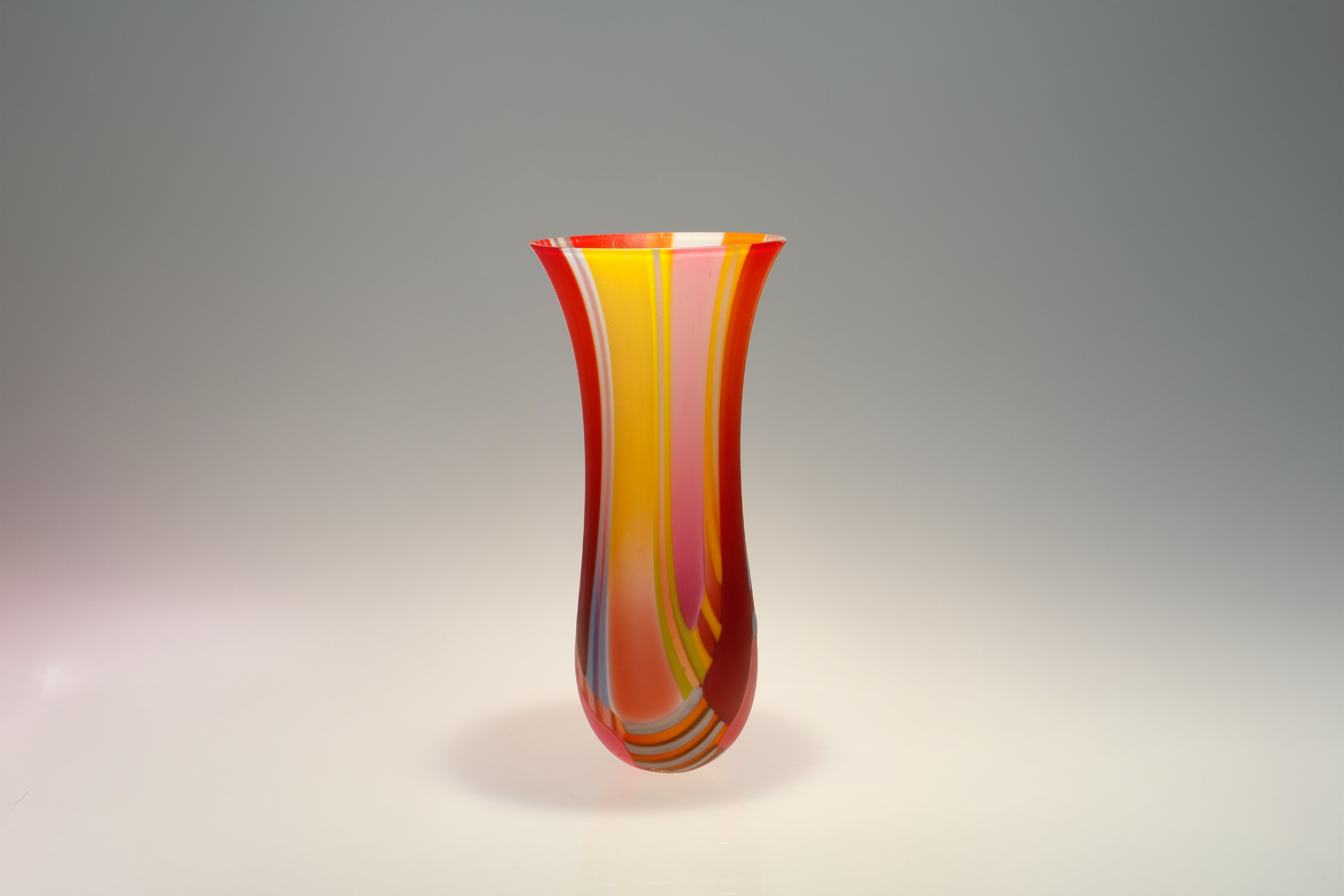 The Aurora collection is inspired by the colours of daybreak and explores the fusion of distinct bands of colour into unified vessels shaped by gravity. Ruth uses a fused glass technique reminiscent of the 'incalmo' method, achieving crisp, defined lines where colours converge. For London Glassblowing’s 50th anniversary, she incorporated gold compounds into rich pinks, purples, and reds, introducing gold nanoparticles into the glass. The resulting works celebrate light, colour, and the luminous beauty of gold, creating vessels that shimmer with warmth and intensity.