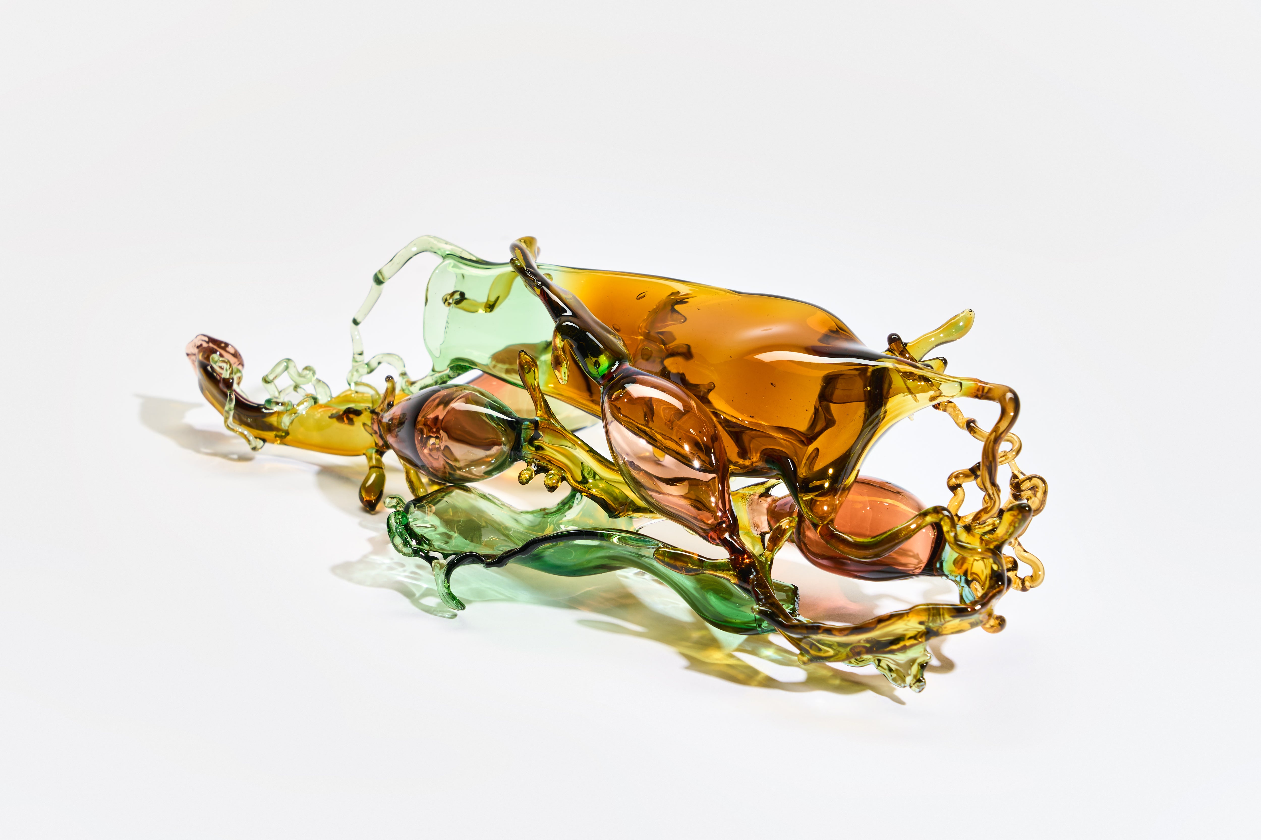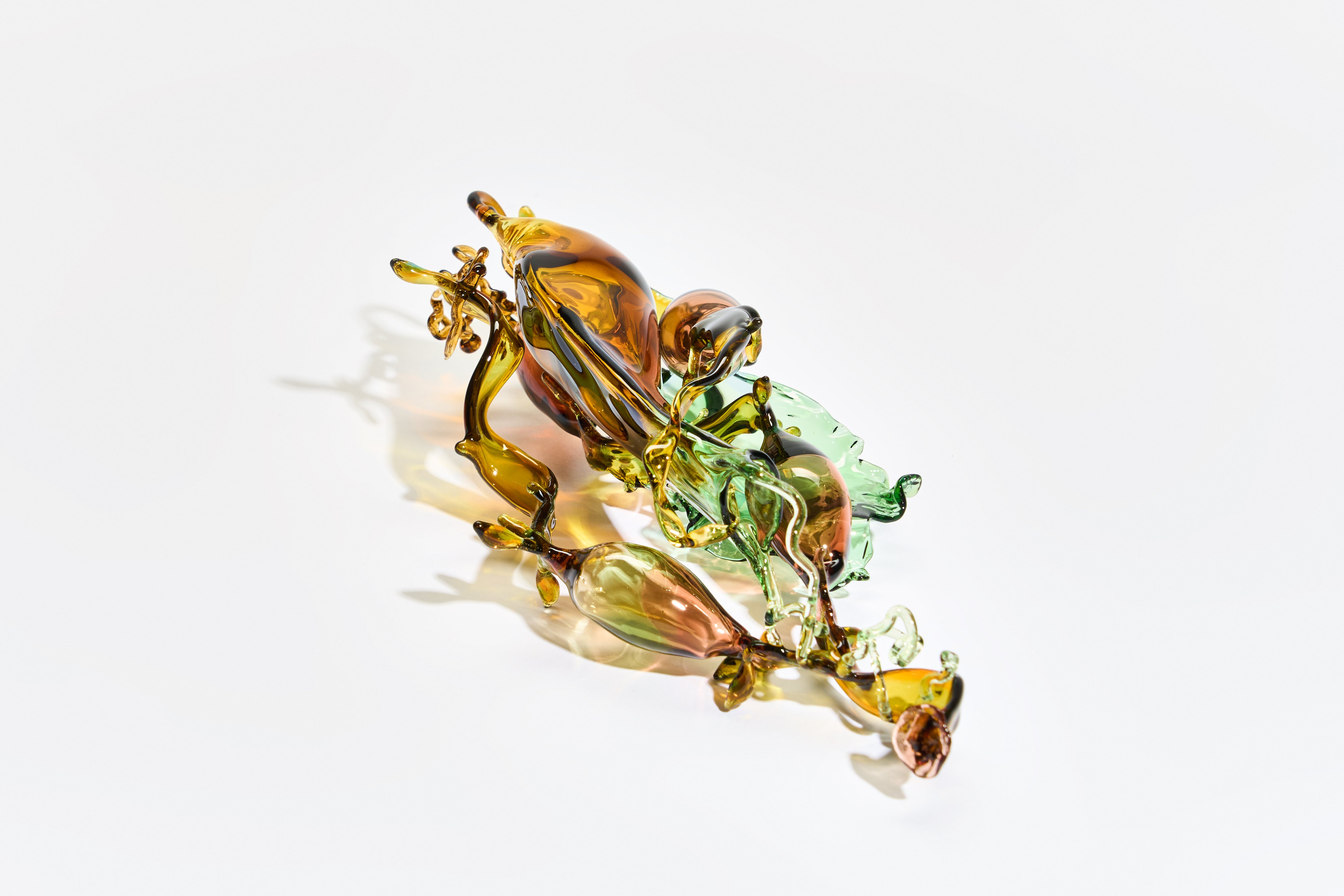 Lampworked glass, displayed on a clear, perspex riser
