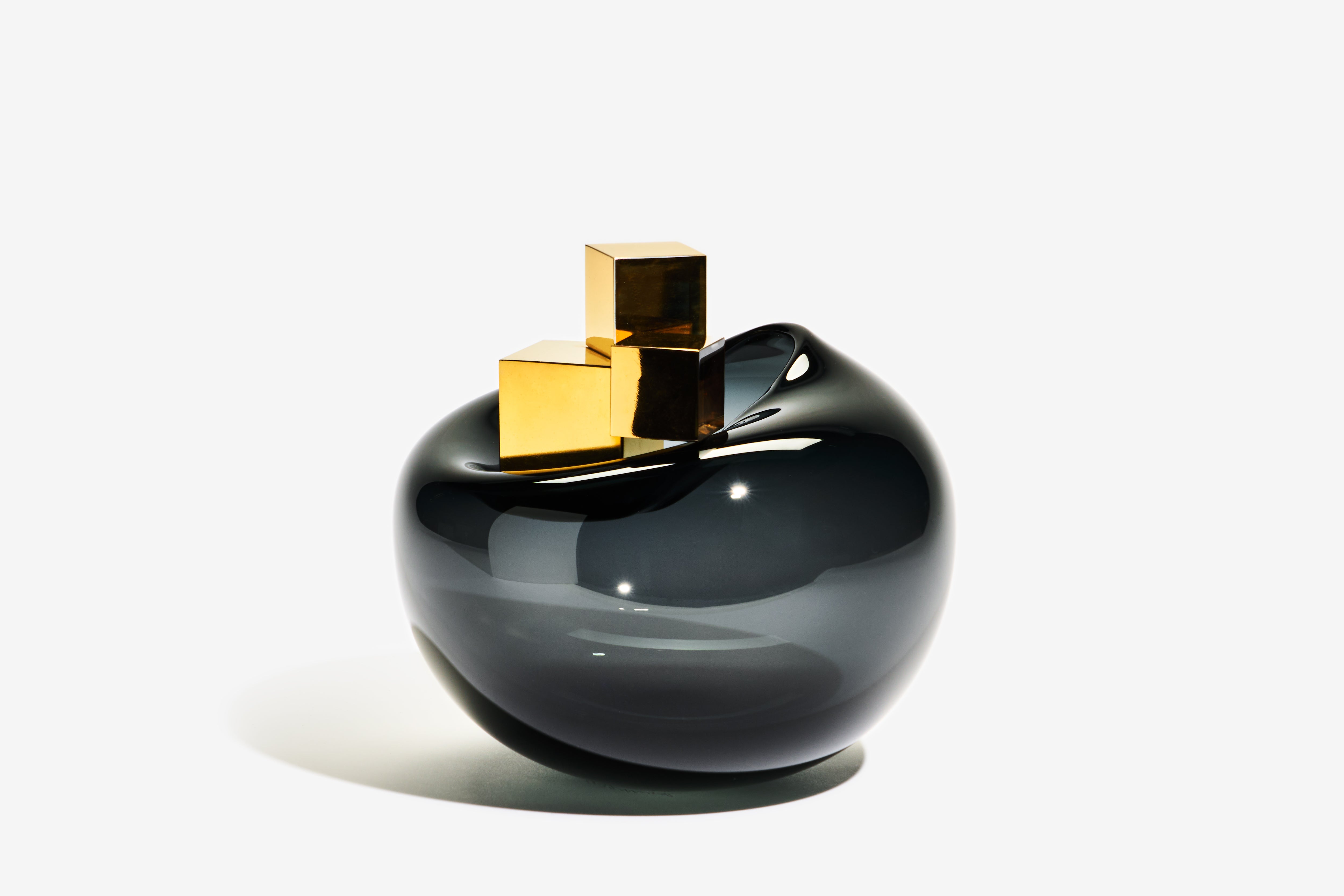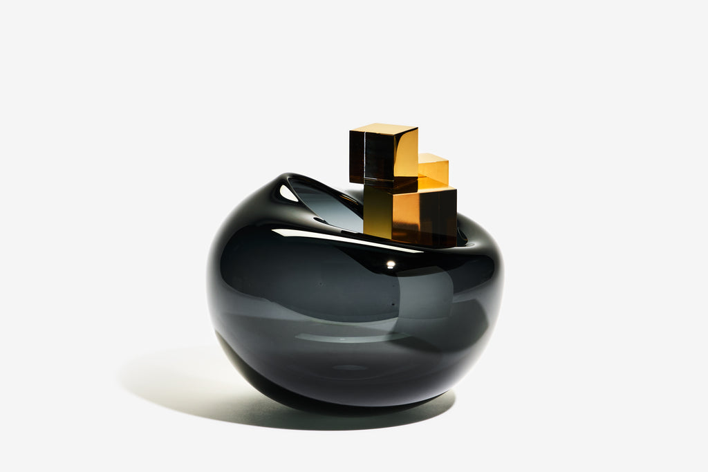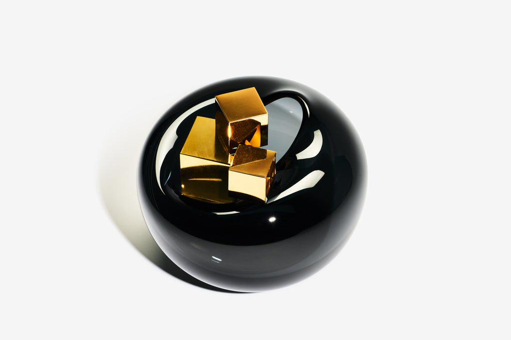 Freeblown glass with hot cast gold lustred cubes