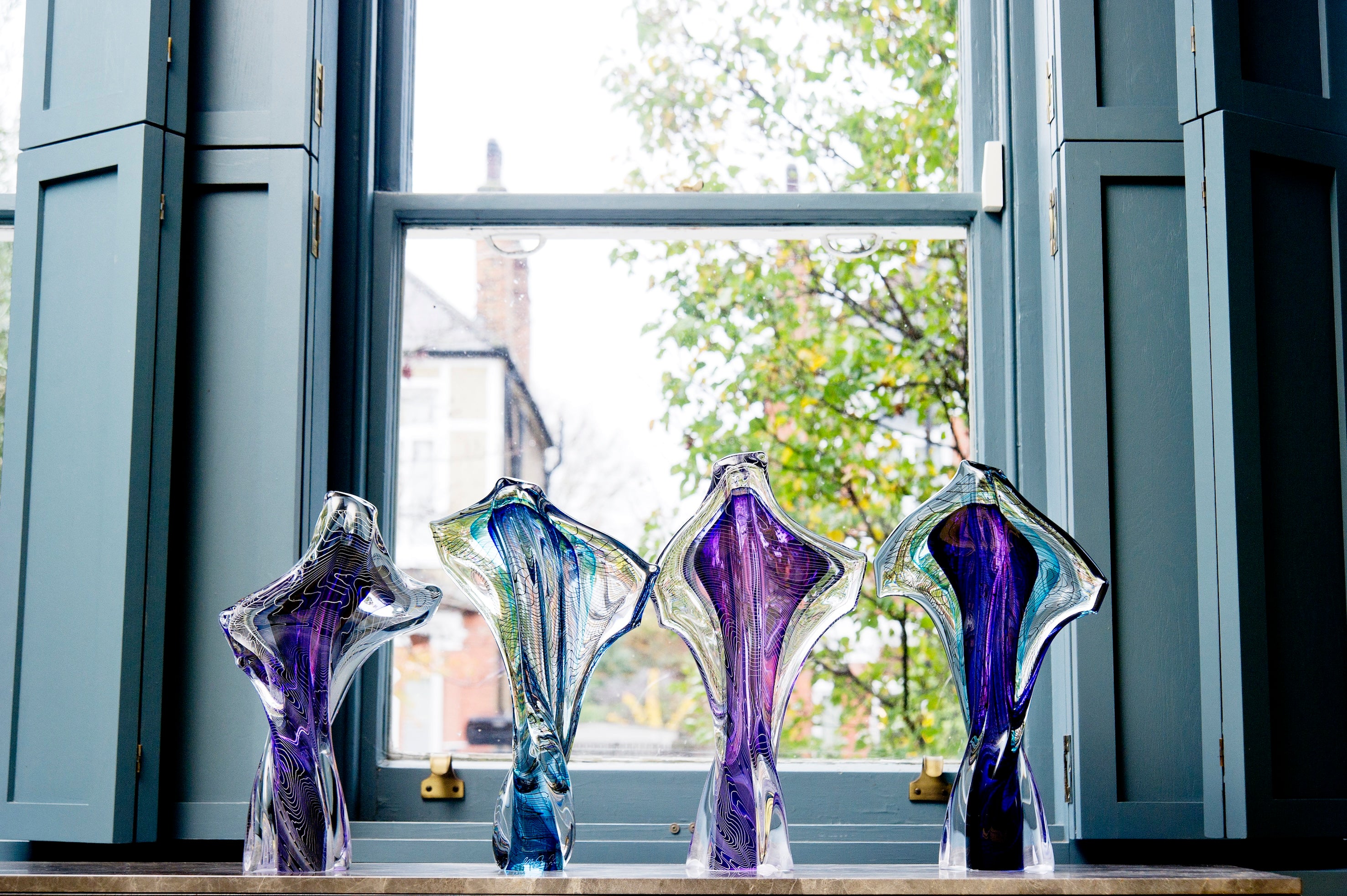 Milos is inspired by the striking white volcanic rock formations of the island, particularly at Sarakiniko Beach, where cliffs have been sculpted over millennia by wind and sea into smooth, otherworldly shapes. Close to Folegandros, Milos also holds a rich cultural heritage as the site where the Venus de Milo was discovered. Peter has long admired Cycladic art, with its elegant, minimalist figurines, and in this series he makes his first exploration of figurative glass.