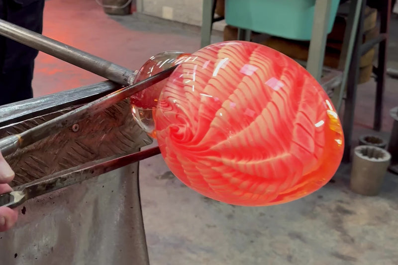 This series represents Peter‘s ongoing pursuit of organic pattern by varying the scale, movement, colour and tonal modulation of its constituent elements. The cresting, spiralling, feathery patterns are achieved through the creative use of an internally ridged optic mould.