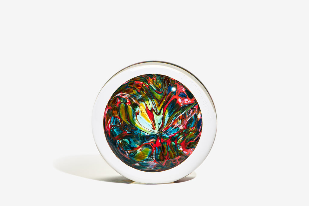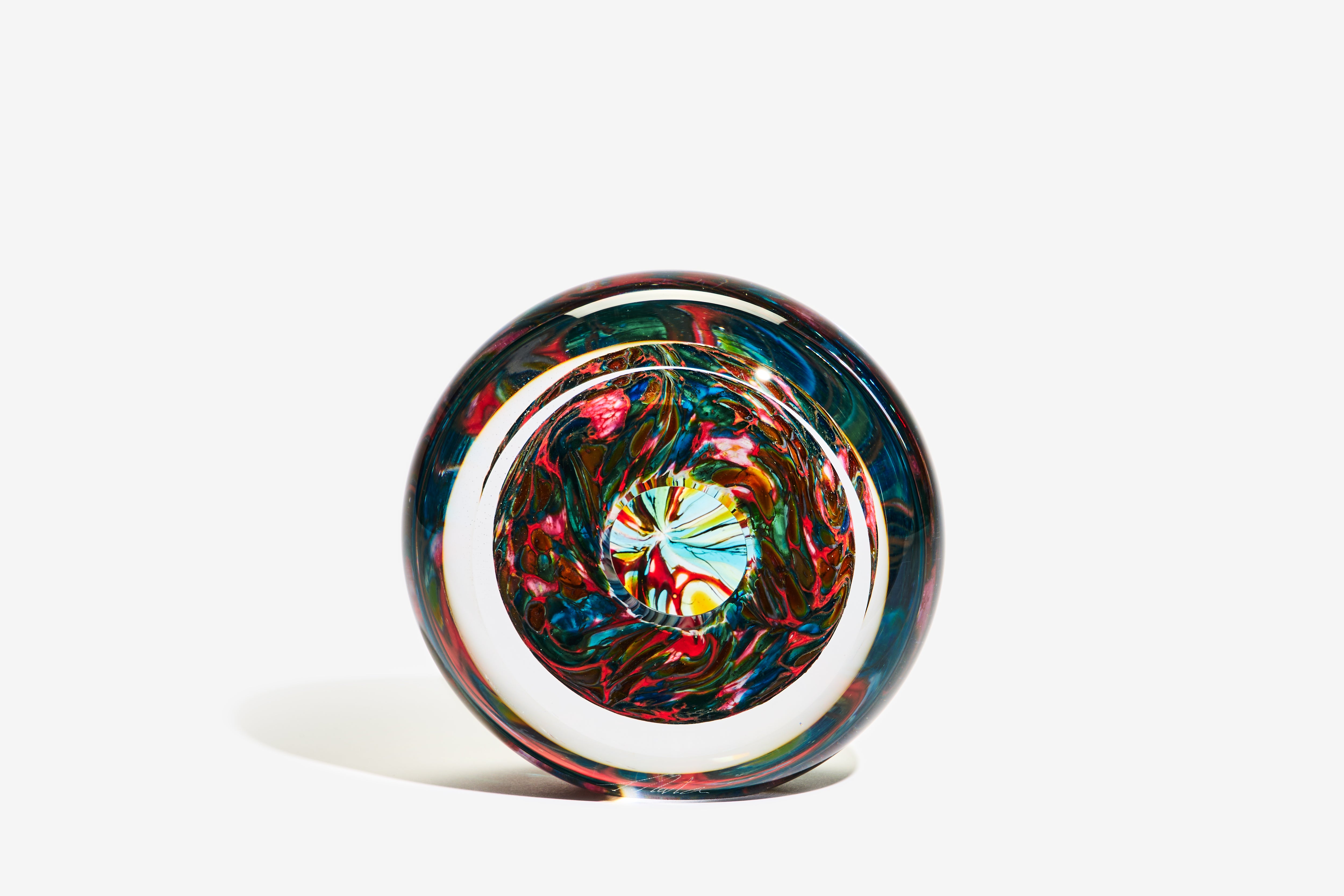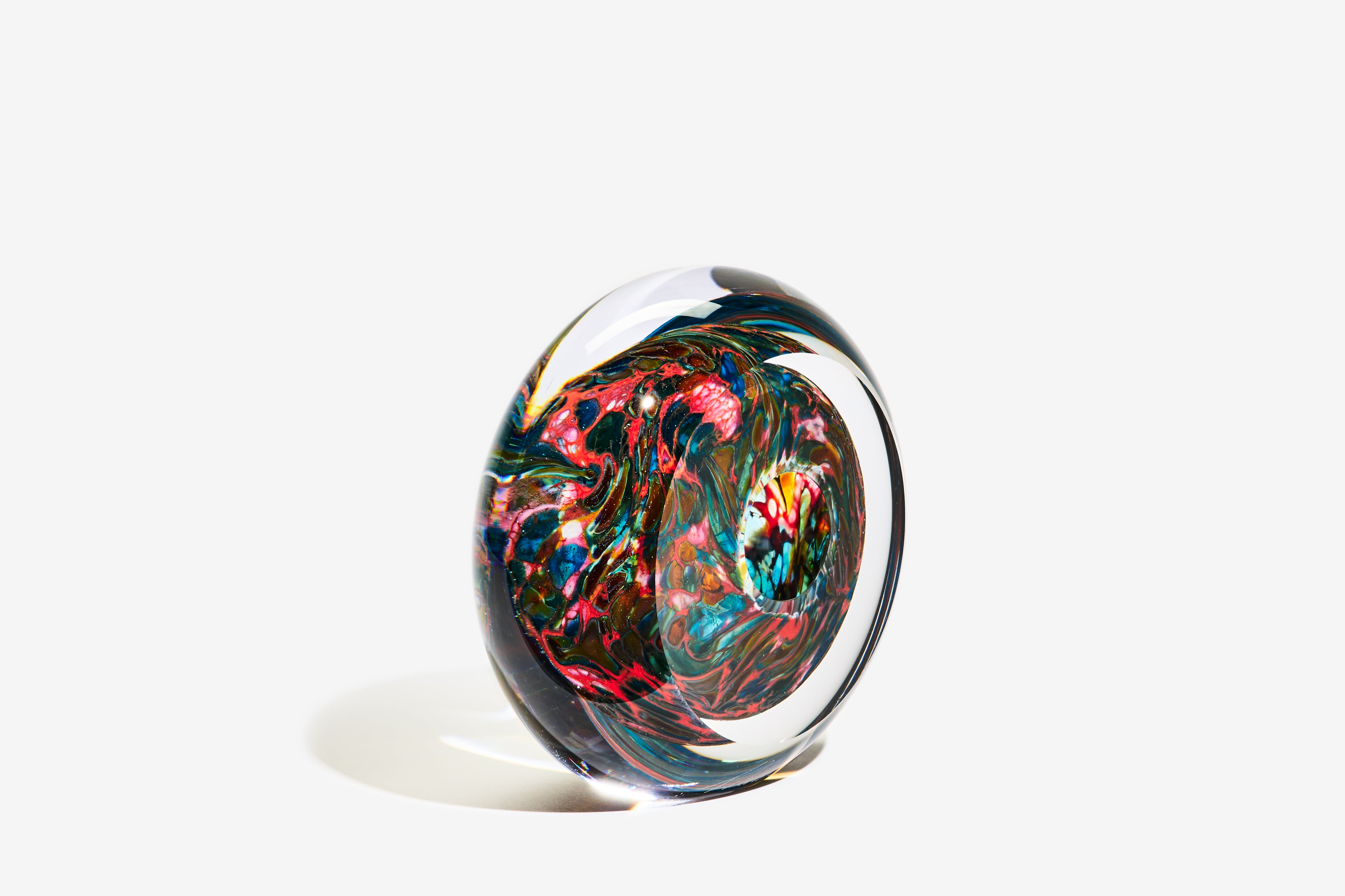 Tim Rawlinson's Aquarius series draws inspiration from the distant ice giant planet Neptune, reflecting its distinctive turquoise colouring and swirling atmosphere. The internal patterns capture Neptune's famous storms and cloud movements, while amber details echo the planet's atmospheric features.