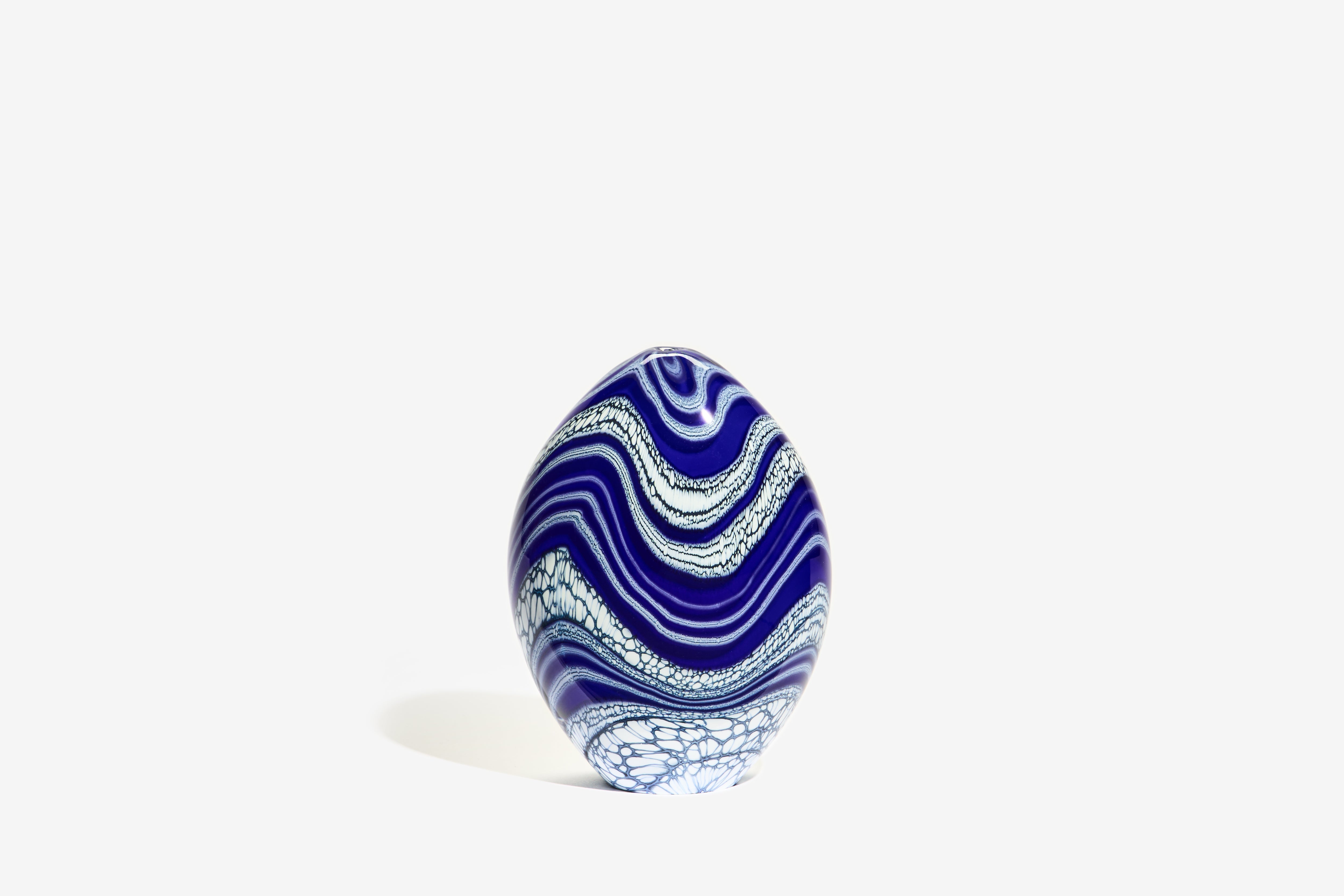 Glacier was inspired by Peter’s winter train journeys through Kent during the 1990s, where snow settled in layers over fields and hedgerows, and trees and bushes were silhouetted against pale grey skies. Fascinated by the graphic contrasts of black and white and the lacy effects of snow on branches, Peter developed a series with intricate textural composition. This latest iteration introduces a new colourway, incorporating crisp blues and icy tones, while etched surfaces enhance the silky, tactile quality. As with Kimono, the colours are applied to the exterior and etched, and flared shapes evoke both winter landscapes and glacial forms, capturing light, texture, and depth.