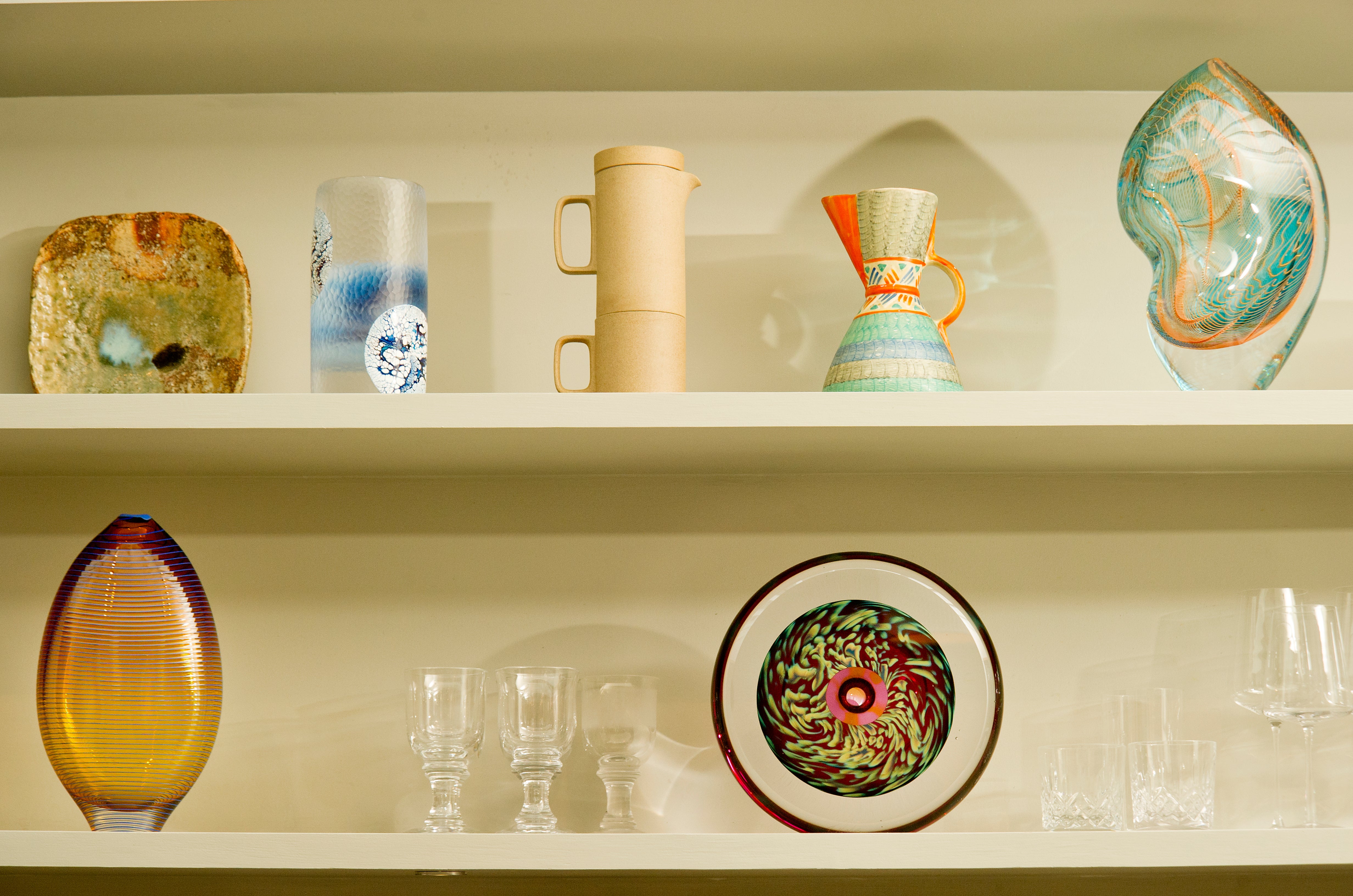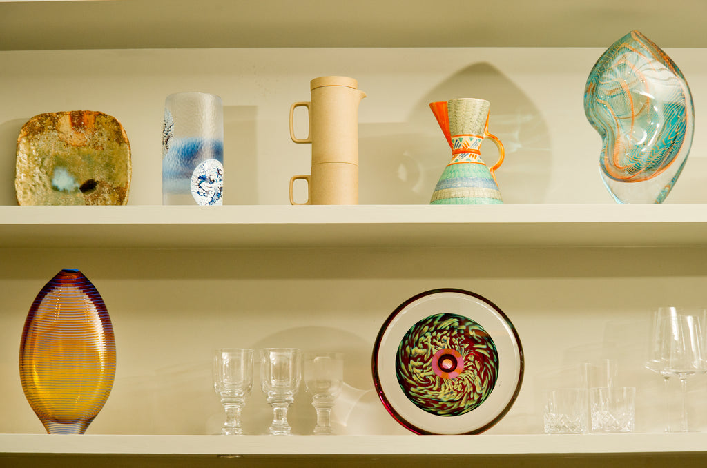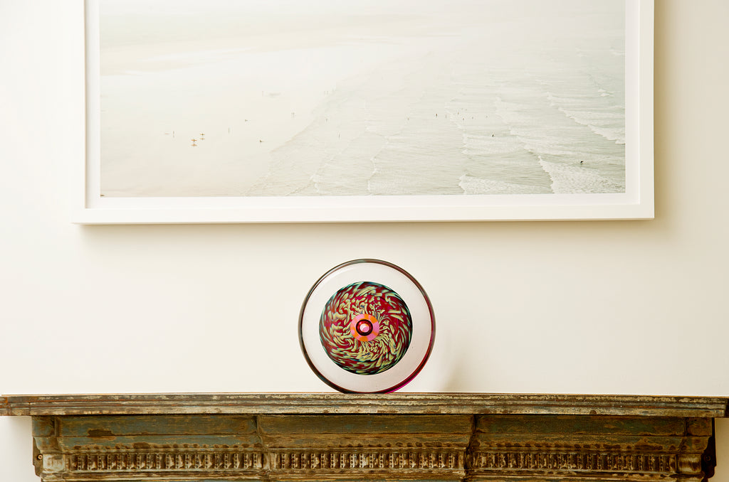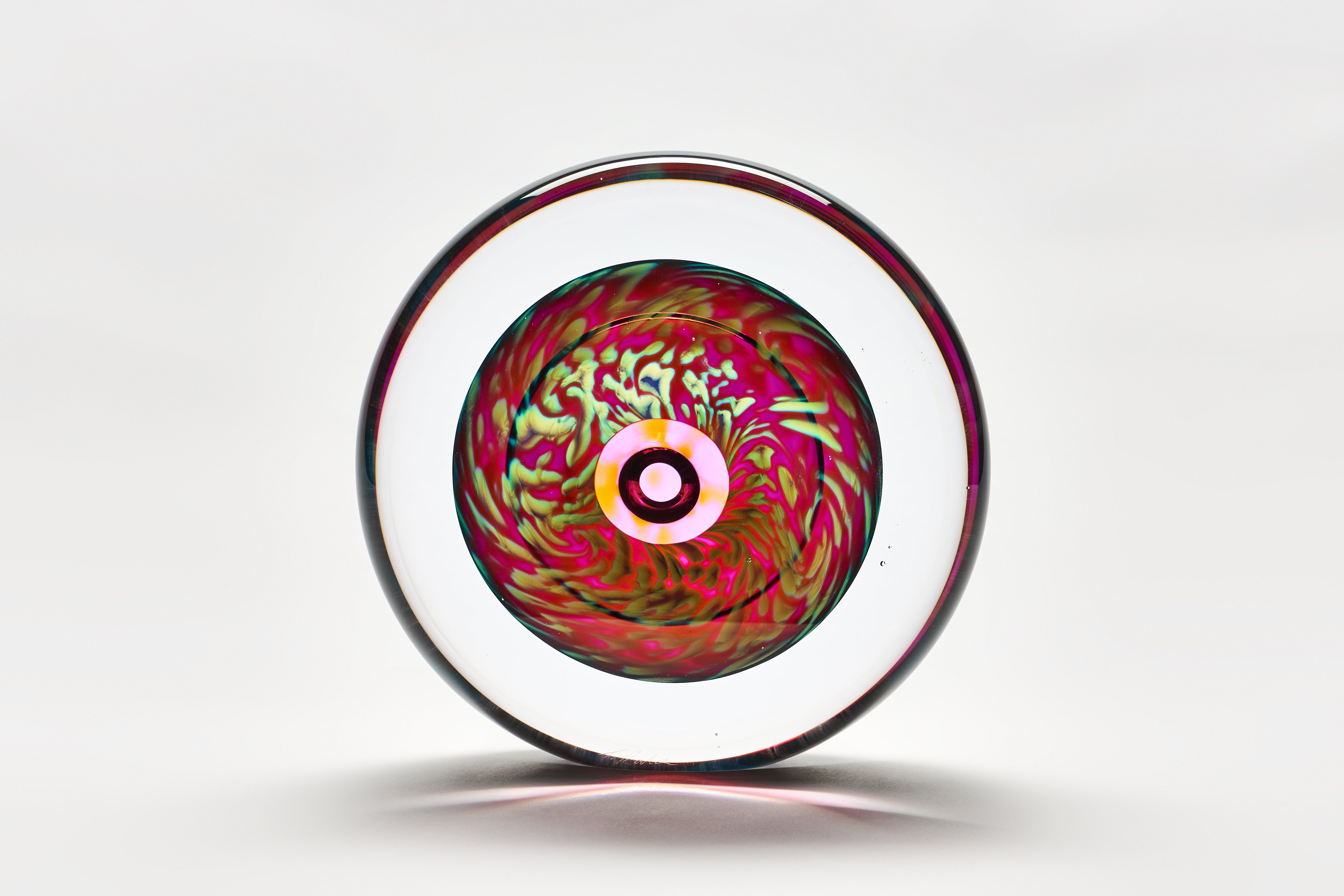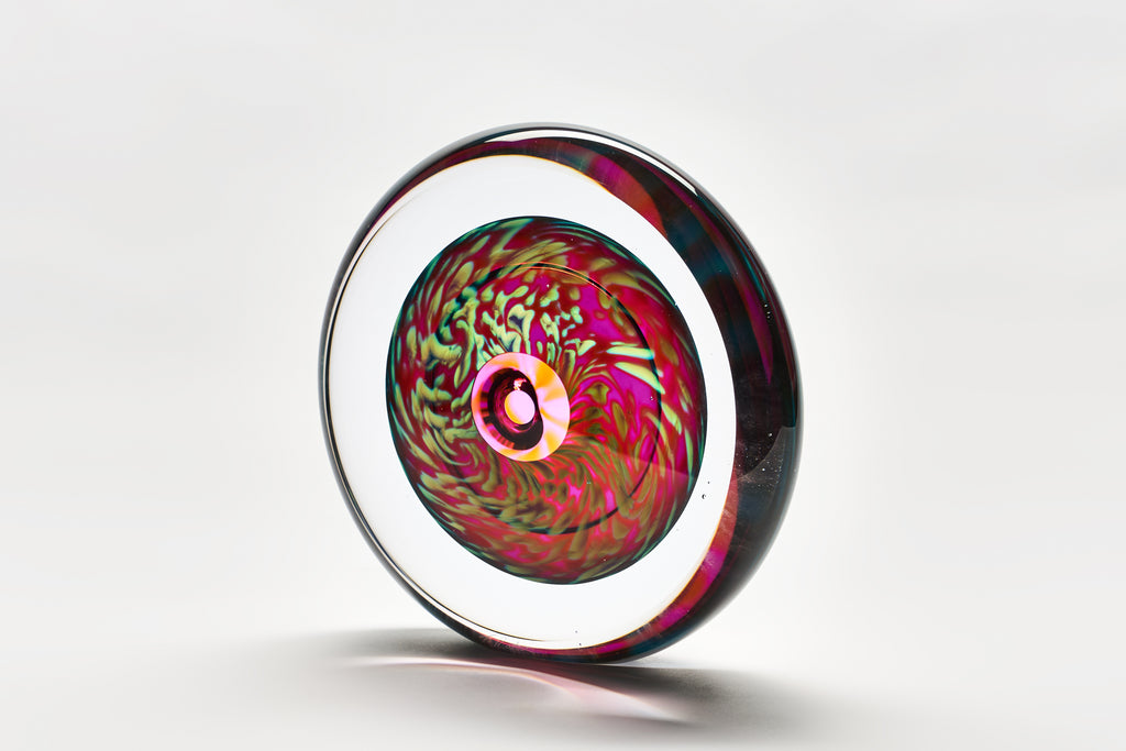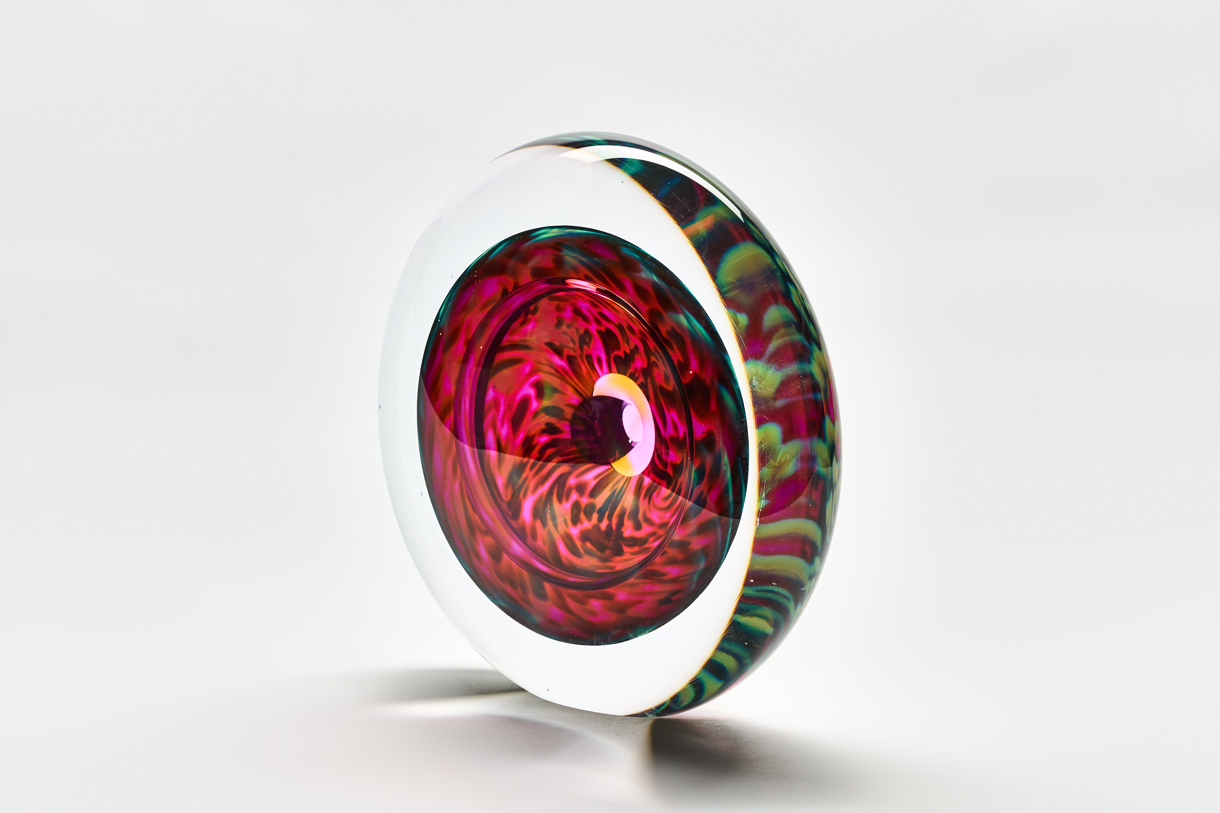 Telescopic photography of outer space has been a rich source of inspiration for Tim. The suspended ball of blown colour evokes a far off galaxy, a micro world encapsulated within the clear glass. Colour is used in a painterly fashion, building up layers of glass pigment. The glass colours in this work undergo a chemical reaction when mixed together in this way, creating rich gradients of colour.