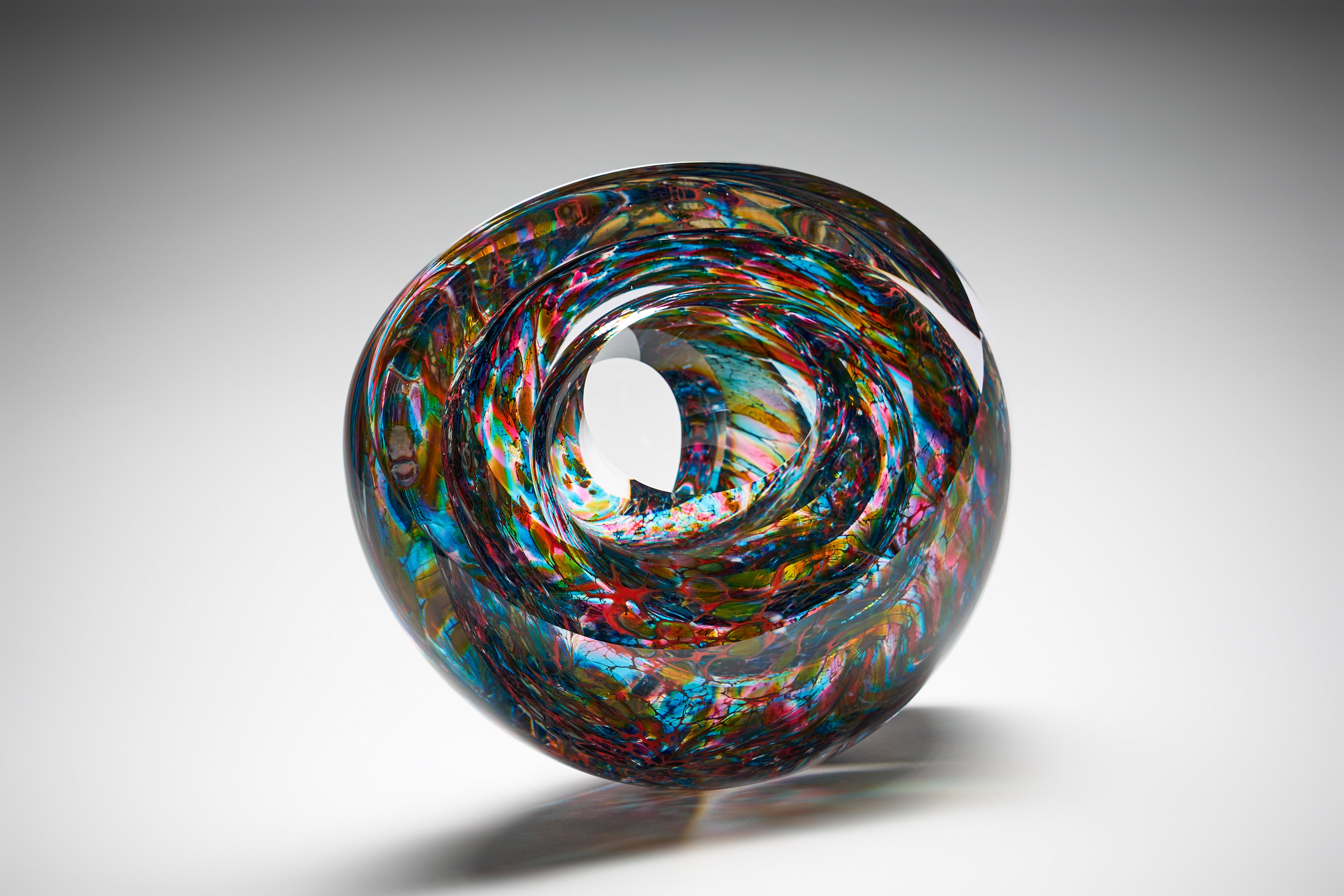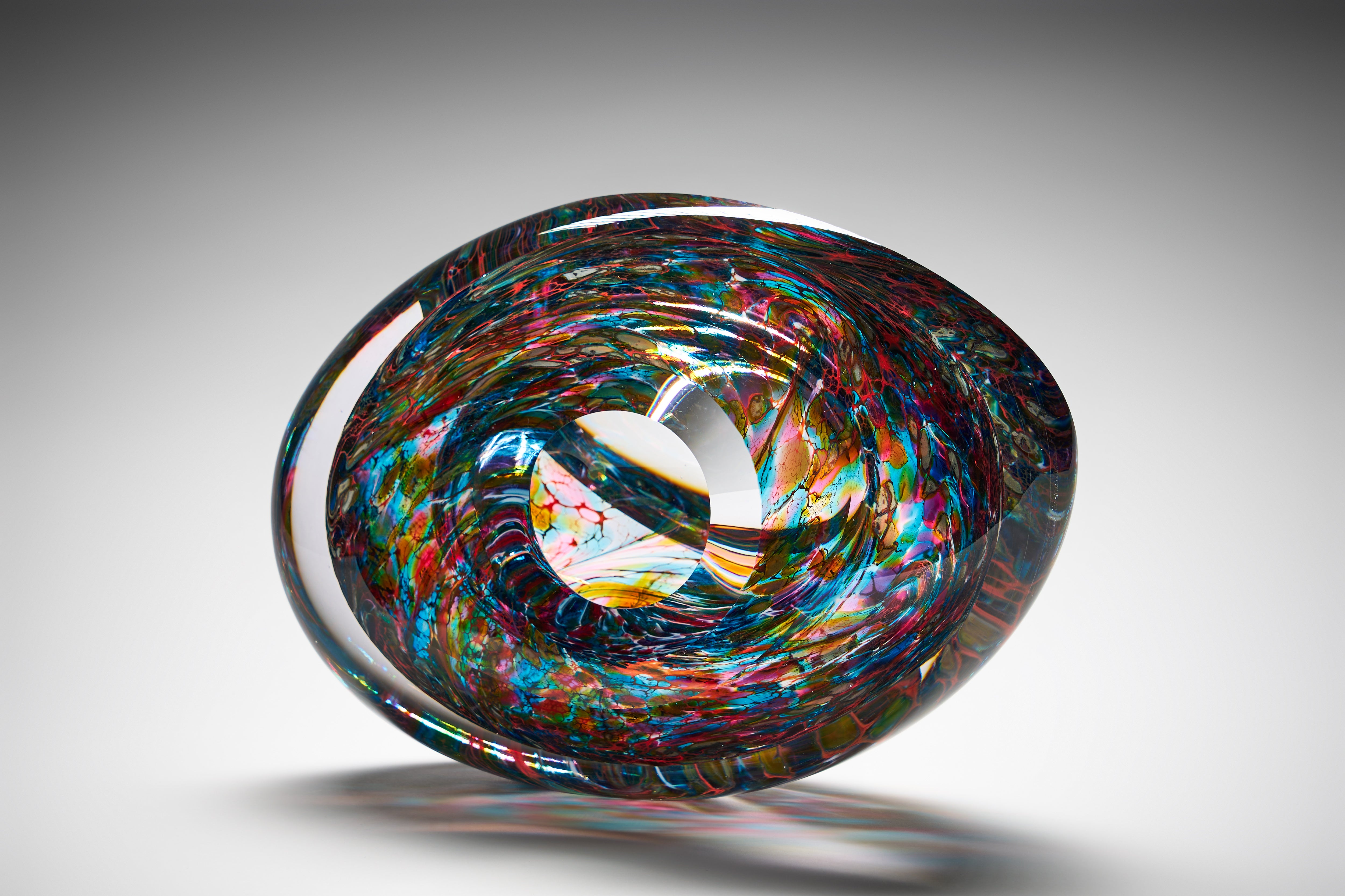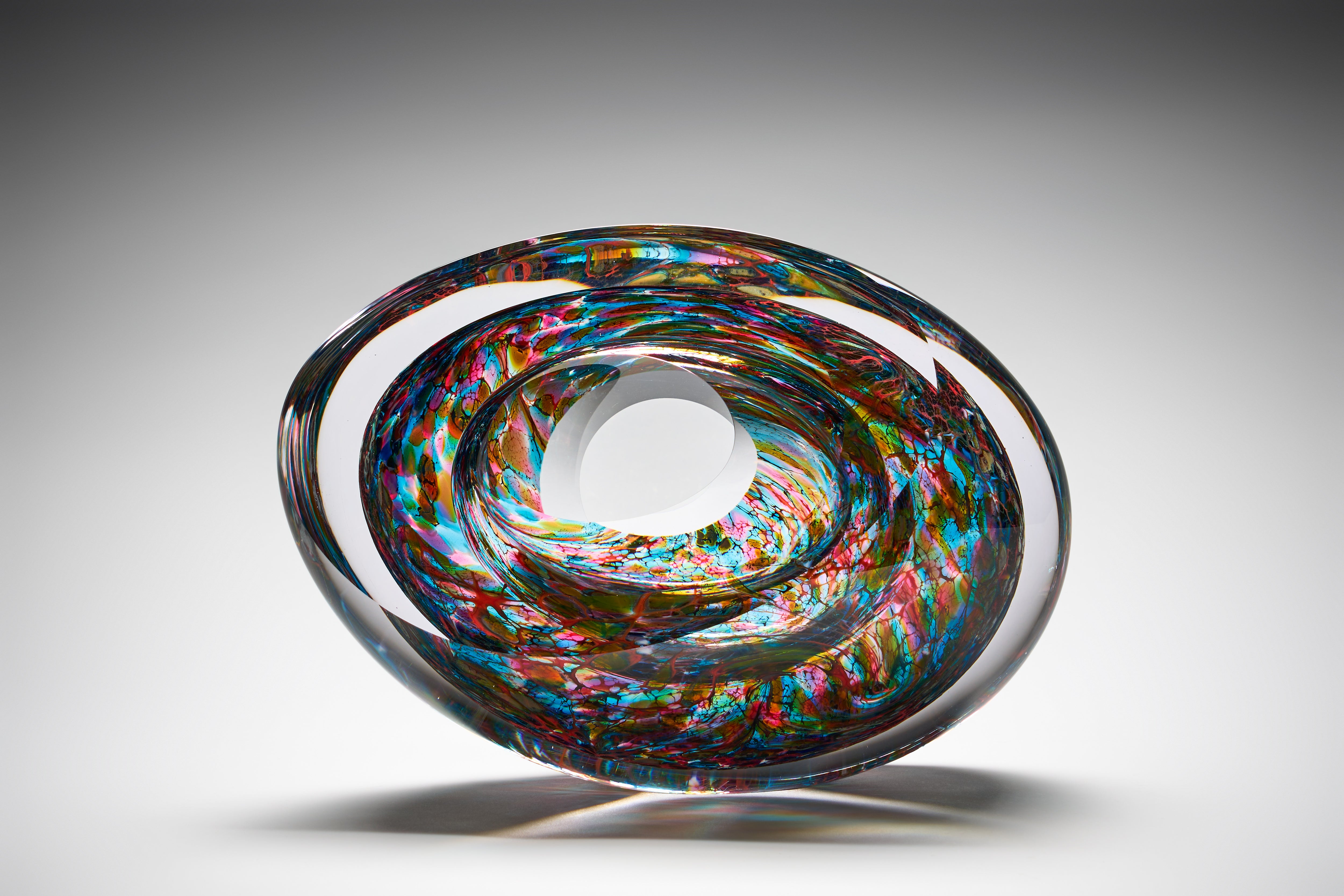 Within his Echoes of Light collection, Tim explores the interplay of colour, form, and transparency in glass, using its optical qualities to manipulate and expand light. The circular form, a universal symbol with no beginning or end, evokes notions of infinity, cycles of time, and planetary orbits.