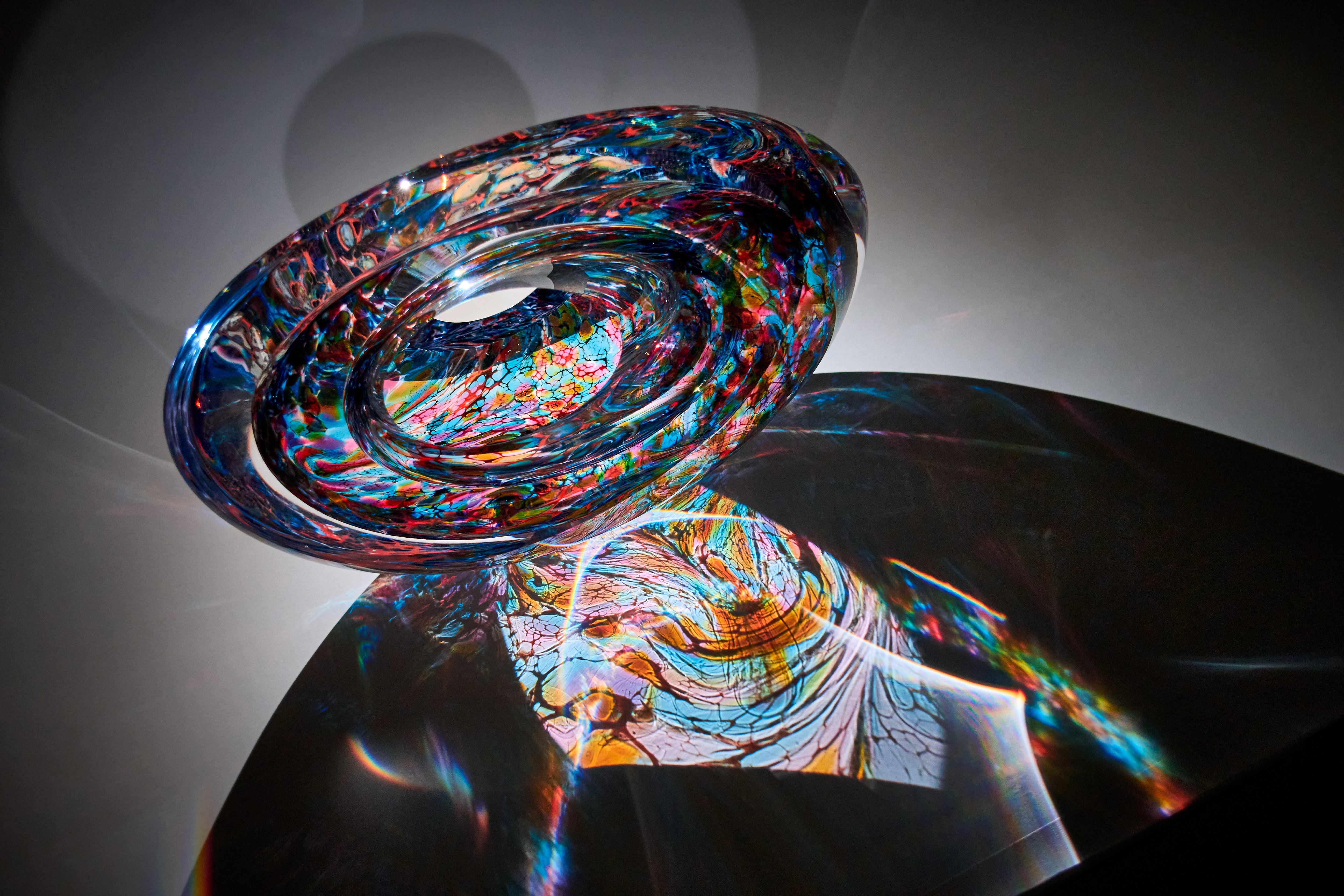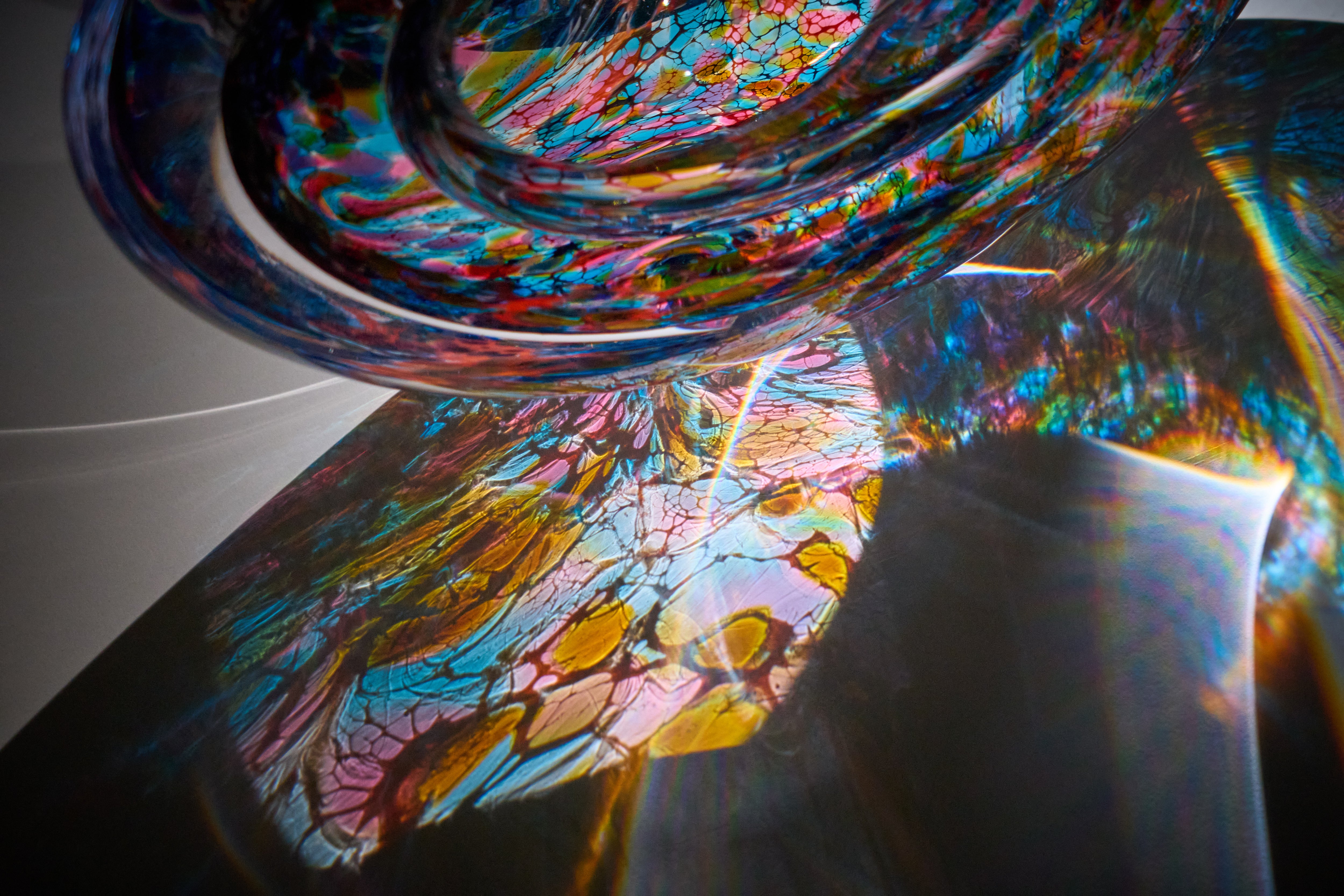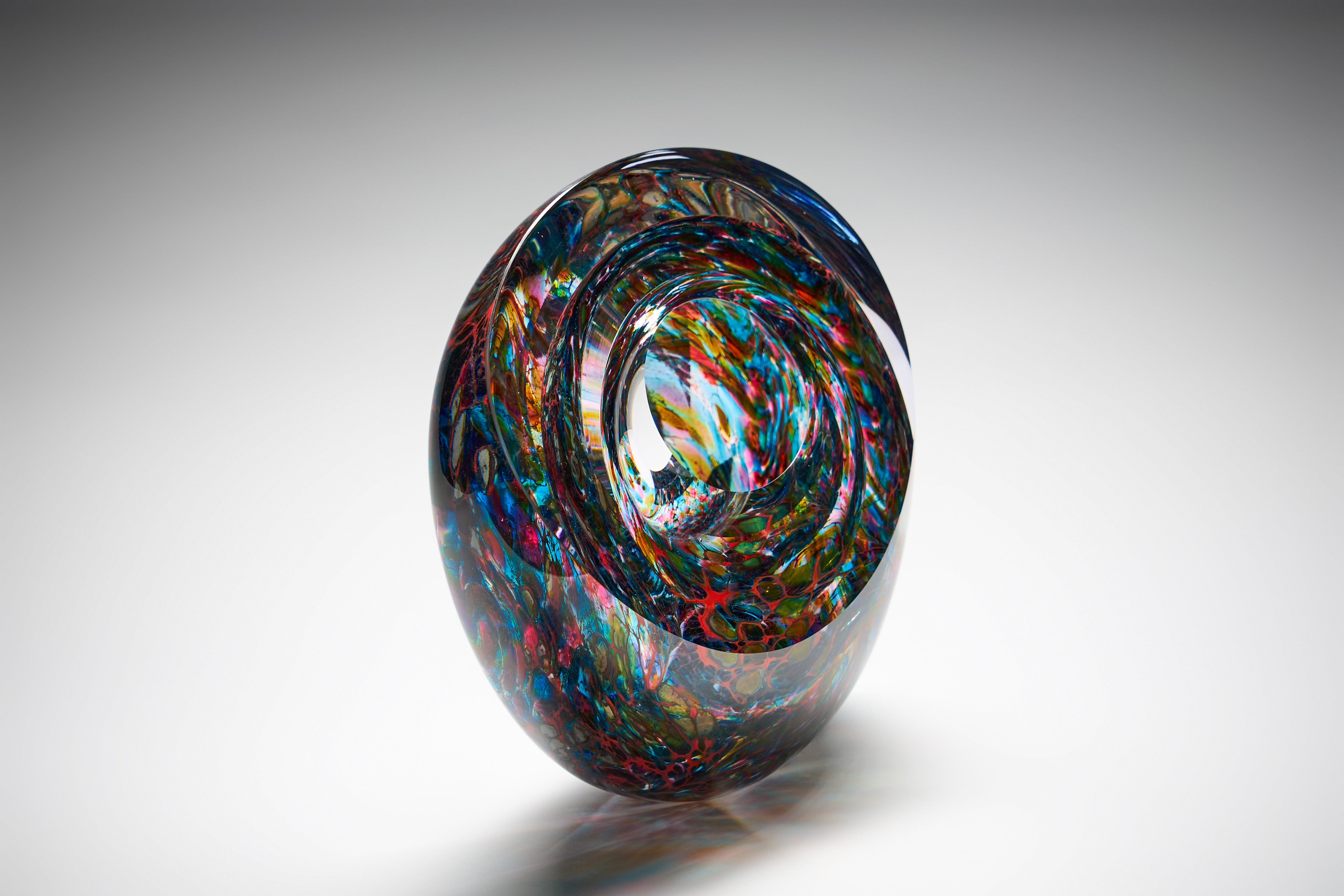 Within his Echoes of Light collection, Tim explores the interplay of colour, form, and transparency in glass, using its optical qualities to manipulate and expand light. The circular form, a universal symbol with no beginning or end, evokes notions of infinity, cycles of time, and planetary orbits.