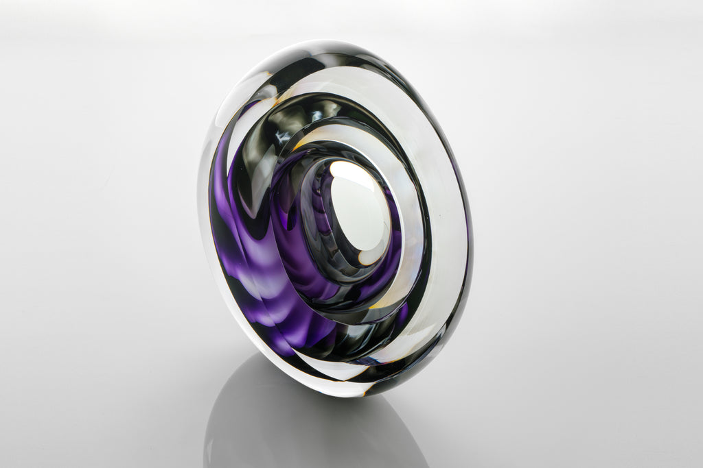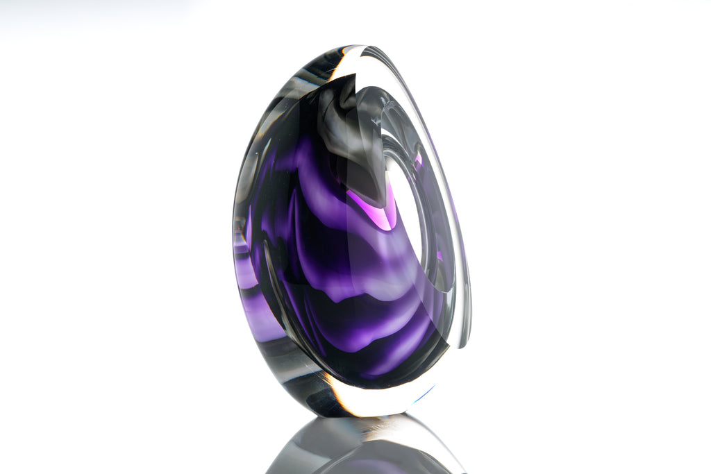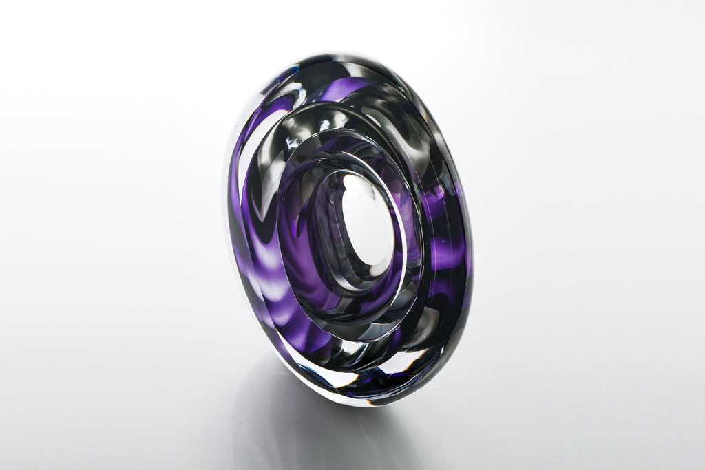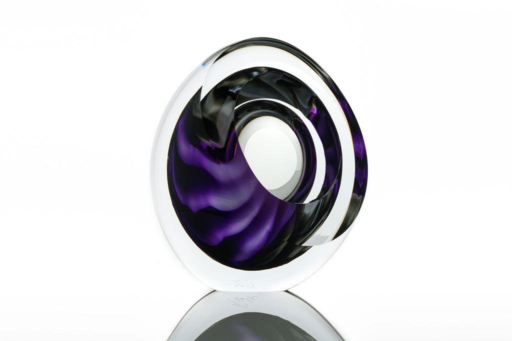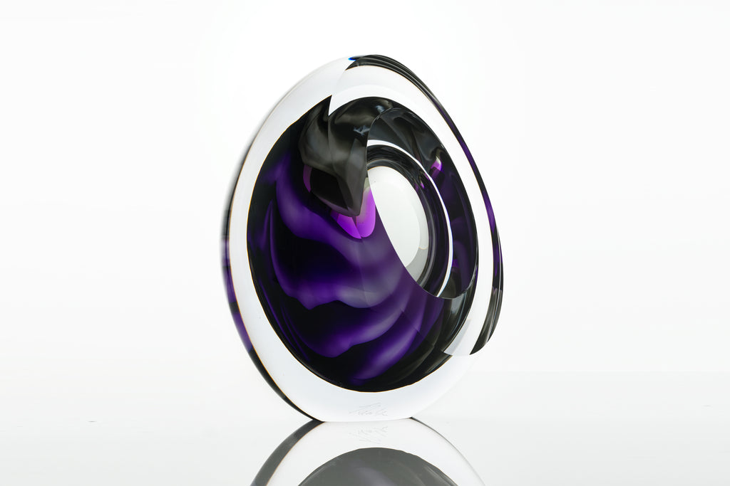 Fabrica Echo is a new development of Tim’s earlier Fabrica series, which was inspired by Caravaggio’s ingenious use of chiaroscuro—the Italian term for “light-dark”—where strong tonal contrasts suggest volume and depth. In Fabrica, this was expressed through the dramatic pirouetting of colour, enhanced by the natural shine of the glass. In Fabrica Echo, Tim merges this approach with his Echoes of Light concept, creating forms that capture both movement and reflection. For the first time in this series, he introduces opaque colours, offering a bolder visual impact while retaining the dynamic interplay of light and shadow. The result is a compelling evolution that emphasises contrast, texture, and the sculptural potential of glass as a medium.
