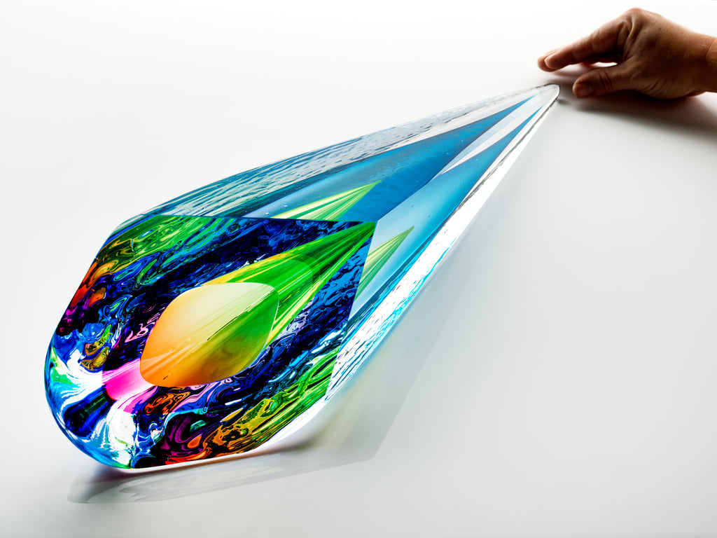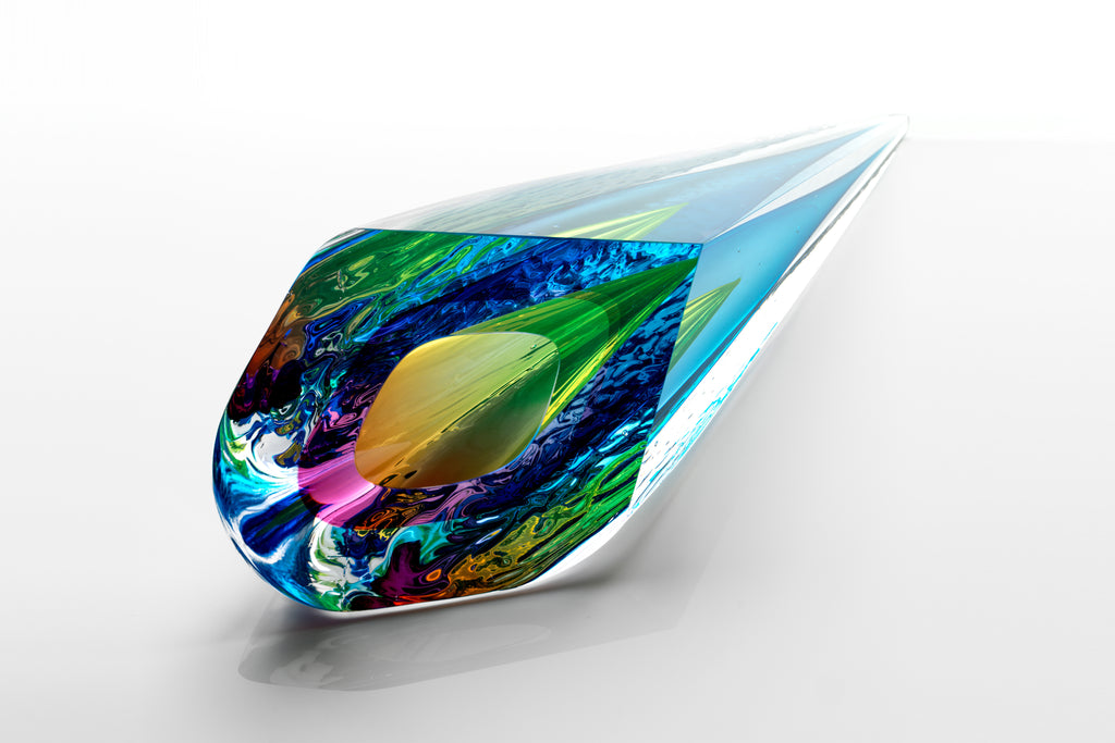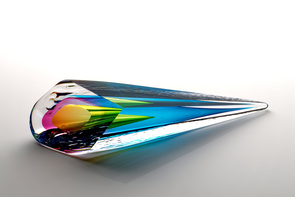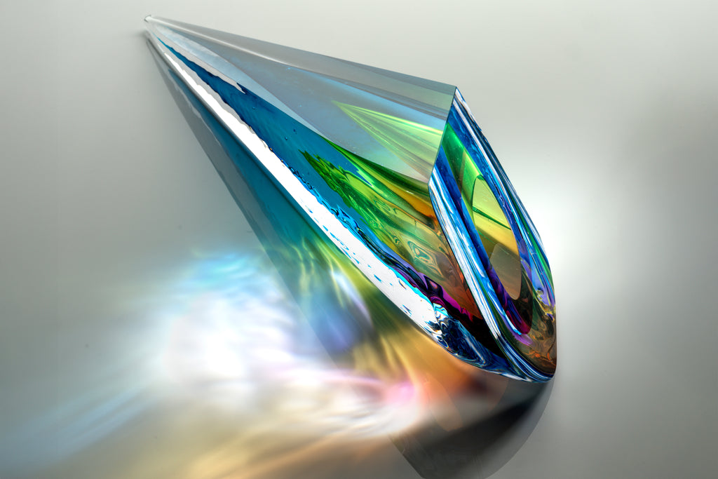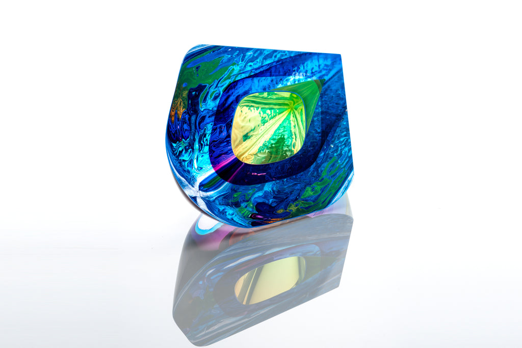 Liquid Light, previously known as Light Vortex, demonstrates how Tim continually revisits and evolves his work, exploring new ways to enhance light, colour, and form. In this unique piece, he has polished an additional facet, creating a fresh visual illusion and deepening the sense of dimensionality. Surface texture is achieved by chilling the glass while hot, producing delicate ripples that mimic sunlight dancing on water. Inspired by diving beneath the sea and observing how light refracts from above, Tim captures the dynamic patterns and ephemeral beauty of waves. The work invites the viewer to experience this interplay of light, movement, and depth, celebrating the fluid, ever-changing qualities of the natural world.