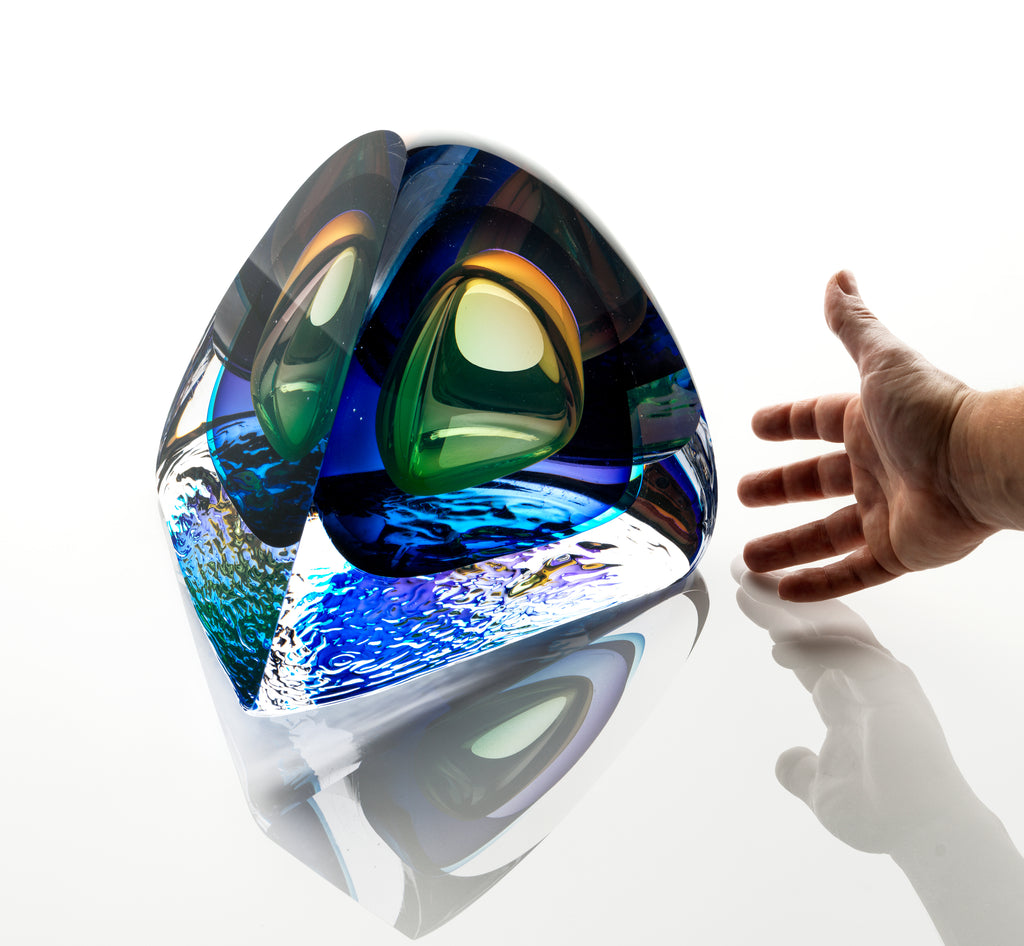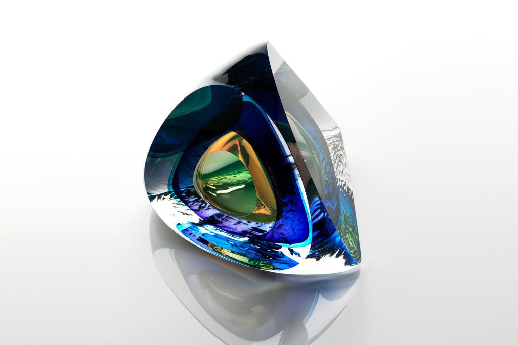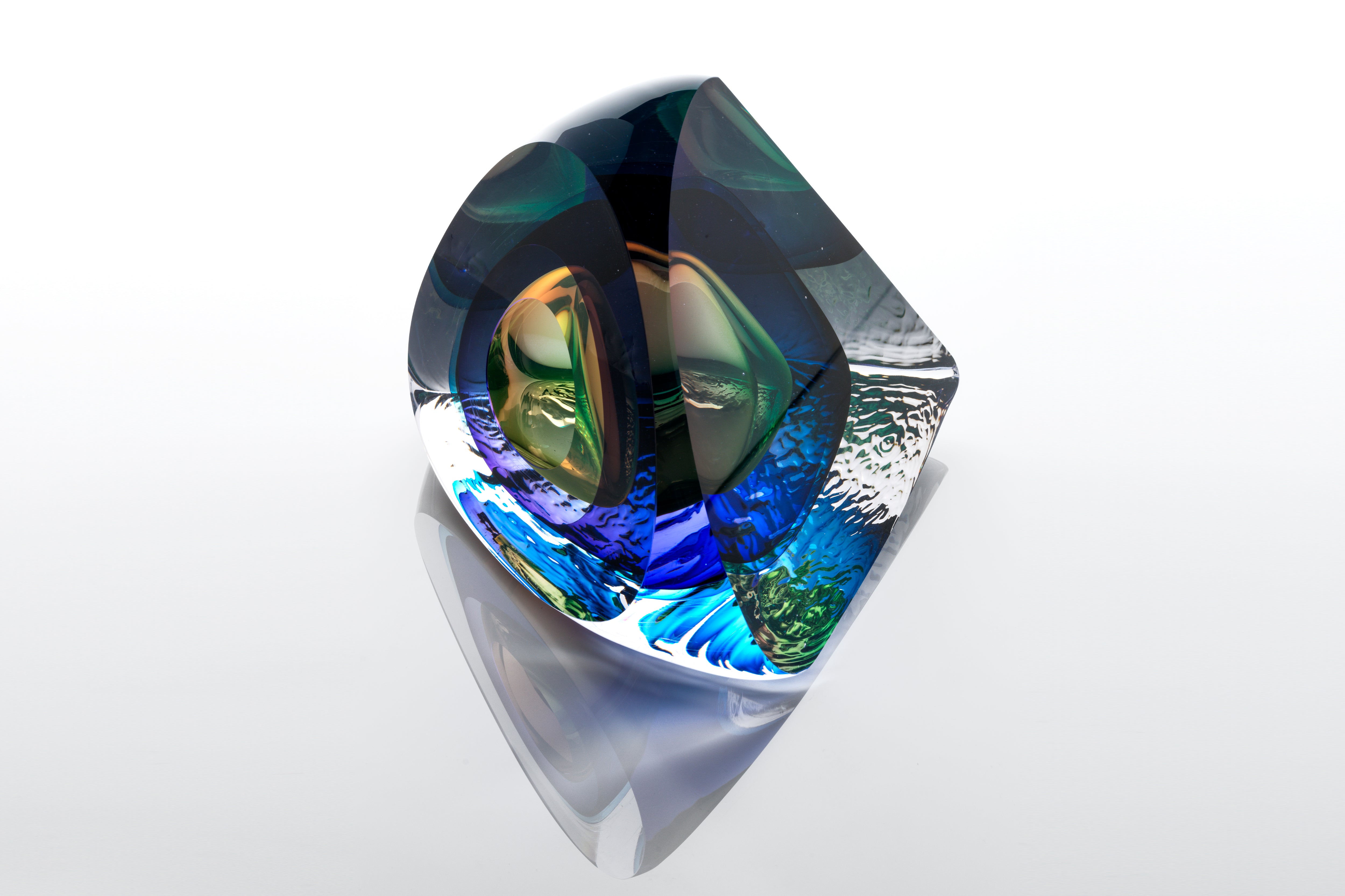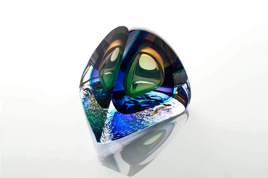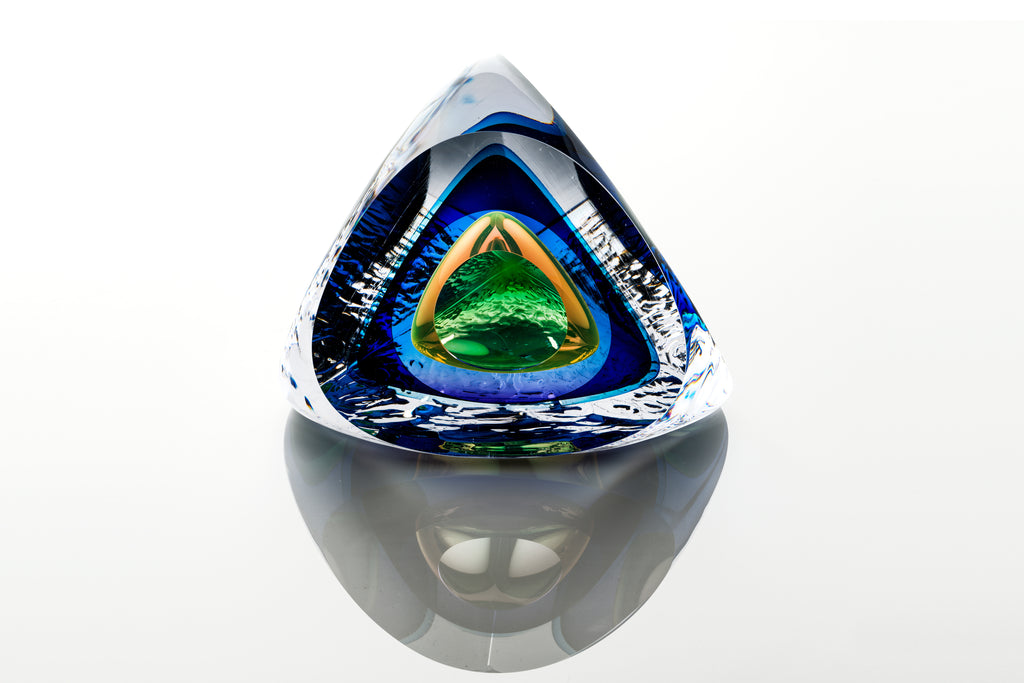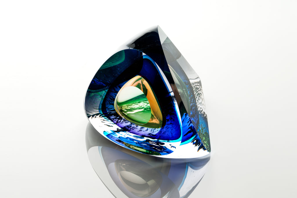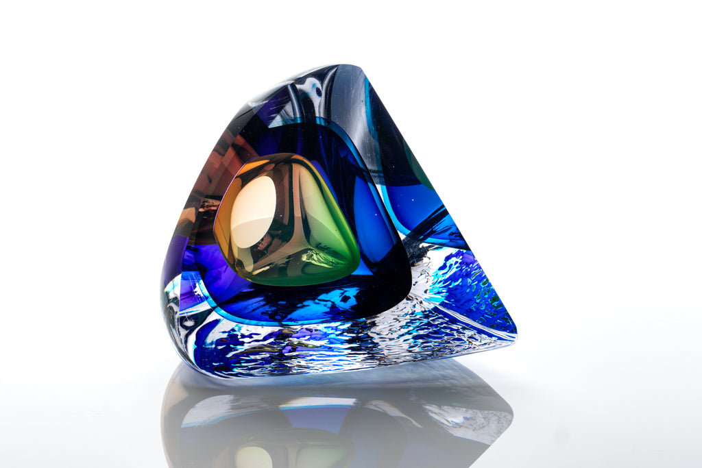 Liquid Light, previously known as Light Vortex, demonstrates how Tim continually revisits and evolves his work, exploring new ways to enhance light, colour, and form. In this unique piece, he has polished an additional facet, creating a fresh visual illusion and deepening the sense of dimensionality. Surface texture is achieved by chilling the glass while hot, producing delicate ripples that mimic sunlight dancing on water. Inspired by diving beneath the sea and observing how light refracts from above, Tim captures the dynamic patterns and ephemeral beauty of waves. The work invites the viewer to experience this interplay of light, movement, and depth, celebrating the fluid, ever-changing qualities of the natural world.