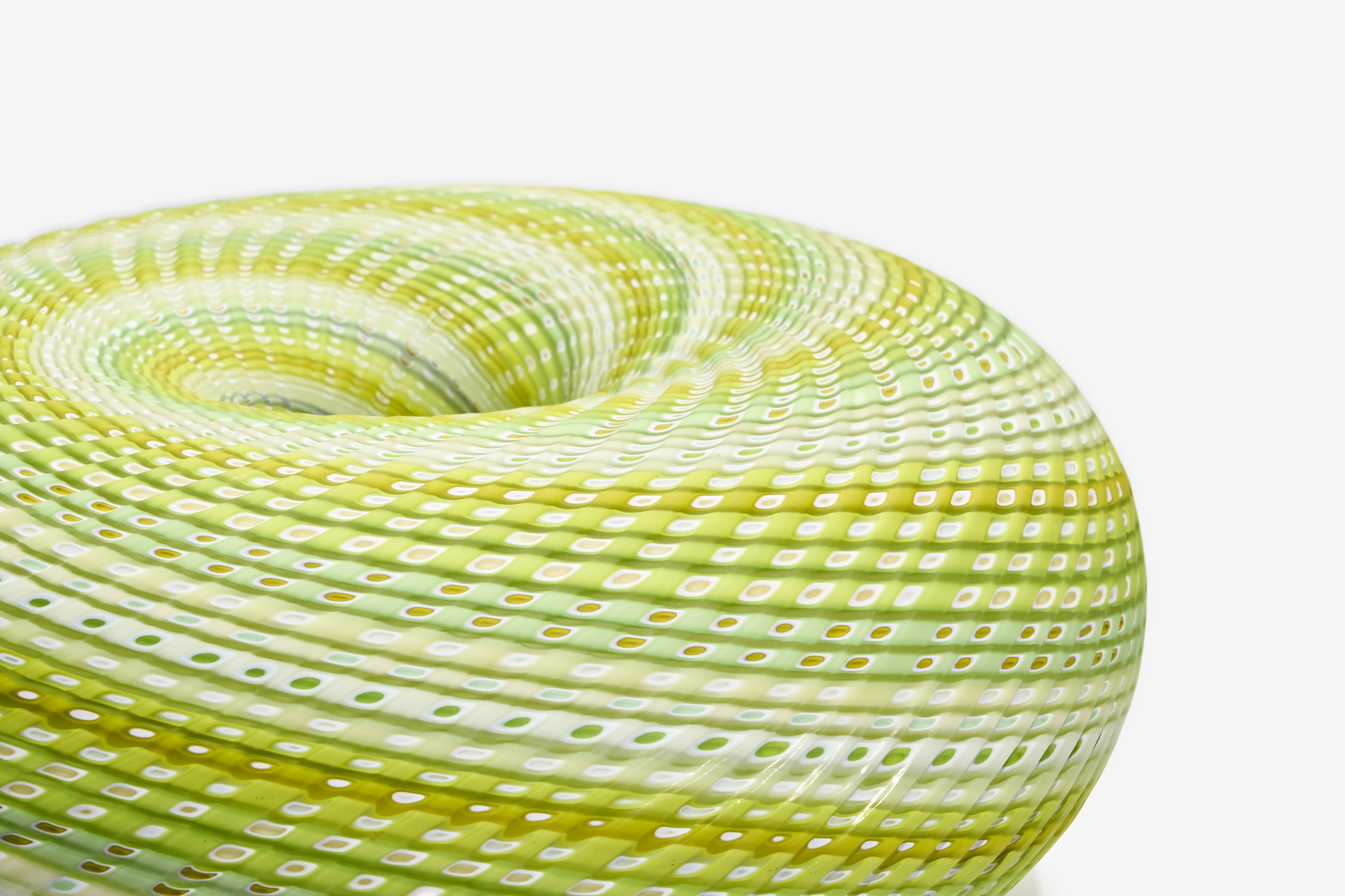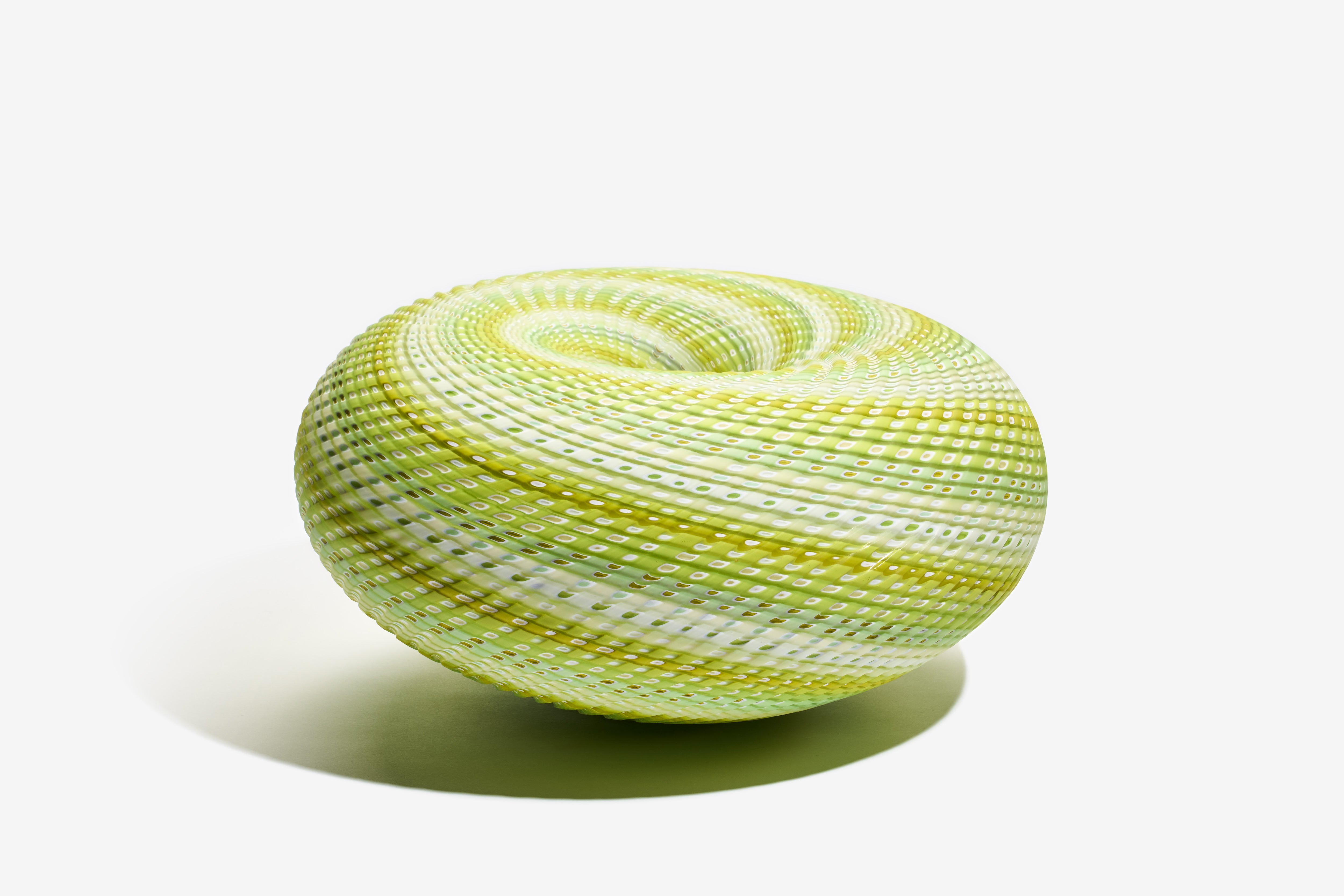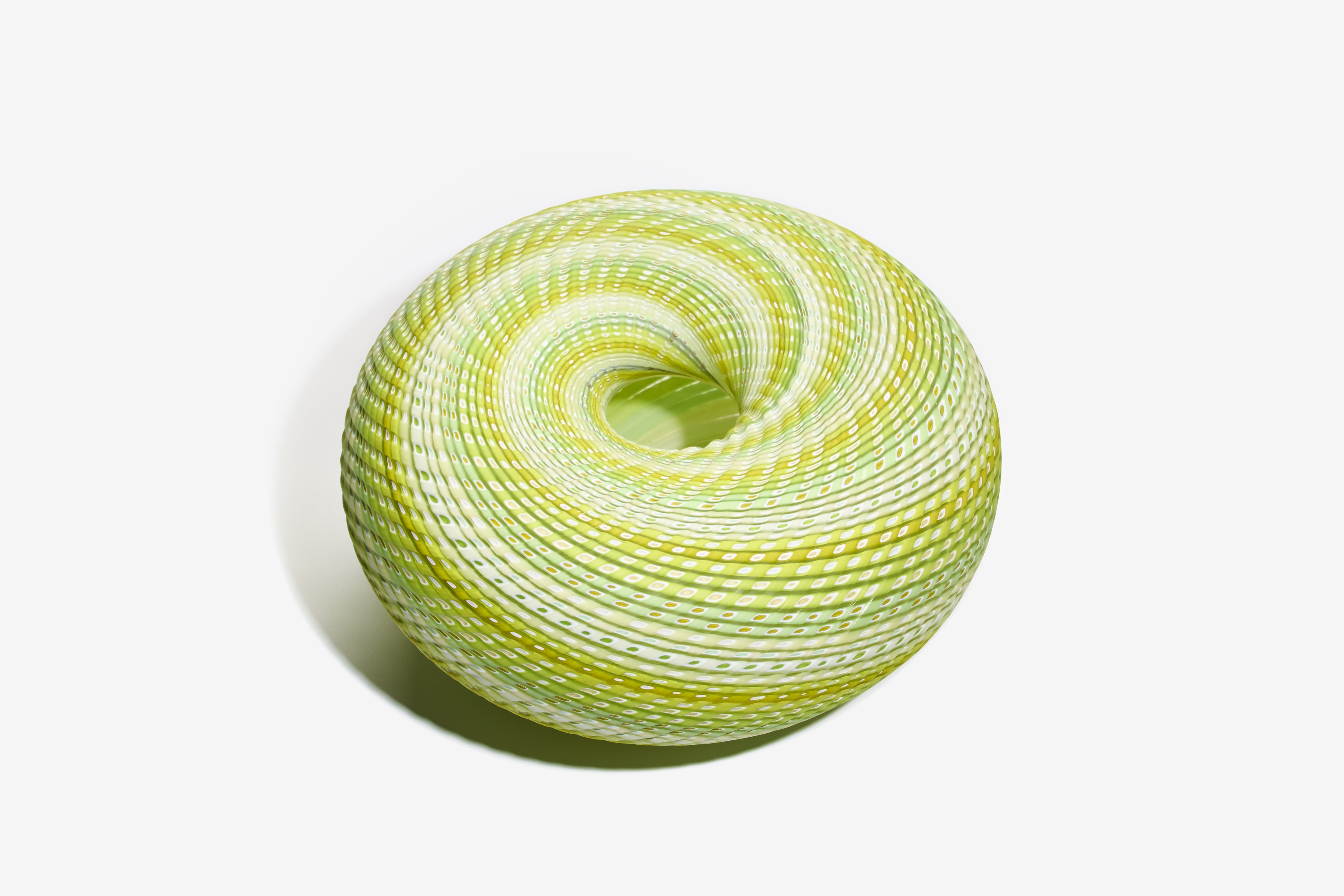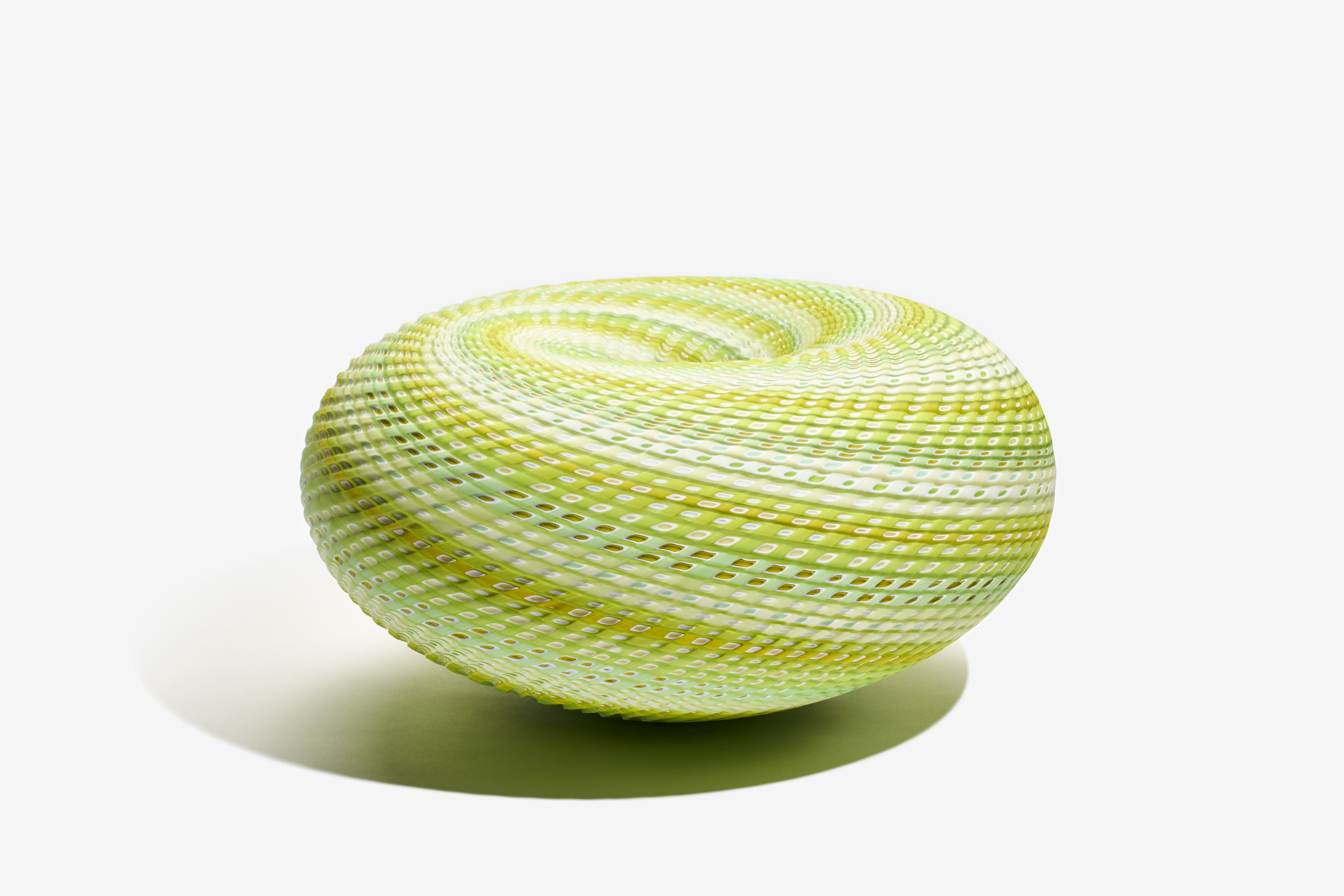 Layne’s Woven Forms are inspired by the Devon coastline and have been evolving for several years. This series of work is a result of intricate layering of different pre-made coloured canes around a molten form that is twisted and, when cold, cut into with a diamond wheel, to reveal vibrant colours beneath the surface. The effect is like water over precious stones or the rock with its glimmering colours beneath, reflecting natural growth and corrosion. Exclusively for Collect, Layne has introduced a new colourway in citron green.