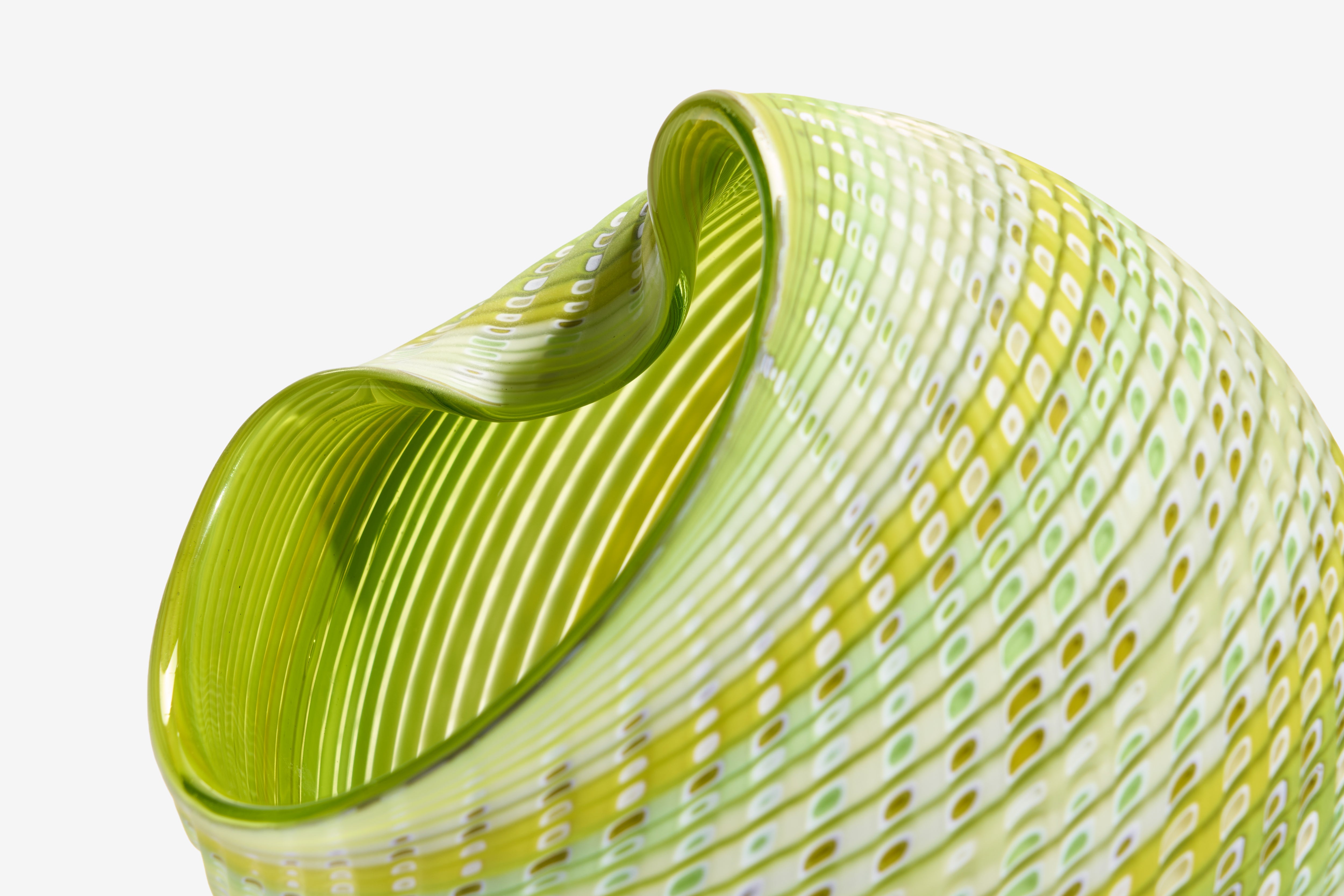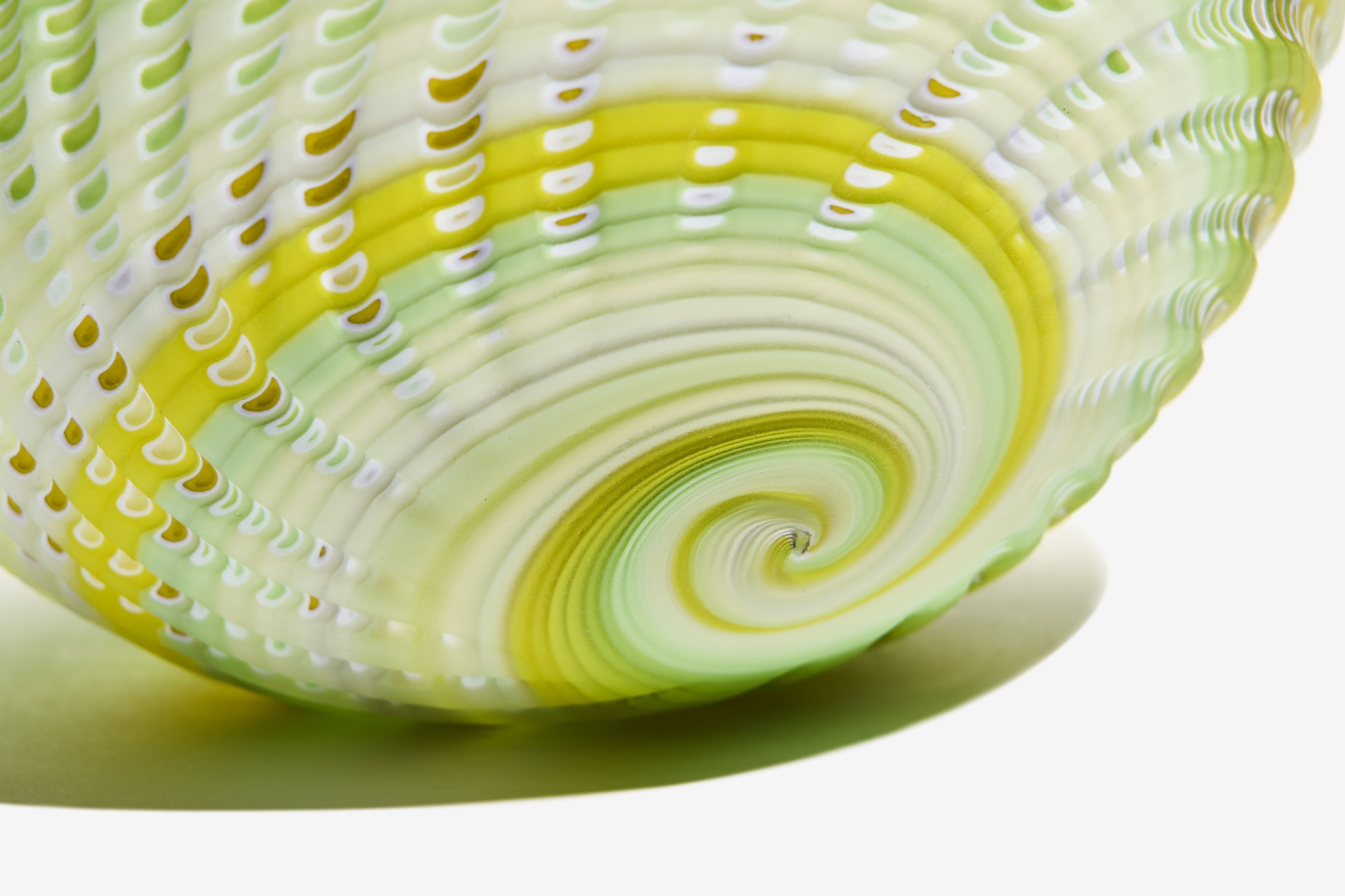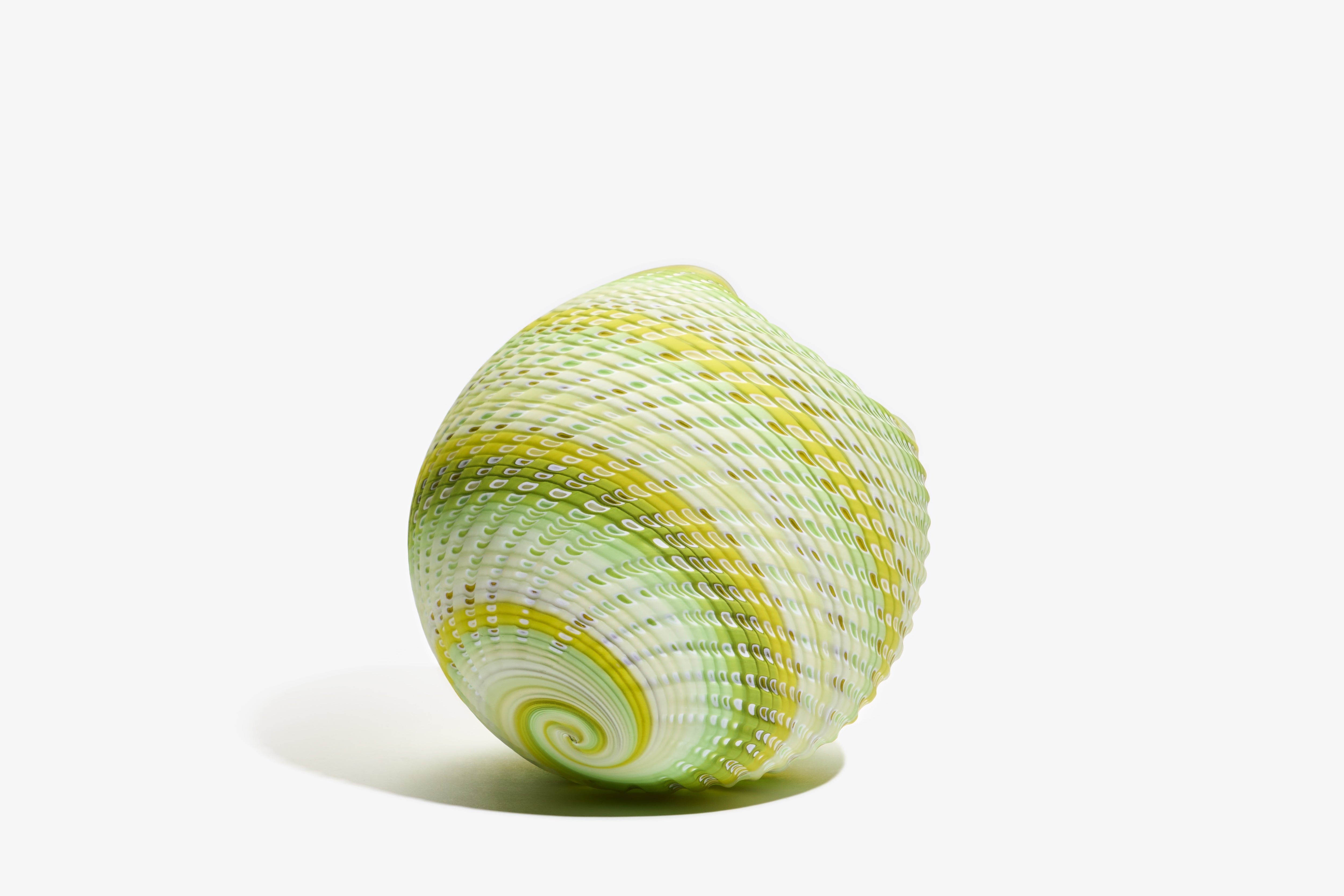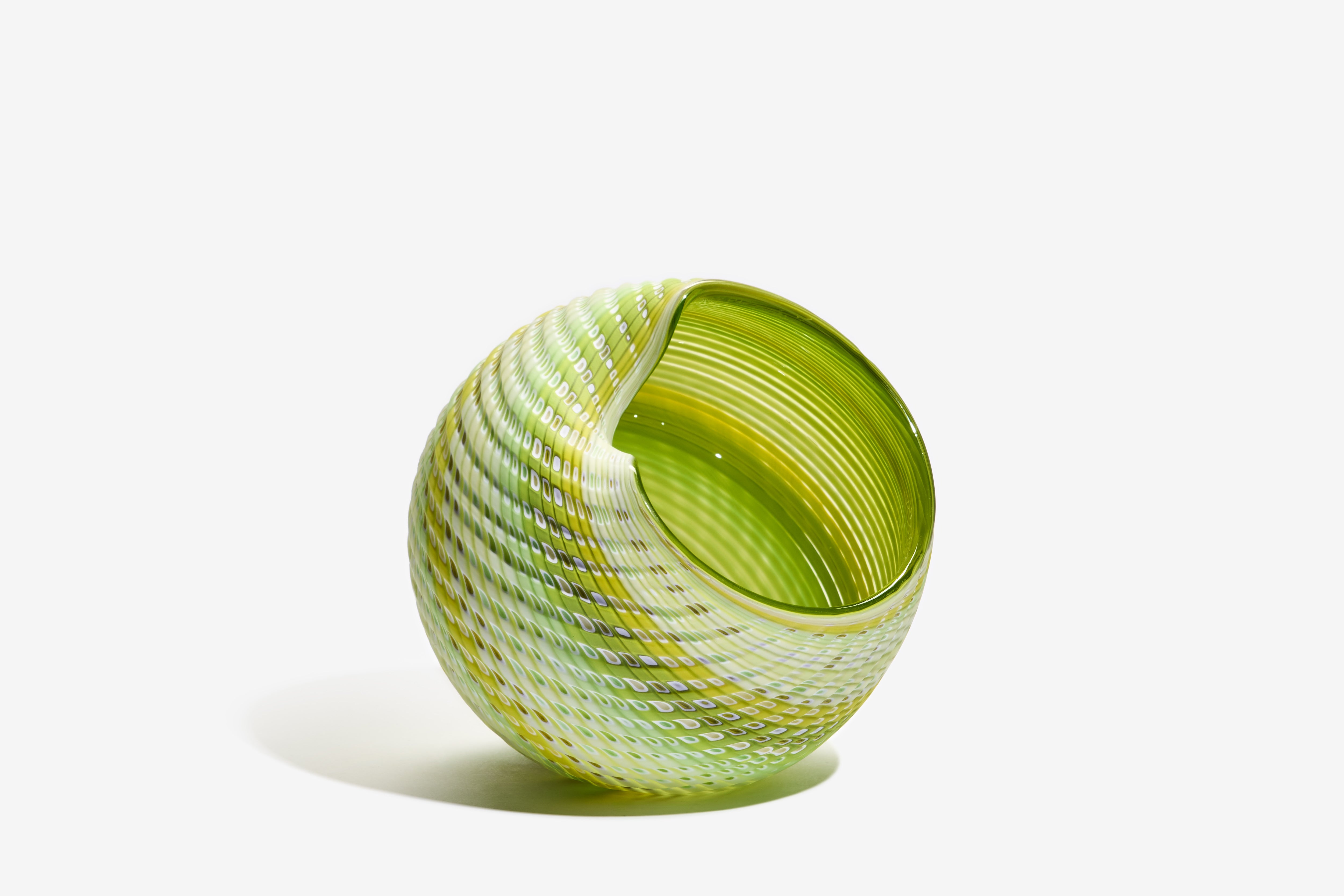 Layne’s Woven Forms are inspired by the Devon coastline and have been evolving for several years. This series of work is a result of intricate layering of different pre-made coloured canes around a molten form that is twisted and, when cold, cut into with a diamond wheel, to reveal vibrant colours beneath the surface. The effect is like water over precious stones or the rock with its glimmering colours beneath, reflecting natural growth and corrosion. Exclusively for Collect, Layne has introduced a new colourway in citron green.