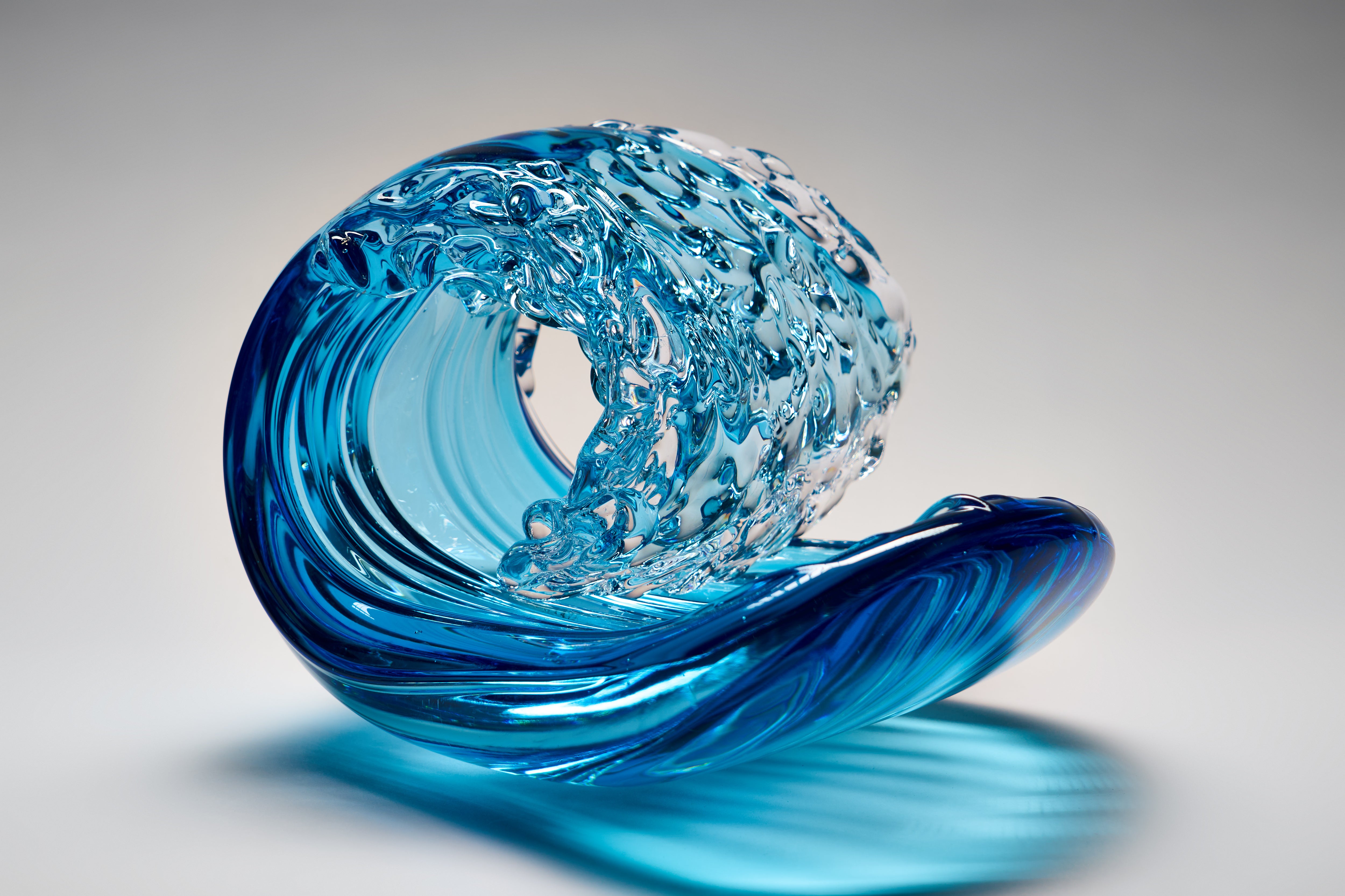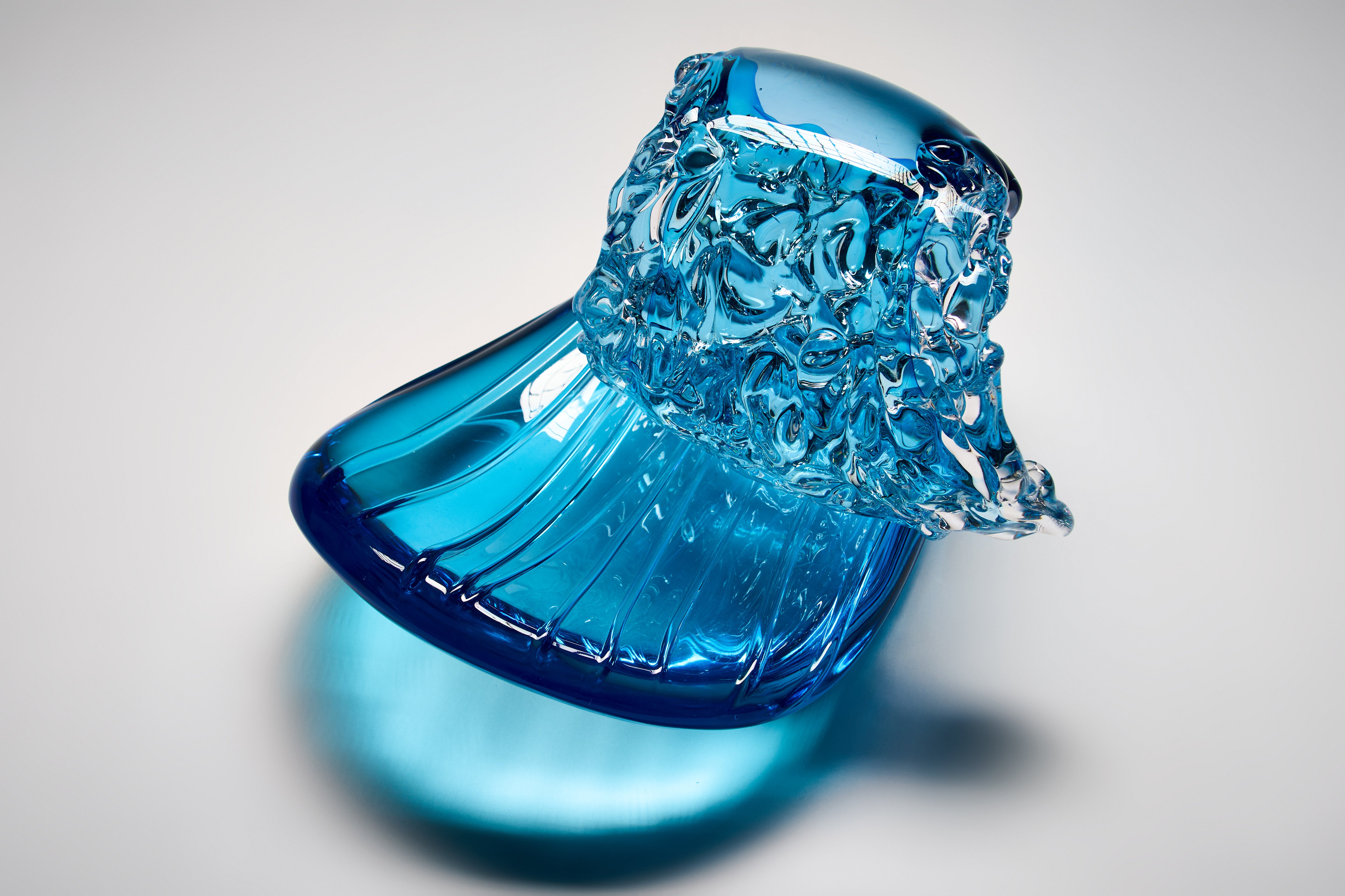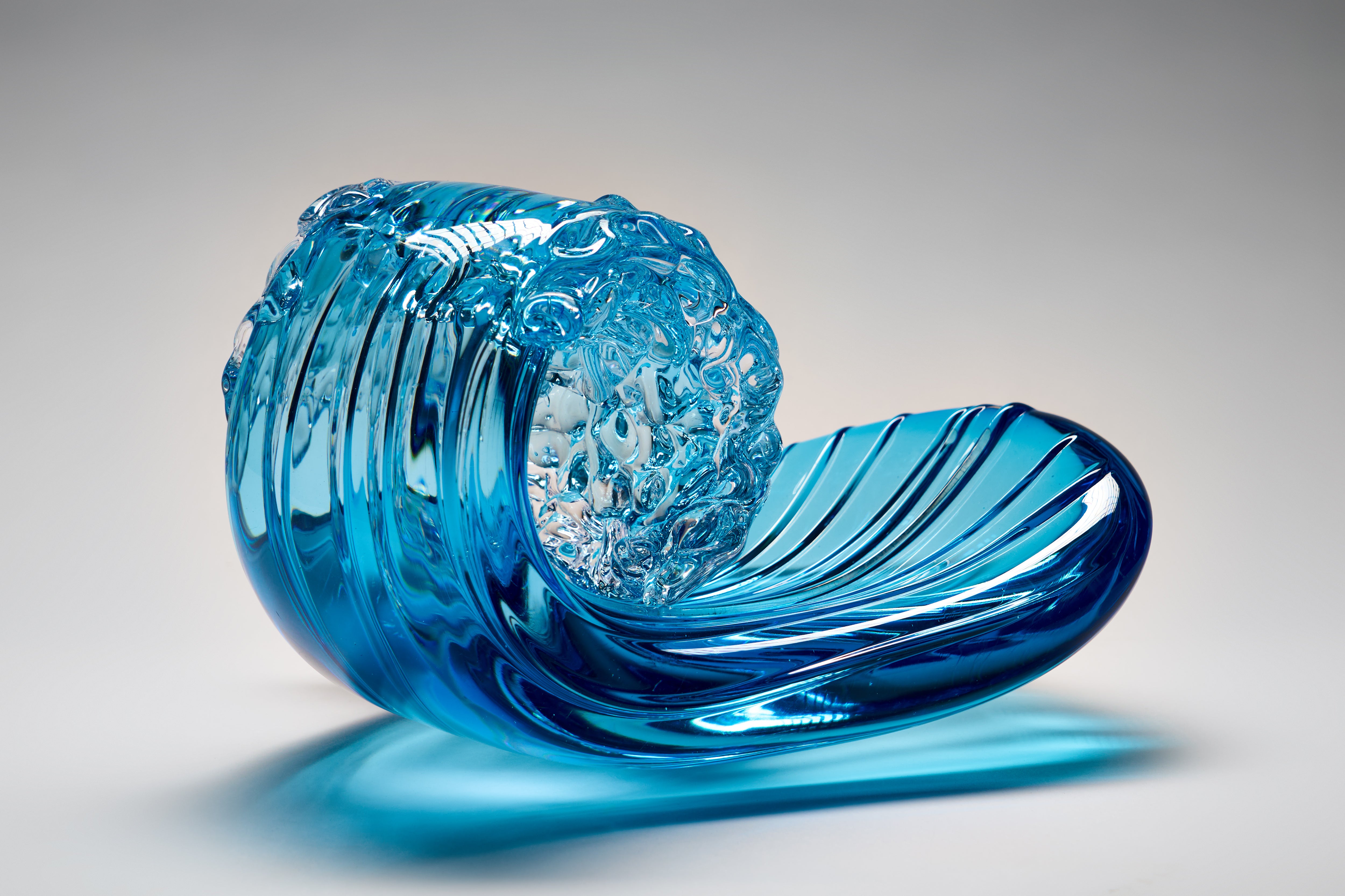 In pursuit of the expression of the essence of a wave in cresting motion, Peter’s original Hokusai-inspired Waves have evolved into more barrel-like forms, in delicate translucent colours. Some rest on bases, comprising individually hotworked elements, that reference the striations often left in the sand as the tide recedes from the beach.