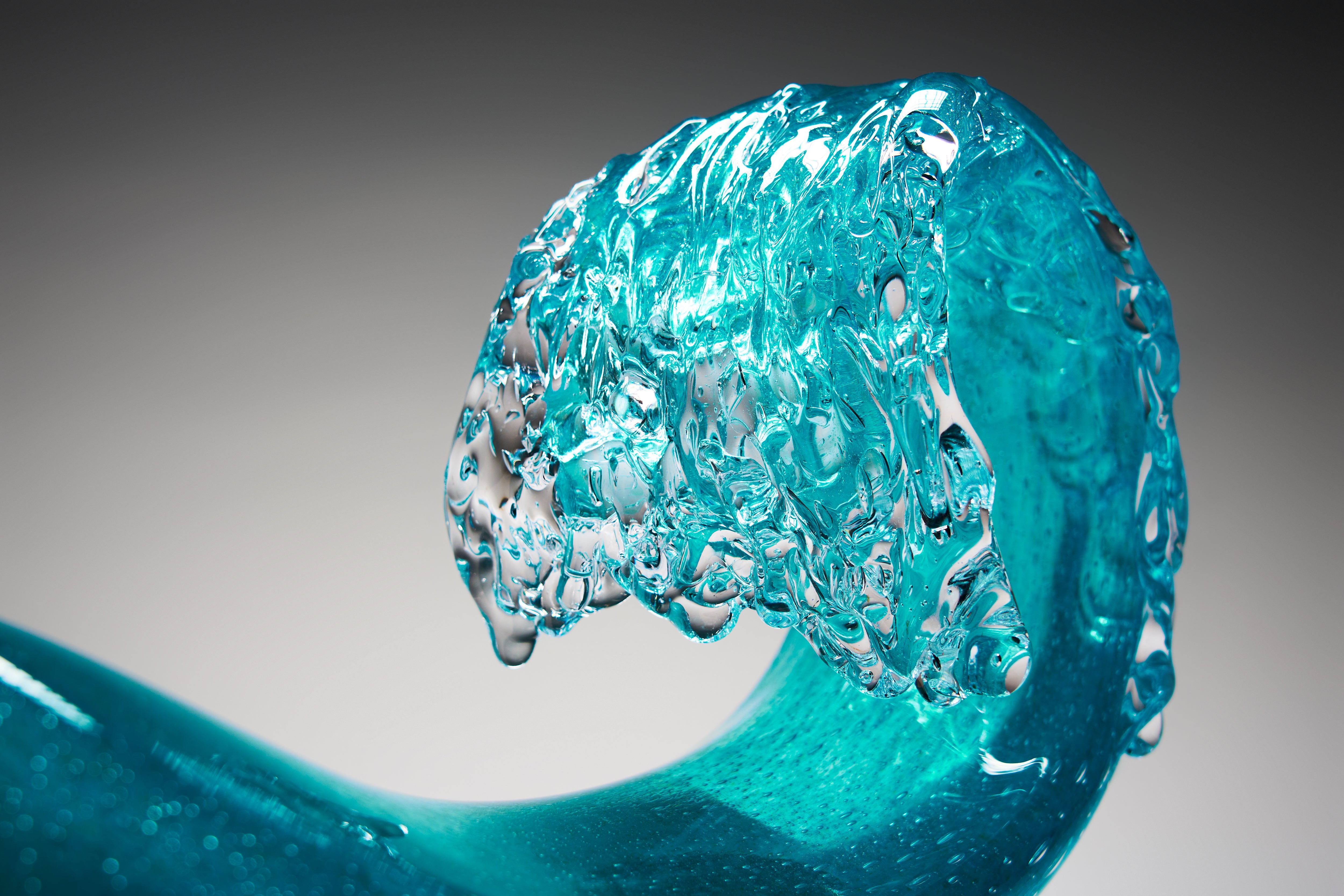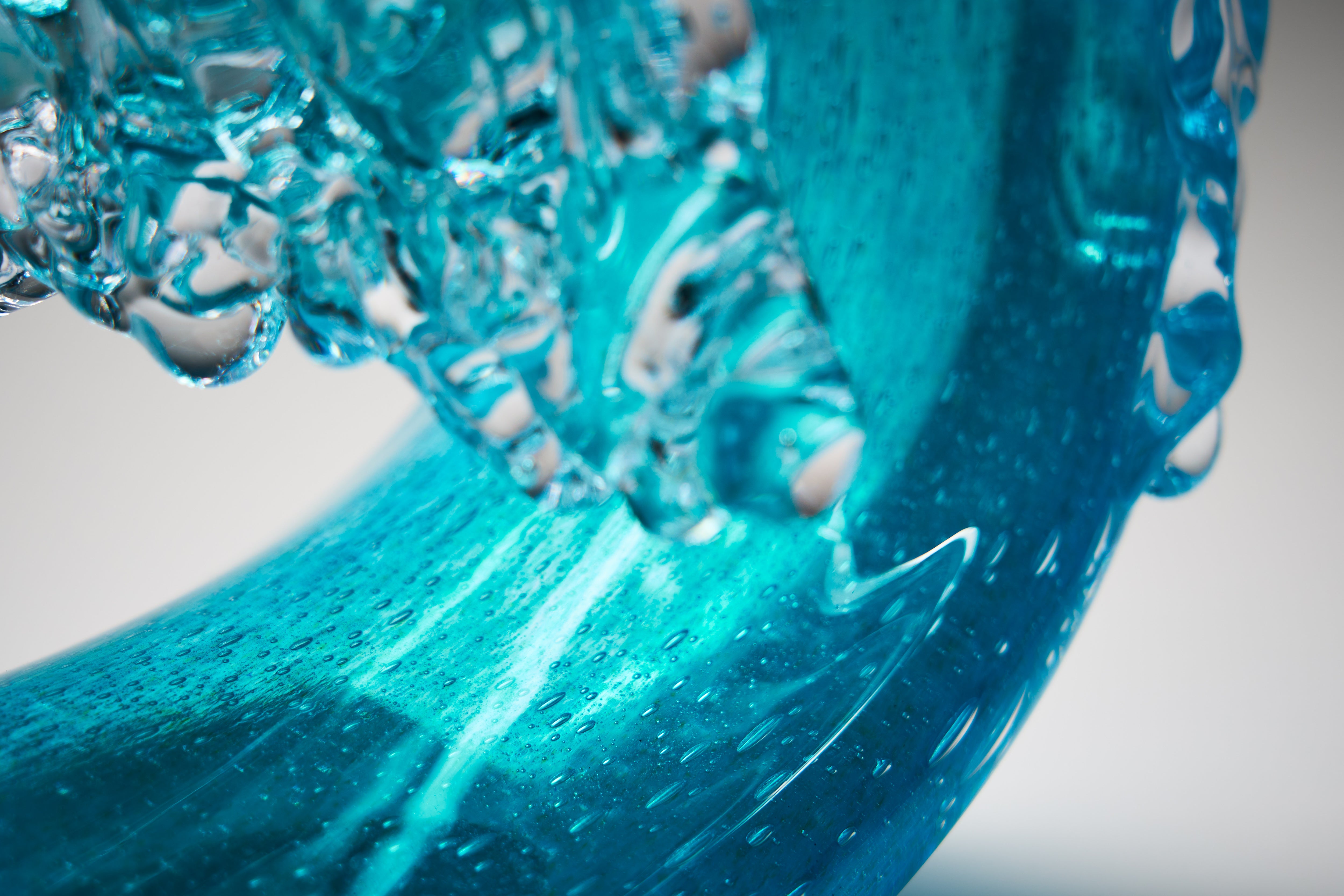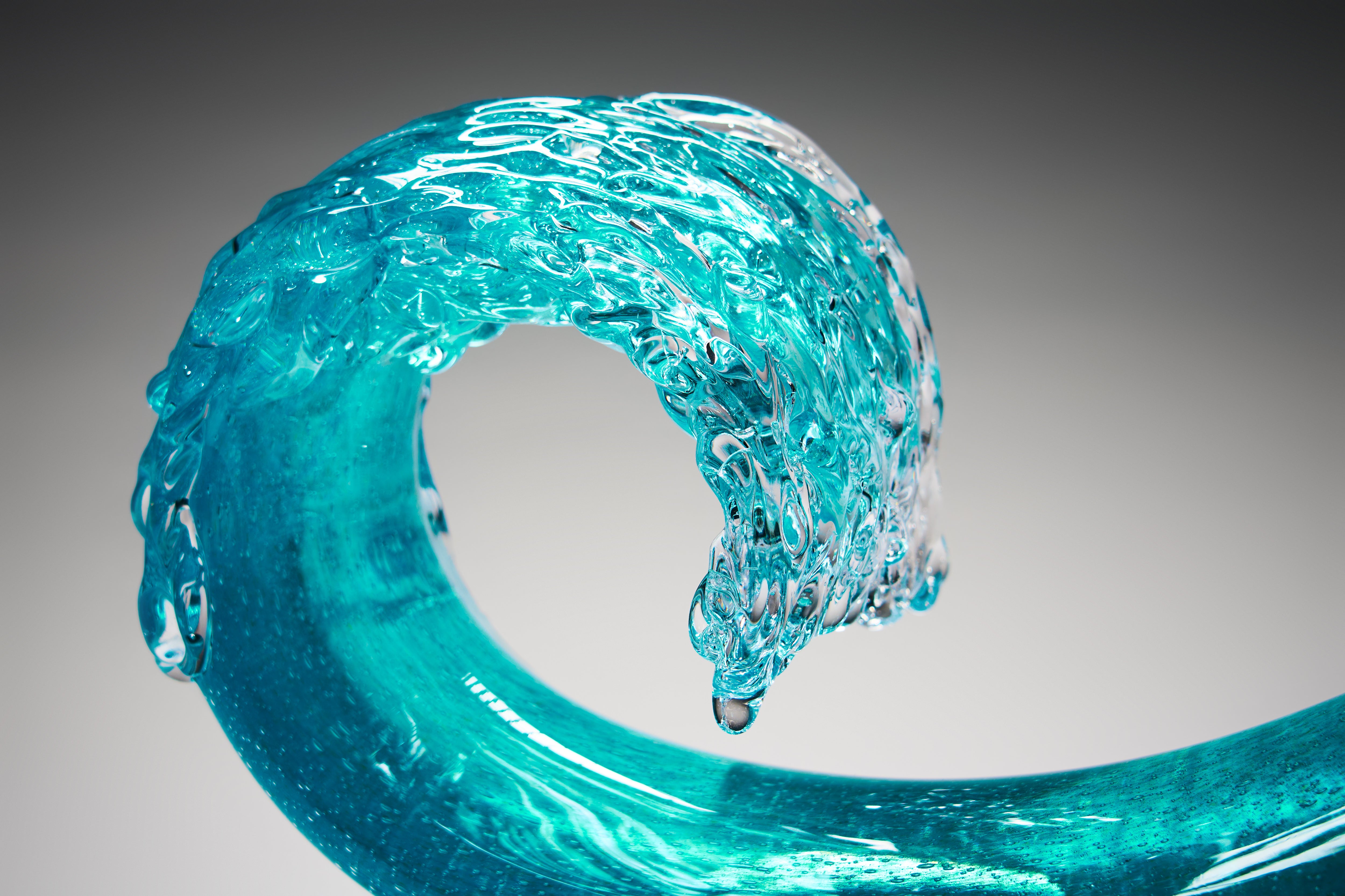 In pursuit of the expression of the essence of a wave in cresting motion, Peter’s original Hokusai-inspired Waves have evolved into more barrel-like forms, in delicate translucent colours. Some rest on bases, comprising individually hotworked elements, that reference the striations often left in the sand as the tide recedes from the beach.