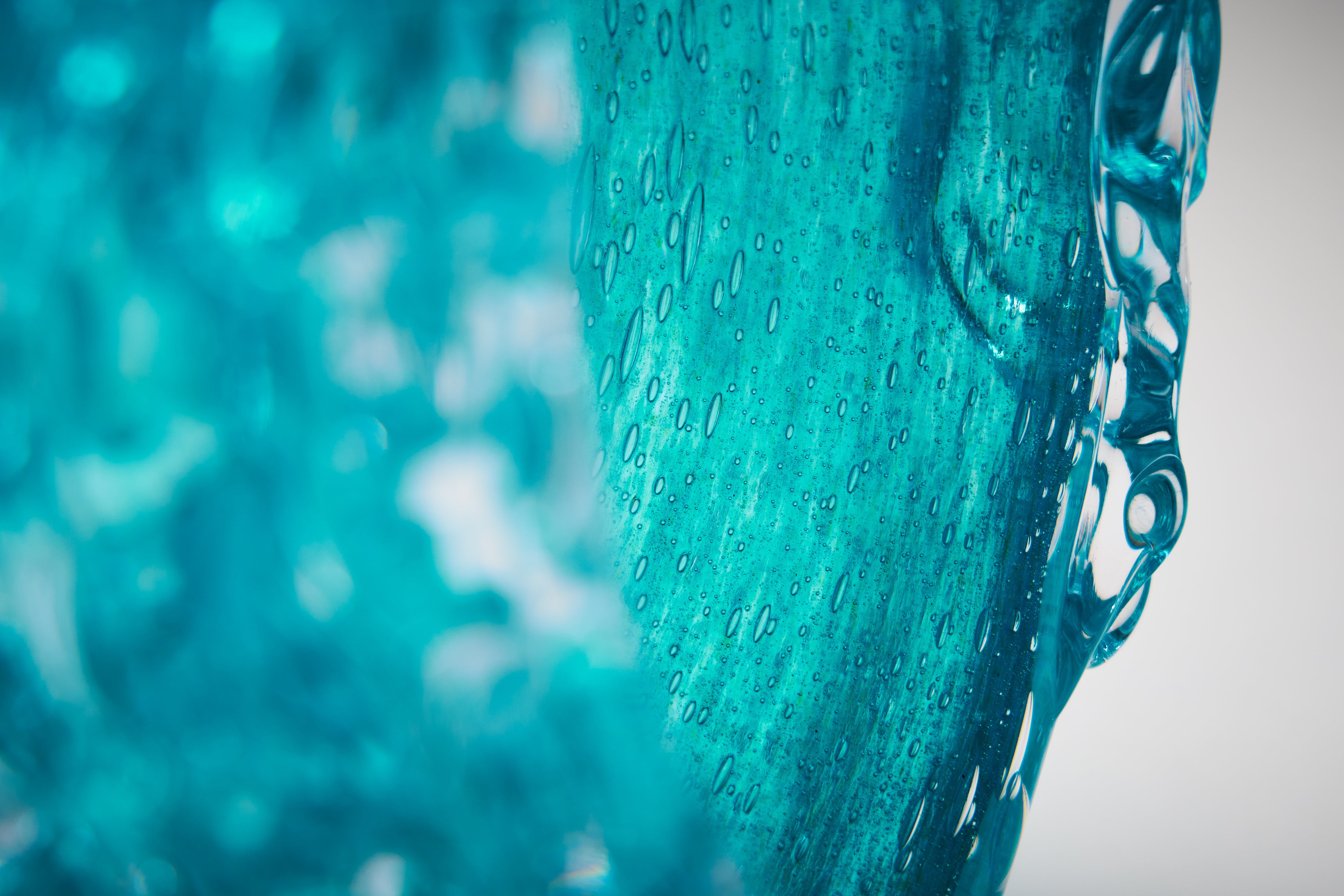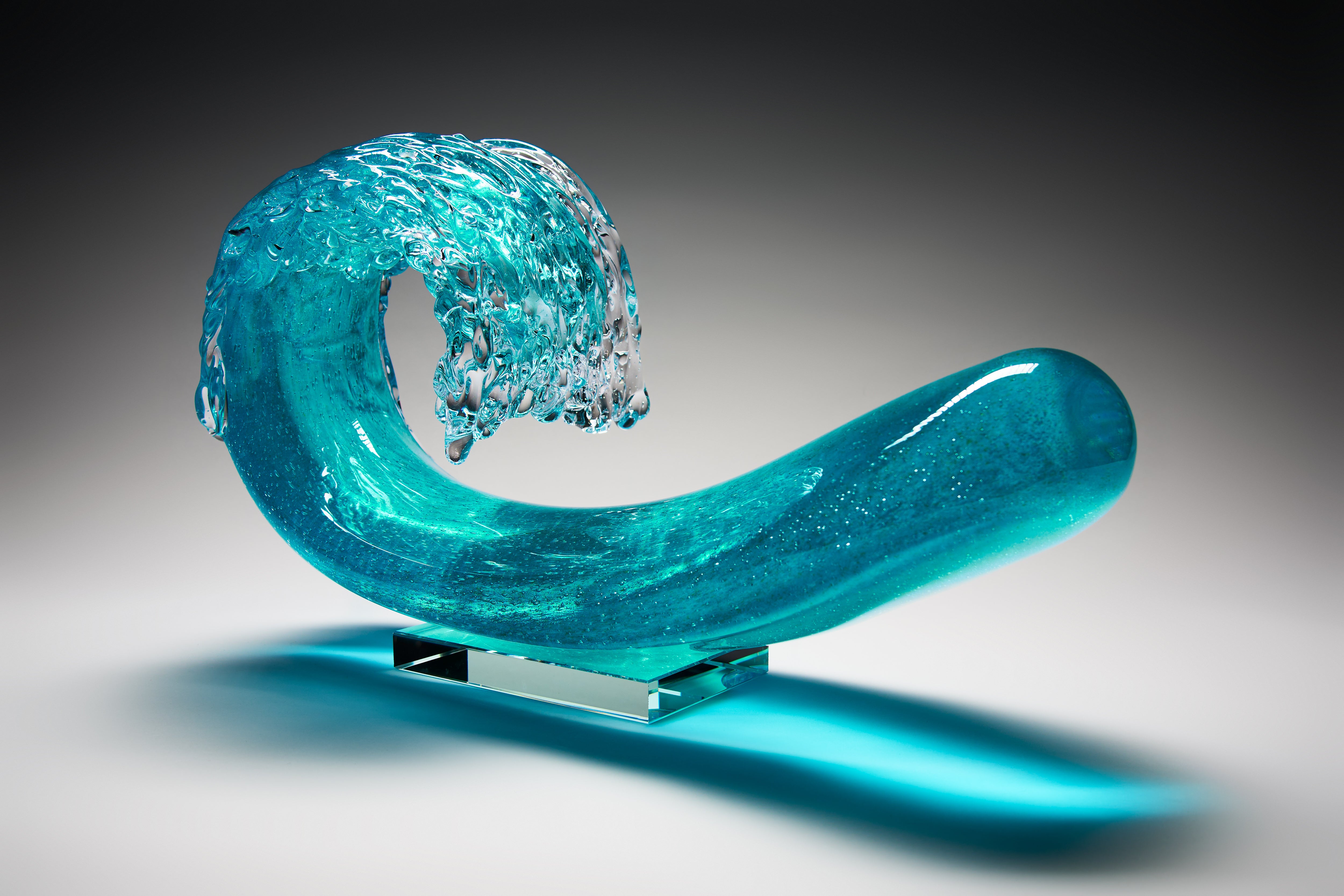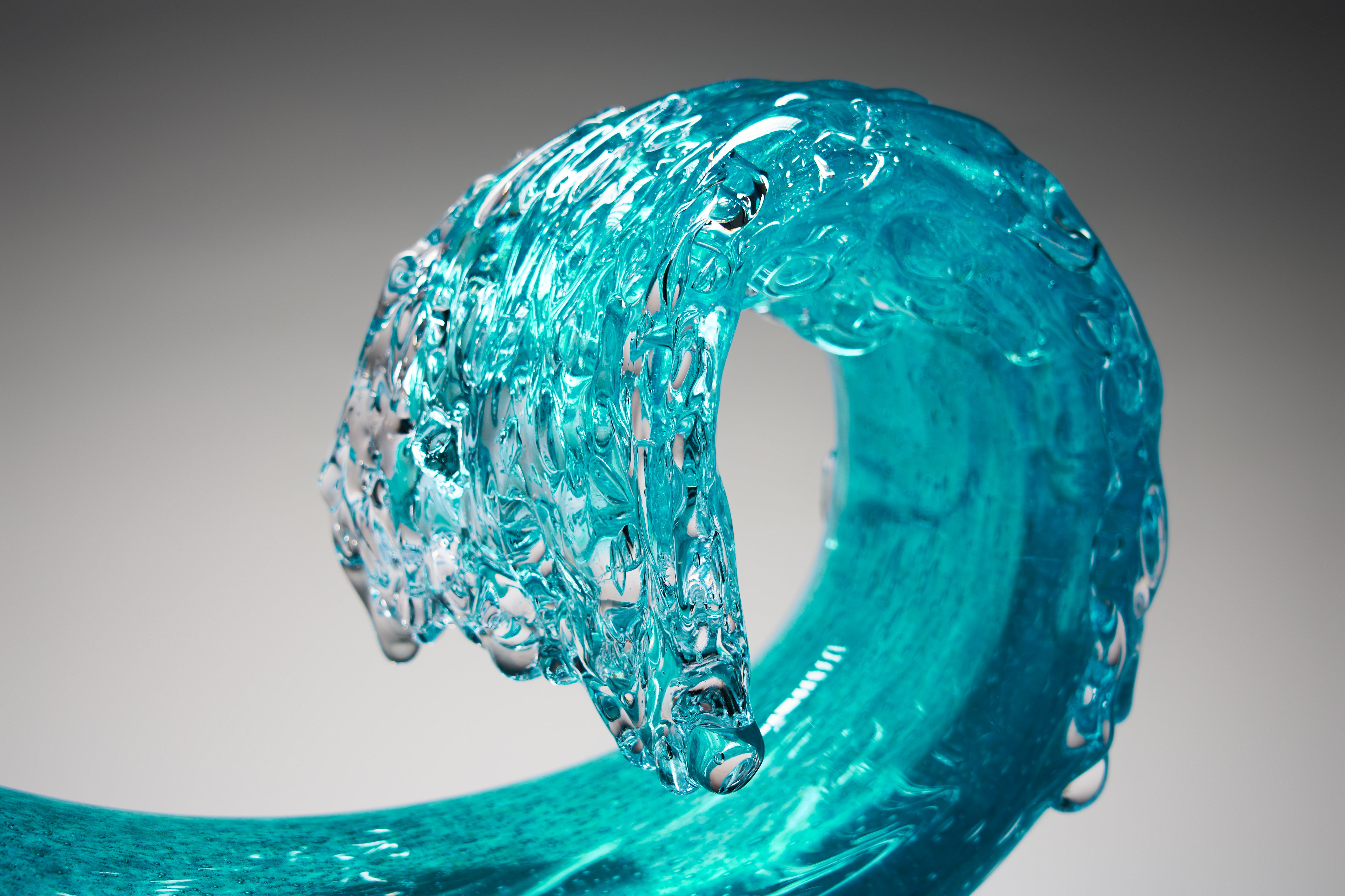 In pursuit of the expression of the essence of a wave in cresting motion, Peter’s original Hokusai-inspired Waves have evolved into more barrel-like forms, in delicate translucent colours. Some rest on bases, comprising individually hotworked elements, that reference the striations often left in the sand as the tide recedes from the beach.