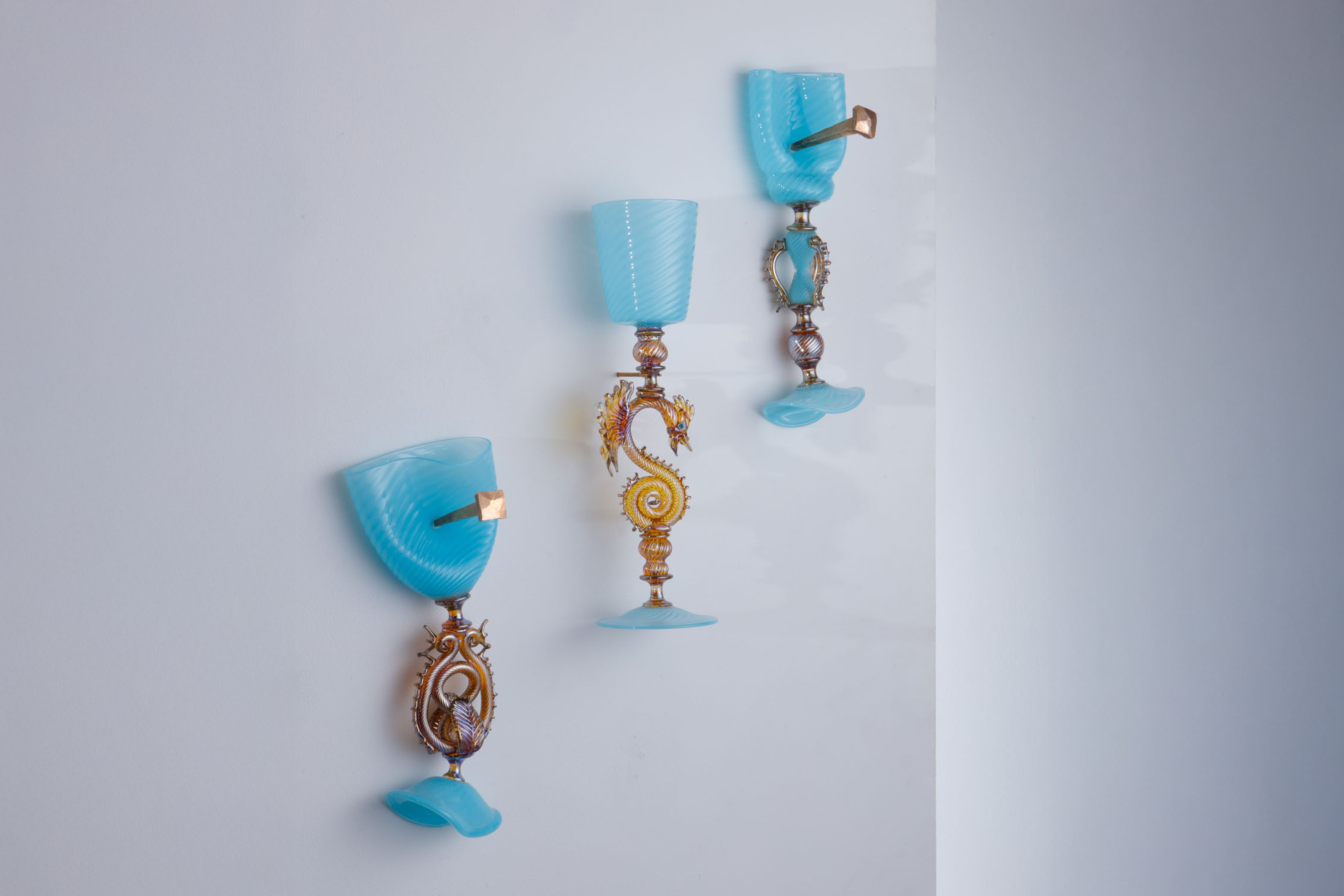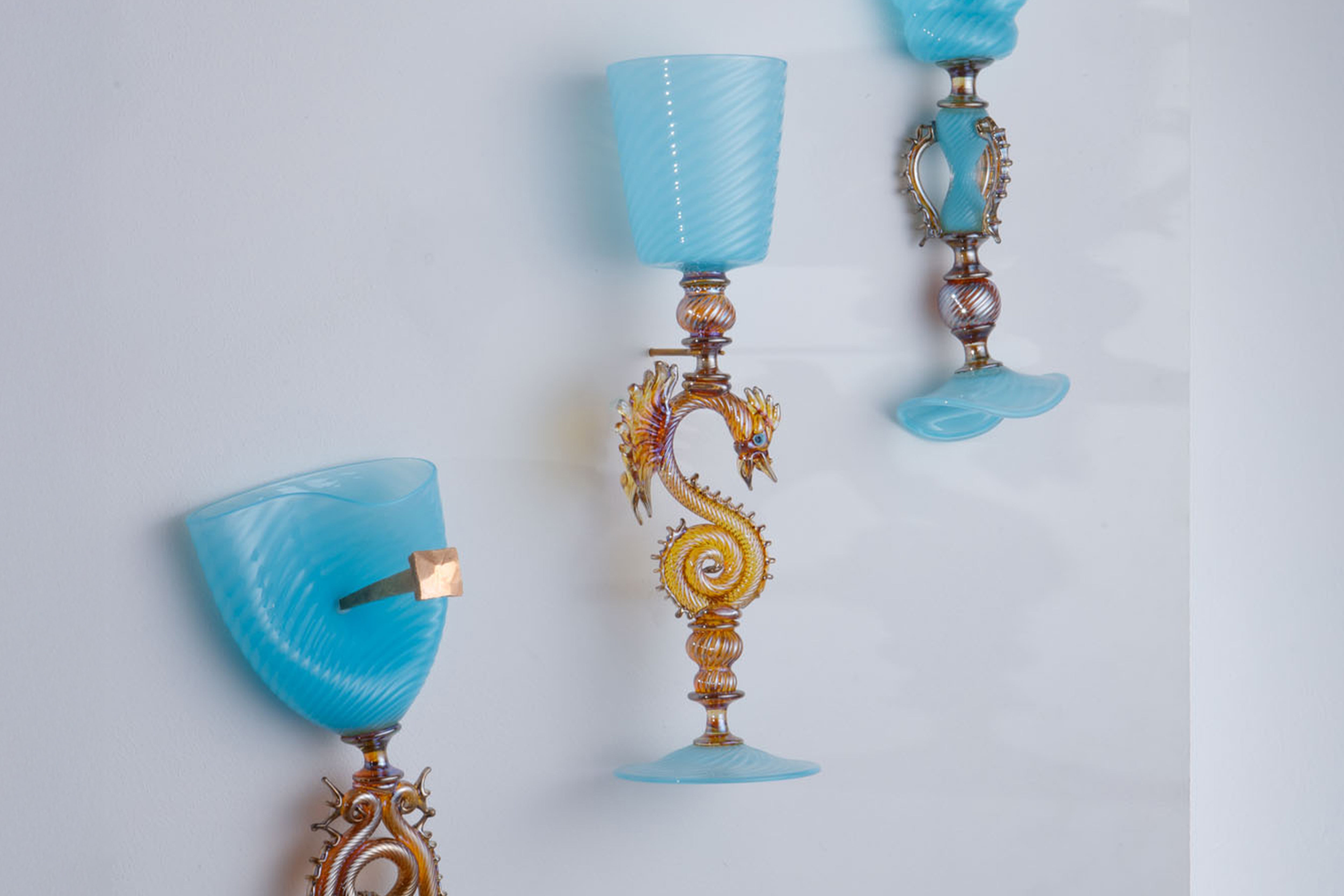 These Venetian-inspired goblets demand immense precision and control, yet are presented in a way that removes their purpose as vessels. Some iterations incorporate historical “trick” goblets - ingeniously engineered to spill or conceal hidden spouts - further destabilising their utility. By interrupting their function, Elliot challenges glass’s historic ties to use, transforming highly refined craft into something conceptual and deliberately irreverent.